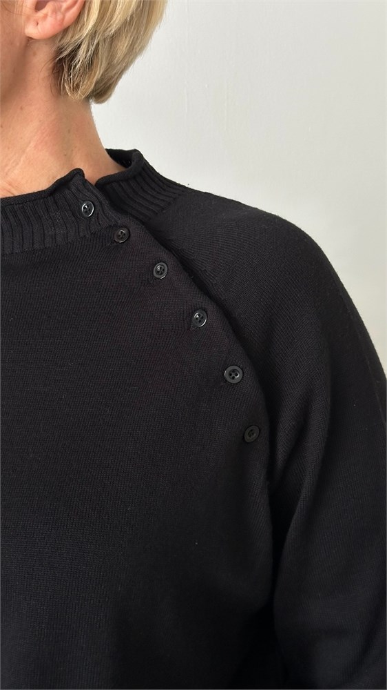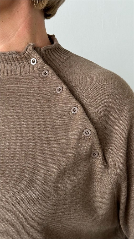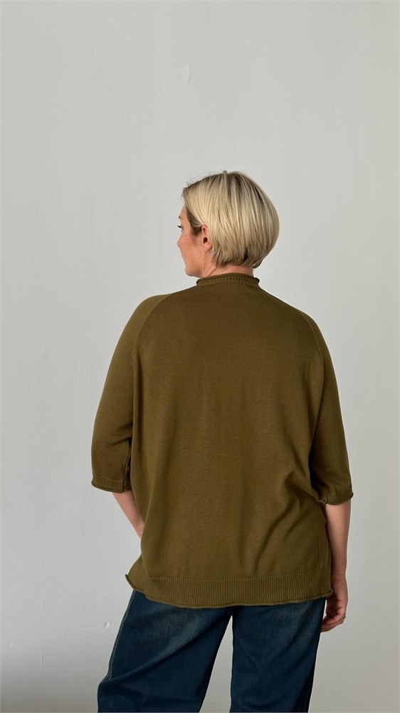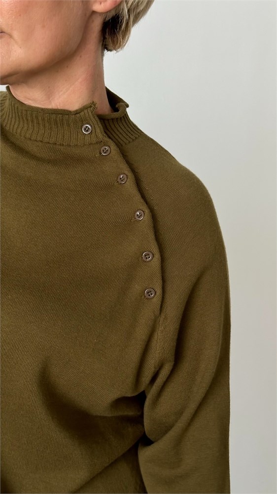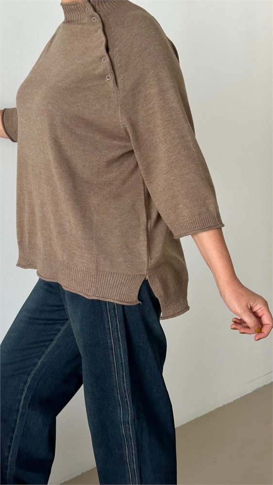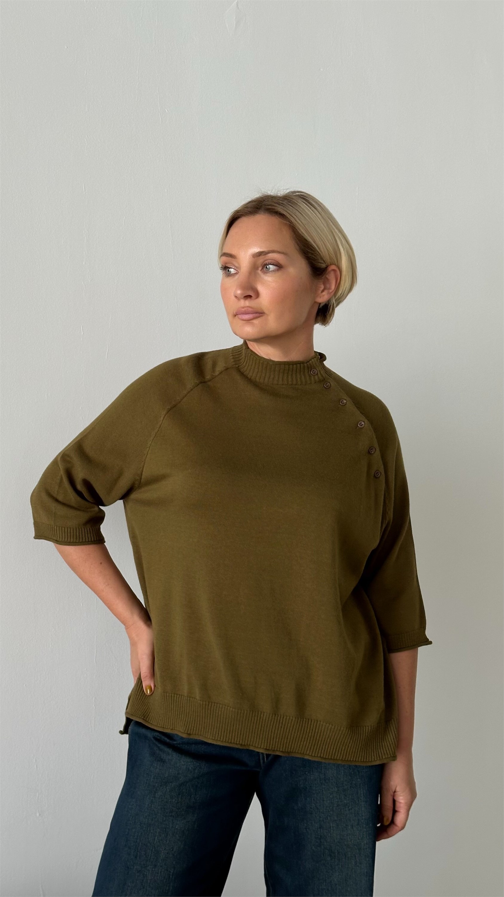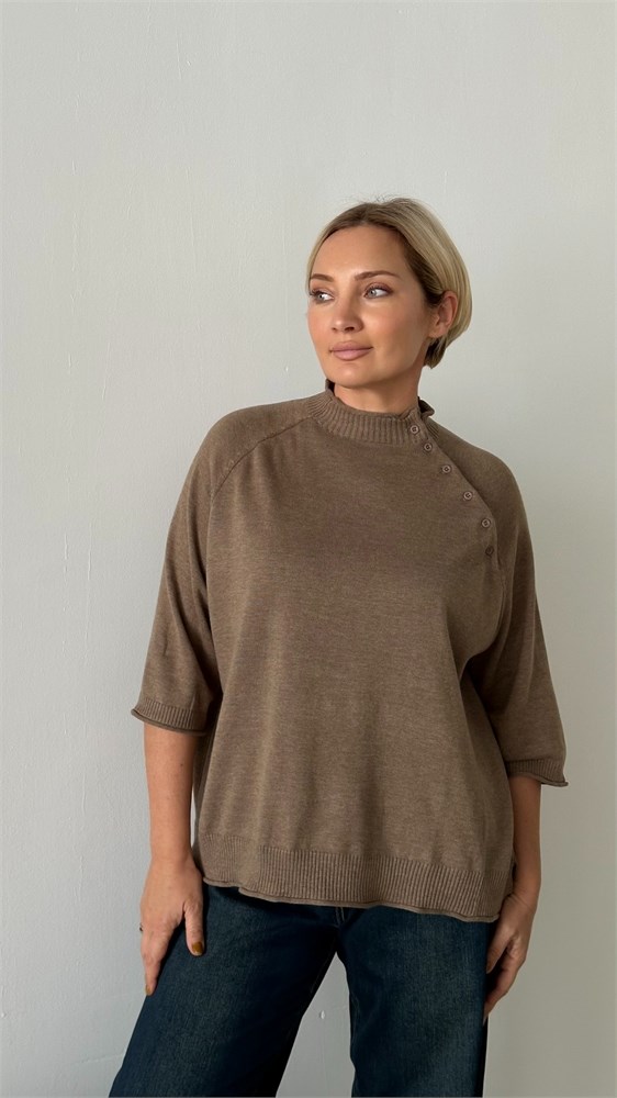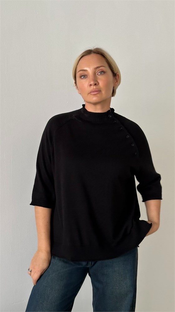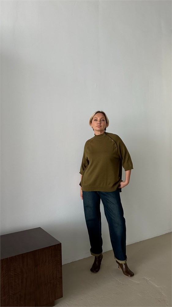 Стильный и женственный джемпер из мягкого трикотажа станет эффектным элементом вашего гардероба. Модель выполнена с рукавом реглан длиной три четверти, украшенным декоративными пуговицами вдоль шва втачивания рукава — изящный акцент, придающий образу индивидуальность. Воротник-стойка добавляет элегантности и защищает от прохлады, а эластичная отделка по низу изделия обеспечивает комфортную посадку. Джемпер легко комбинируется с джинсами, юбками и классическими брюками — отличный выбор как для повседневной носки, так и для более нарядных образов.Модель имеет размер Free size. Представлена в 3 расцветках- базовый черный,кофейное печенье, спелая оливка.