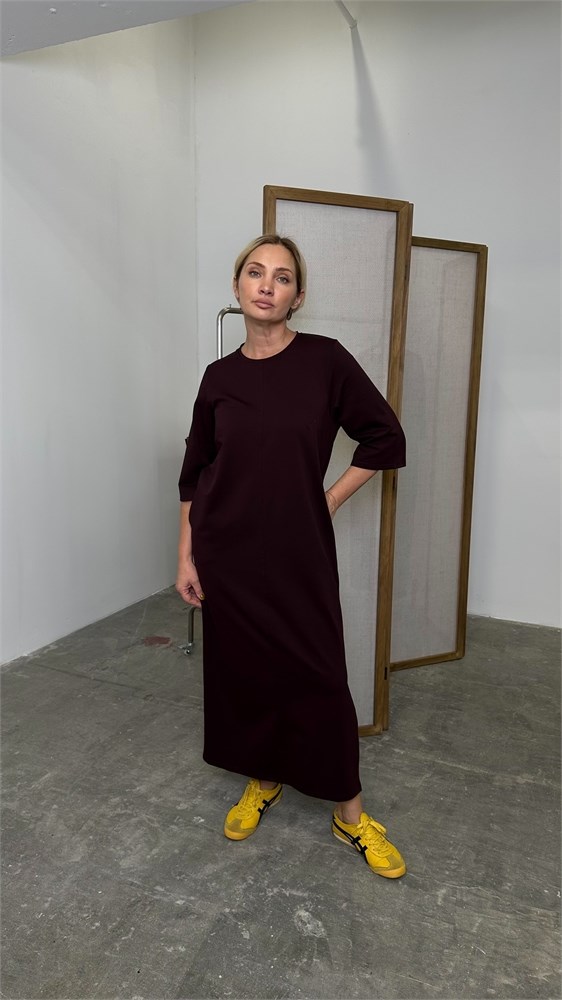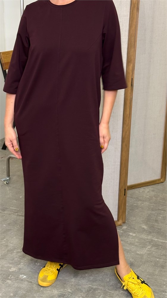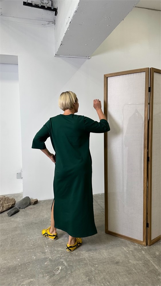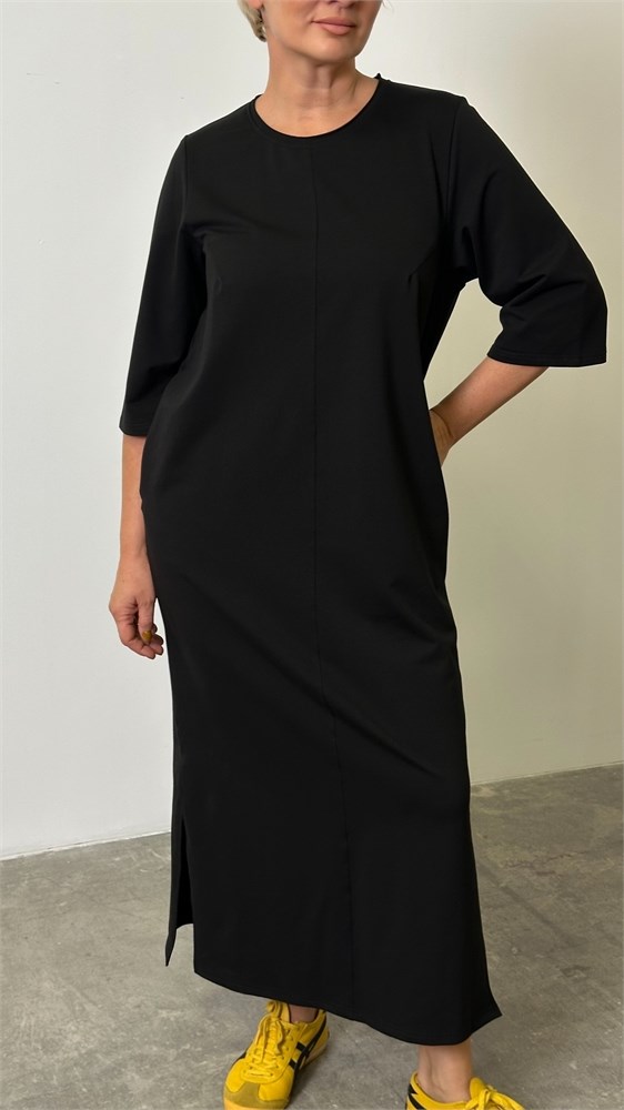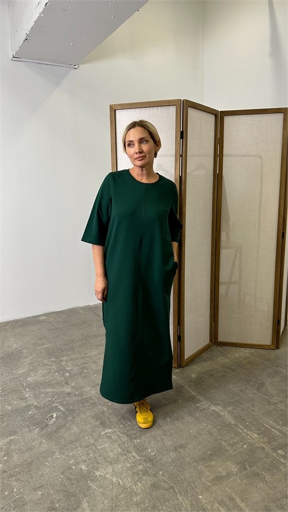 Это стильное платье из хлопкового трикотажа в полуспортивном стиле, идеально сочетающее комфорт и современный дизайн. Длина ниже колена придает образу элегантность, а по бокам расположены разрезы, добавляющие динамичности и свободы движений. Рукав закрывает линию локтя, создавая аккуратный и завершенный силуэт. По центру платья проходит декоративный шов, который подчеркивает структуру изделия и придает ему оригинальность. Такое платье отлично подойдет для повседневных прогулок, активного отдыха или casual-образа с нотками спортивного стиля.Размерная линейка от 44 до 54.Модель представлена в трех расцветках-базовый черный, цвете инжир и изумрудный.