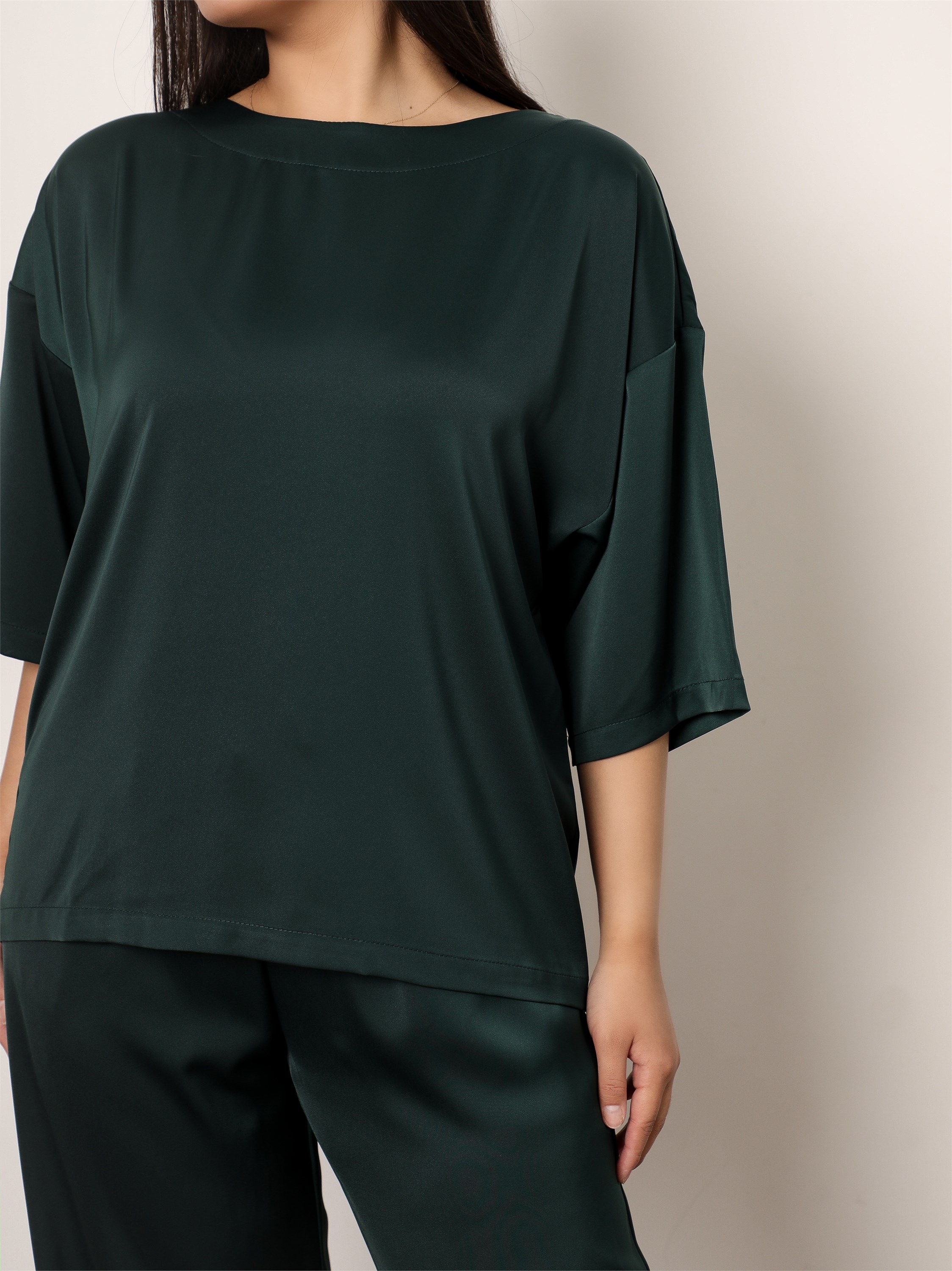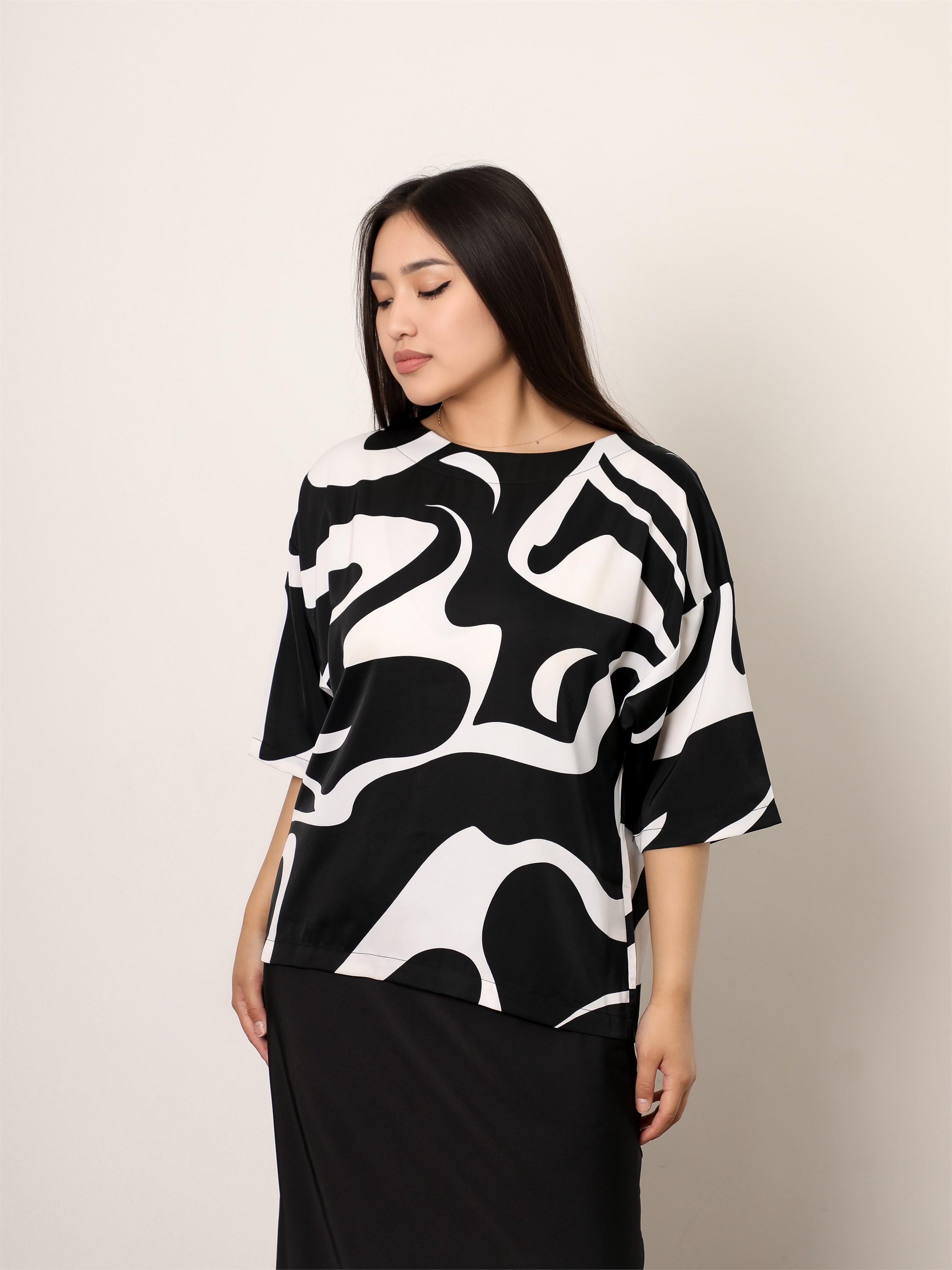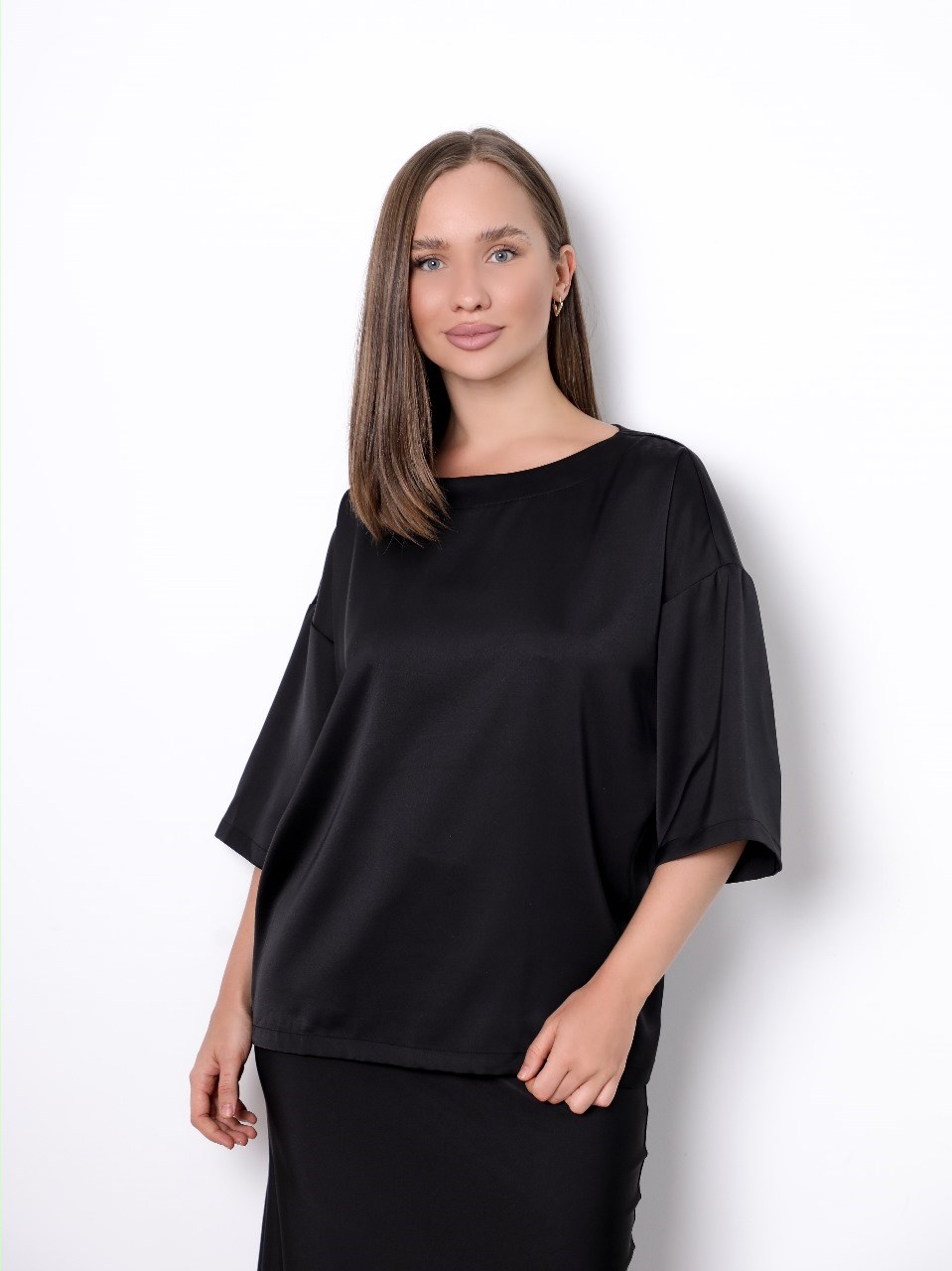 Блуза свободного кроя со спущенным рукавом. Вырез горловины круглый, длина до середины бедер.