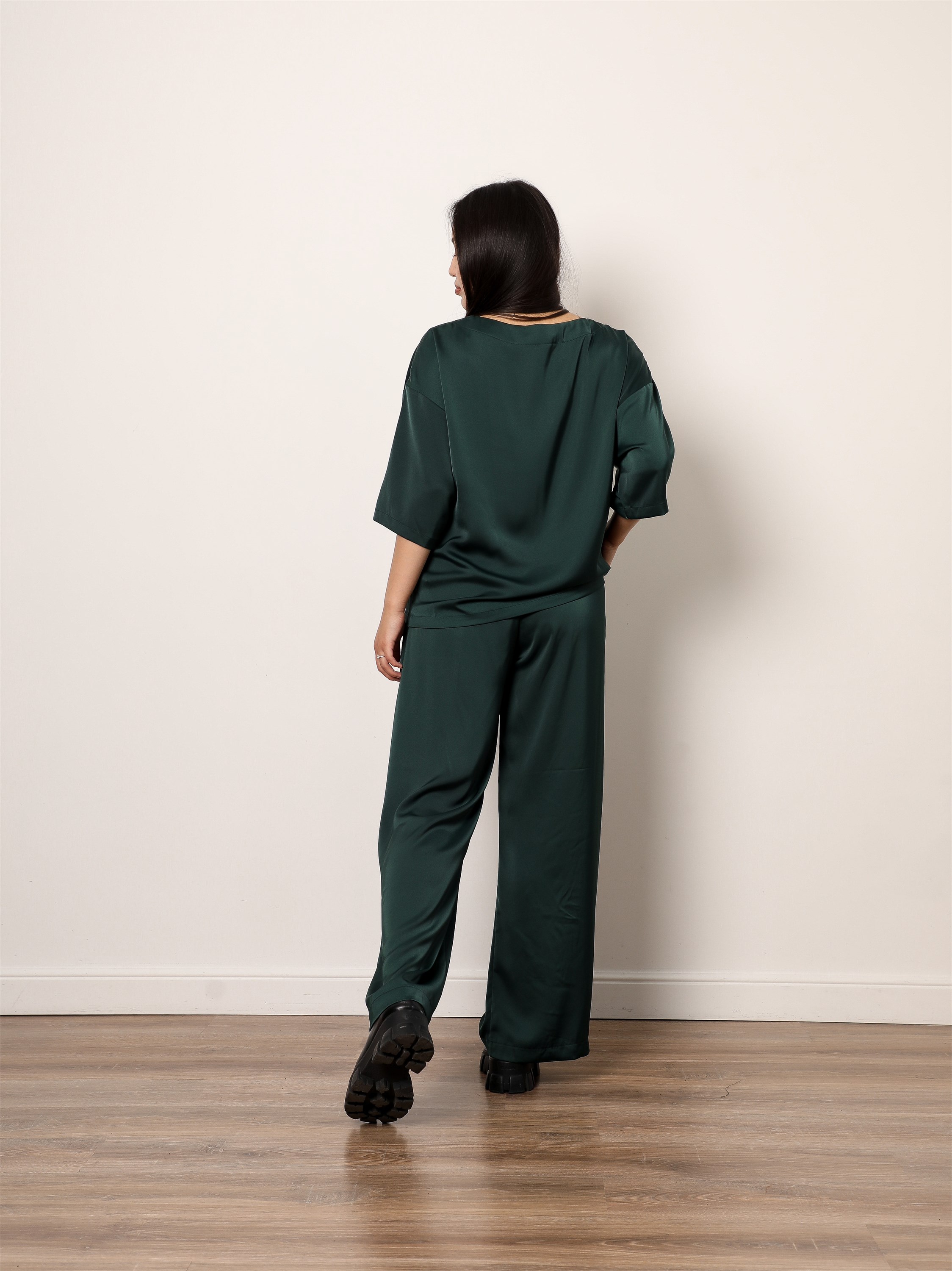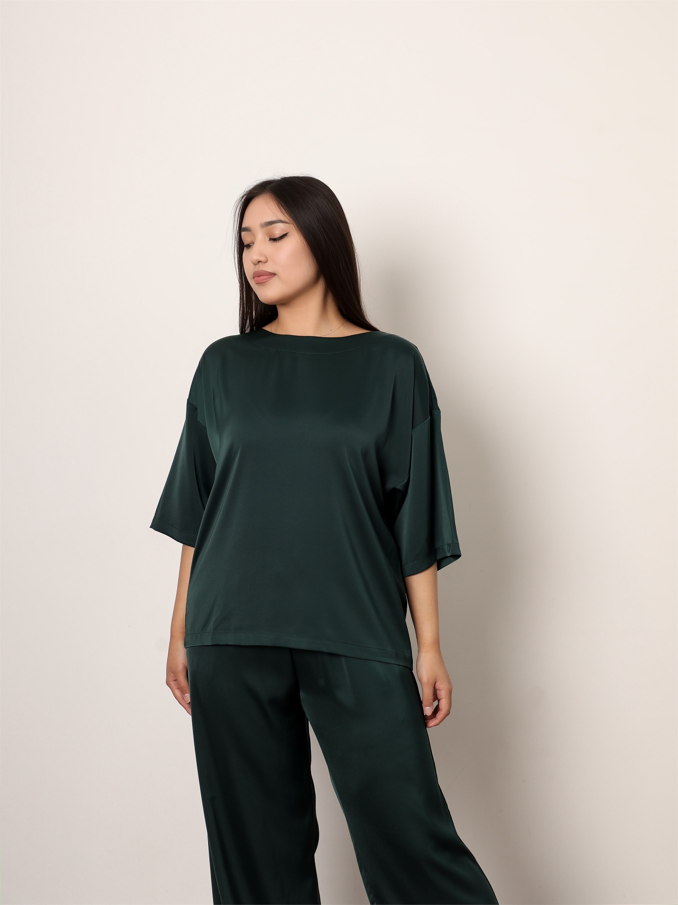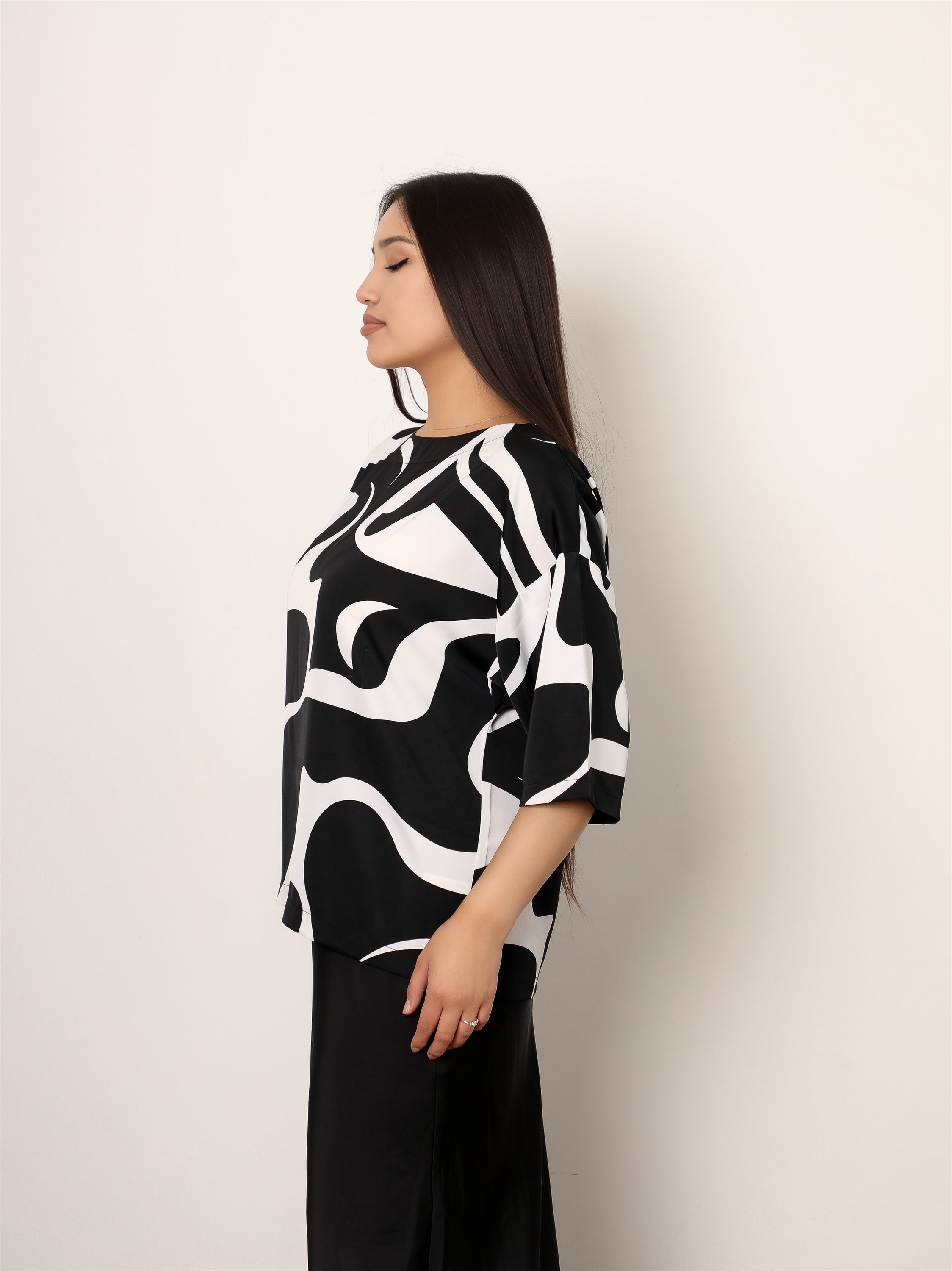 Блуза свободного кроя со спущенным рукавом. Вырез горловины круглый, длина до середины бедер.