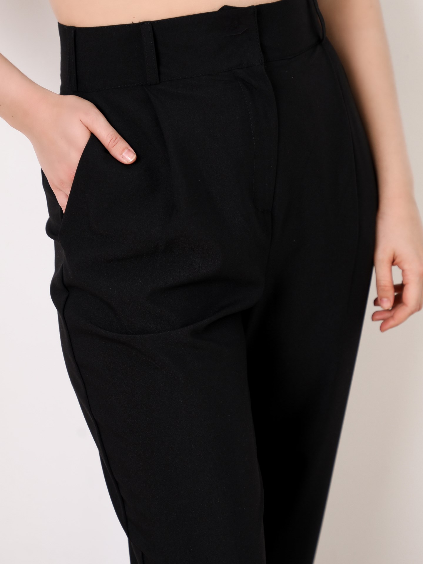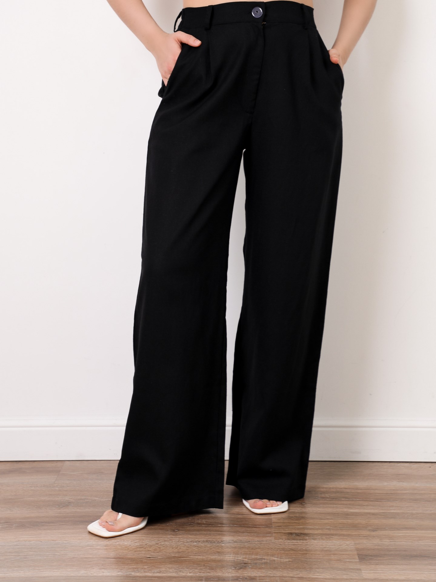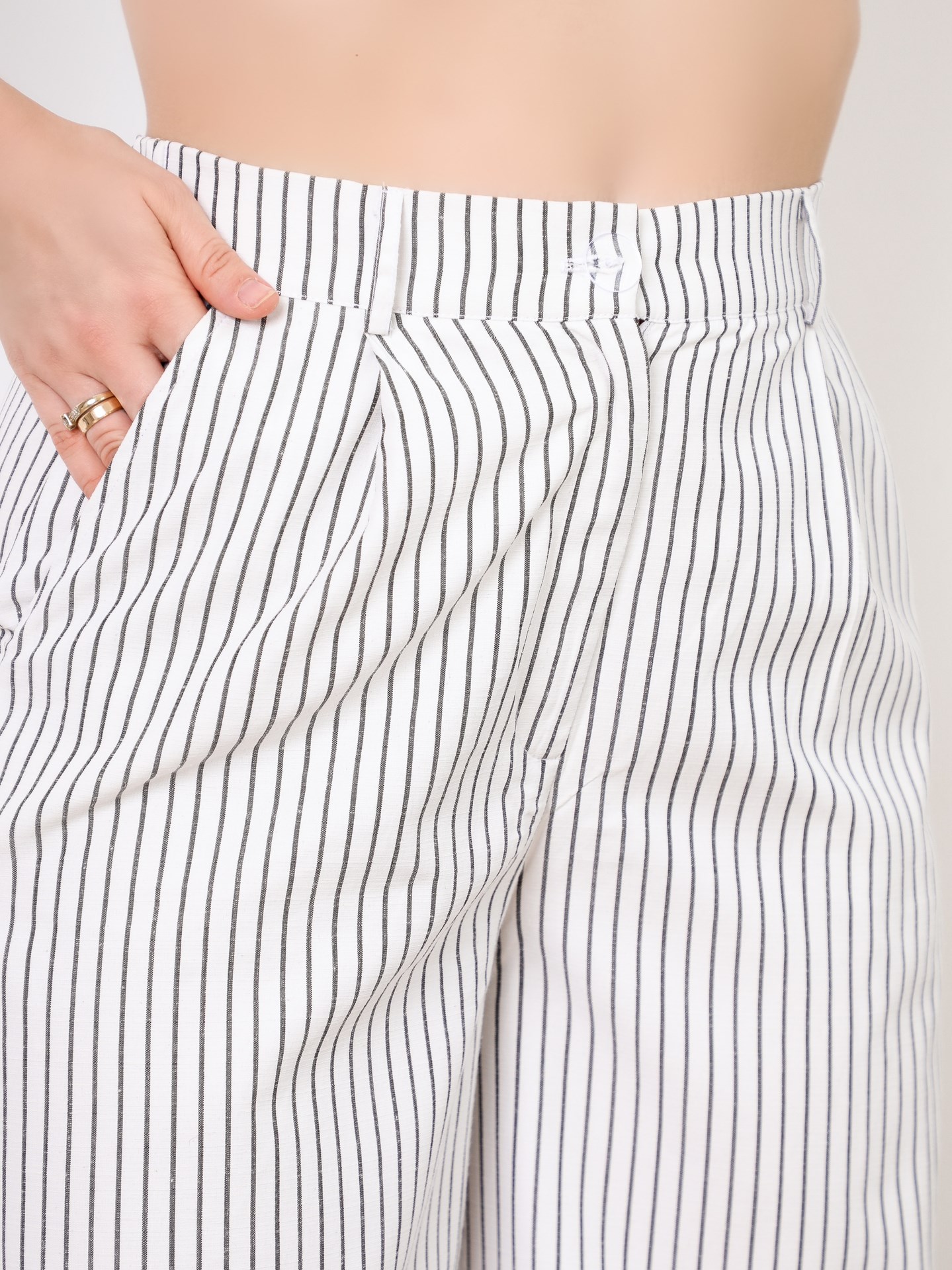Брюки полной длины изо льна свободного кроя. Высокая посадка с функциональными застежками на пуговице и молнии "гульфик". На передней половине брюк присутствуют защипы обеспечающие свободу движения в области беред, также есть функциональные карманы в шве