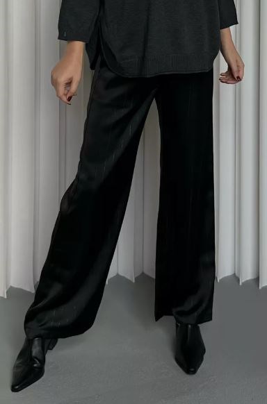 Шелковые брюки свободного силуэта в тонкую вертикальную полоску "люрикс" гармонично впишутся в большинство известных и популярных стилей, освежая образ и добавляя «луку» оригинальности, утонченности,шарма. Модель имеет притачной пояс на резинке, карманы в боковом шве.Модель представлена в черном цвете с тонкой вертикальной полосой серебристого цвета.Размерная линейка от 44 до 54 р.