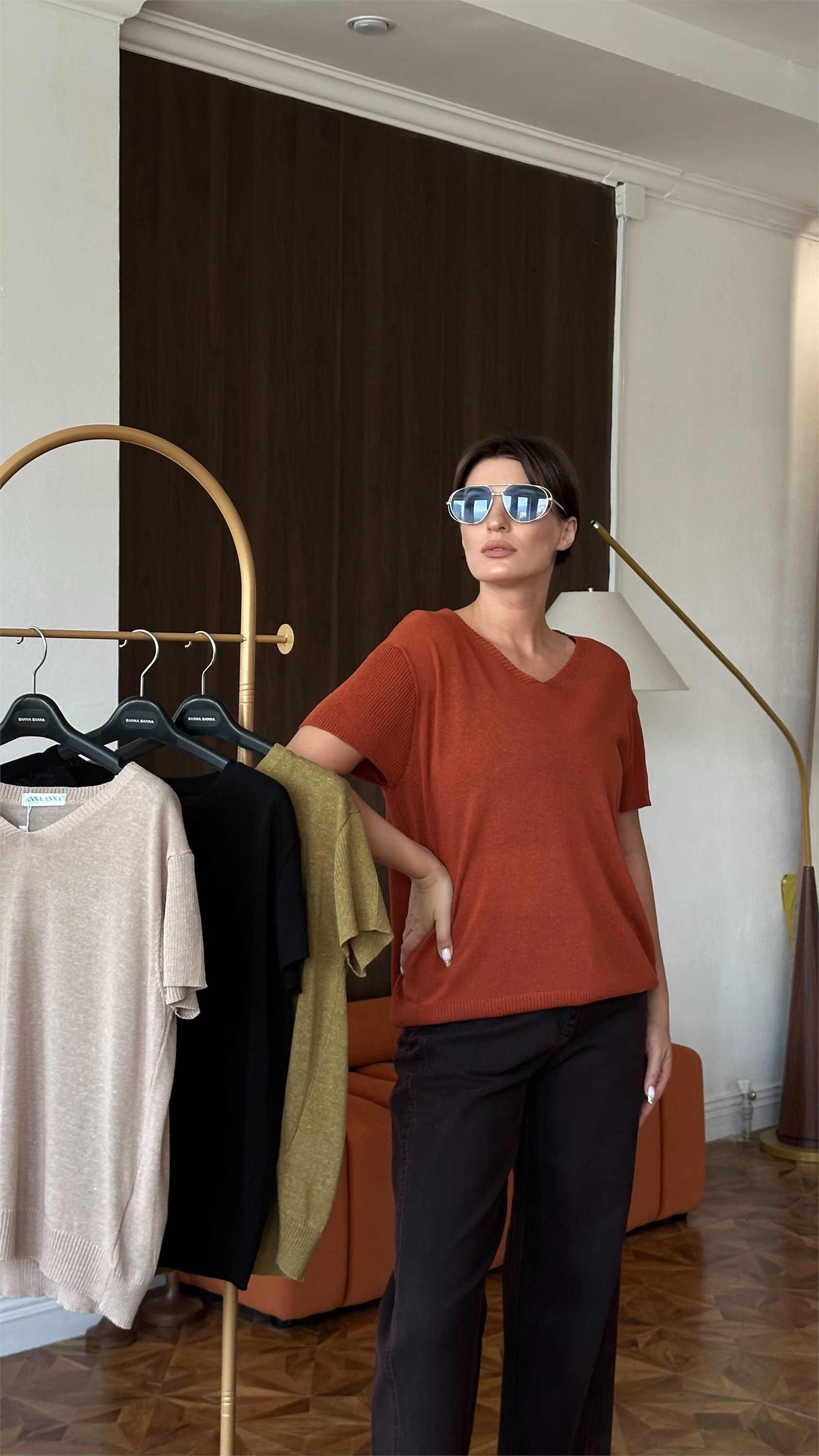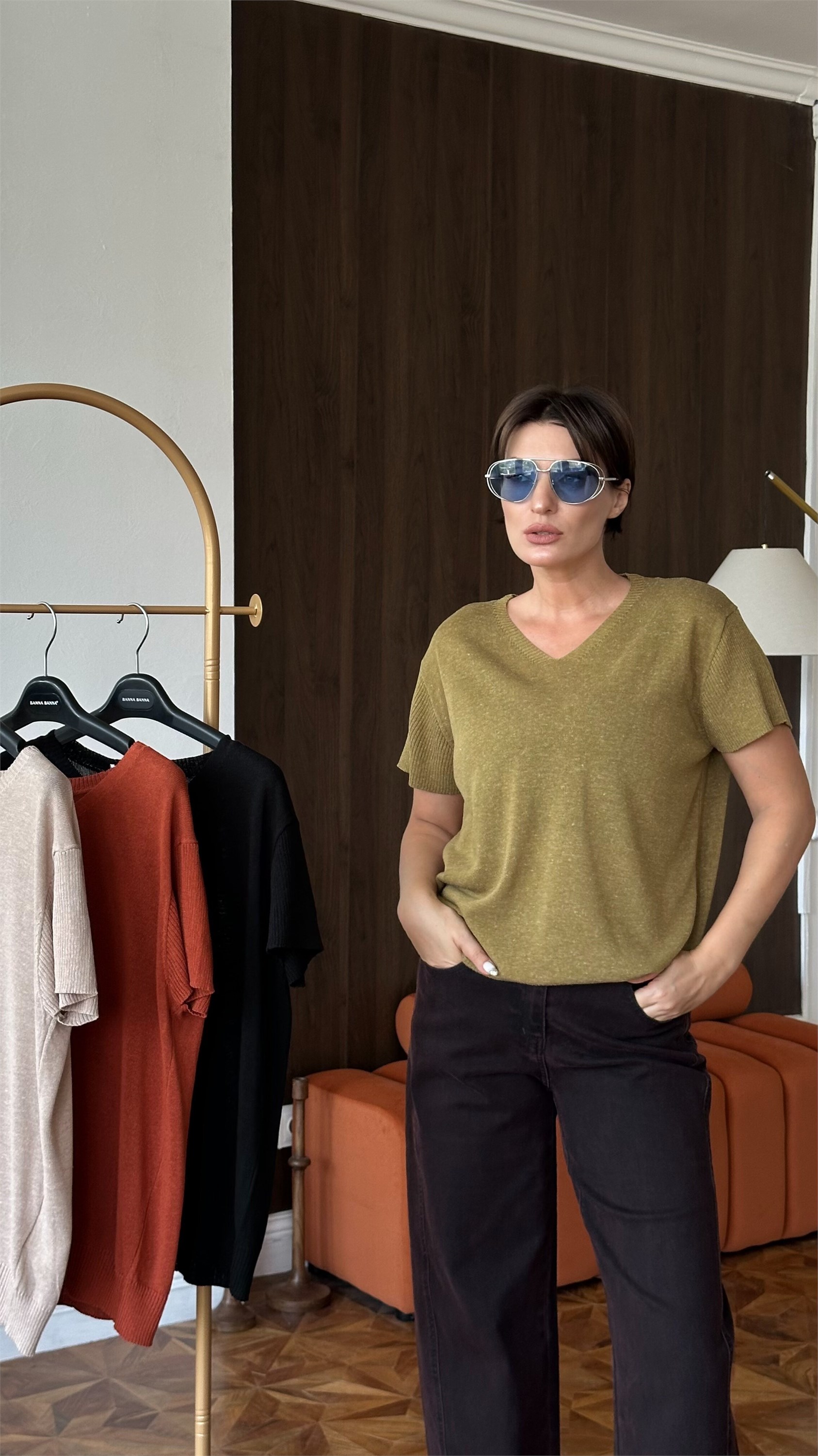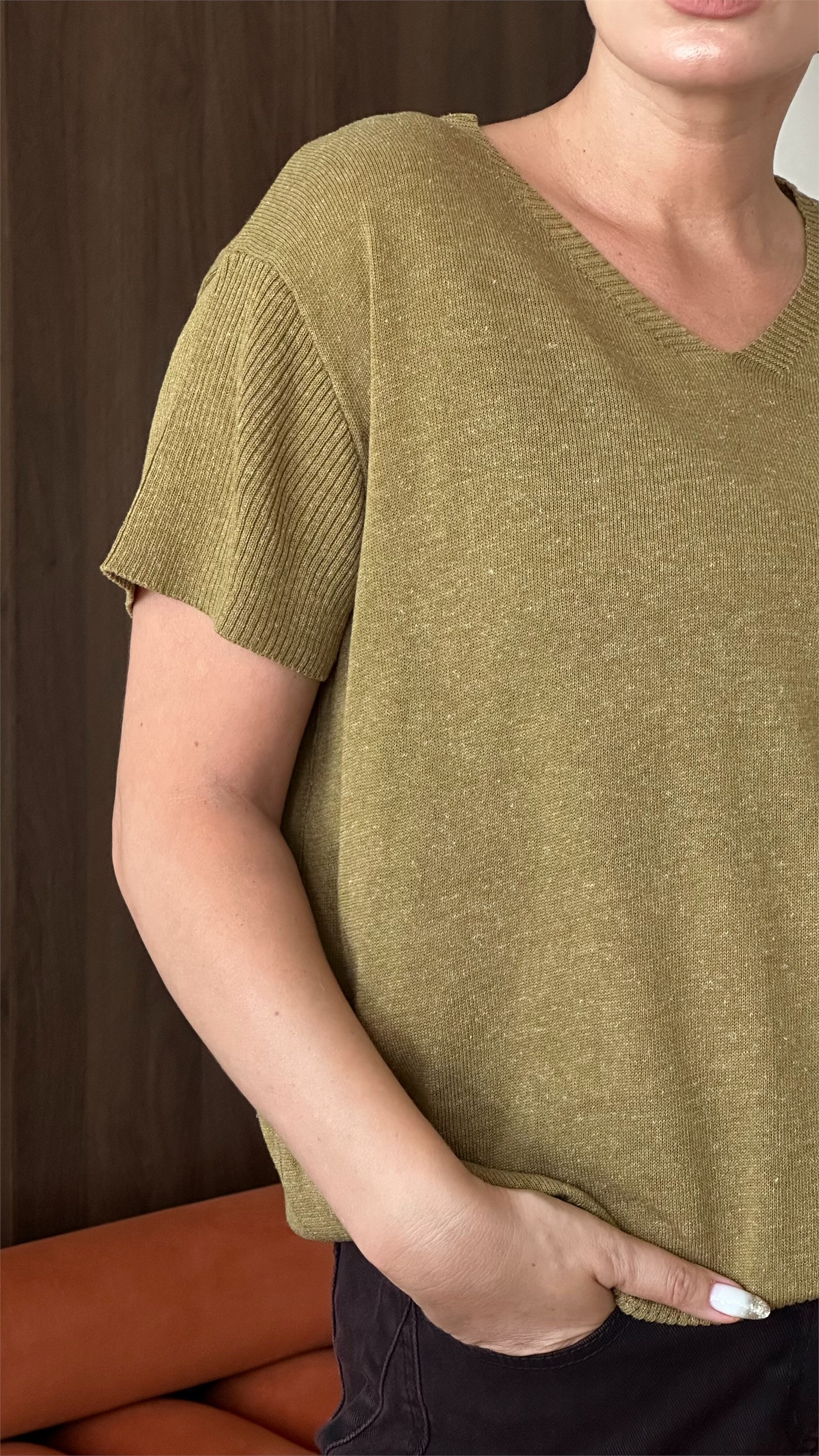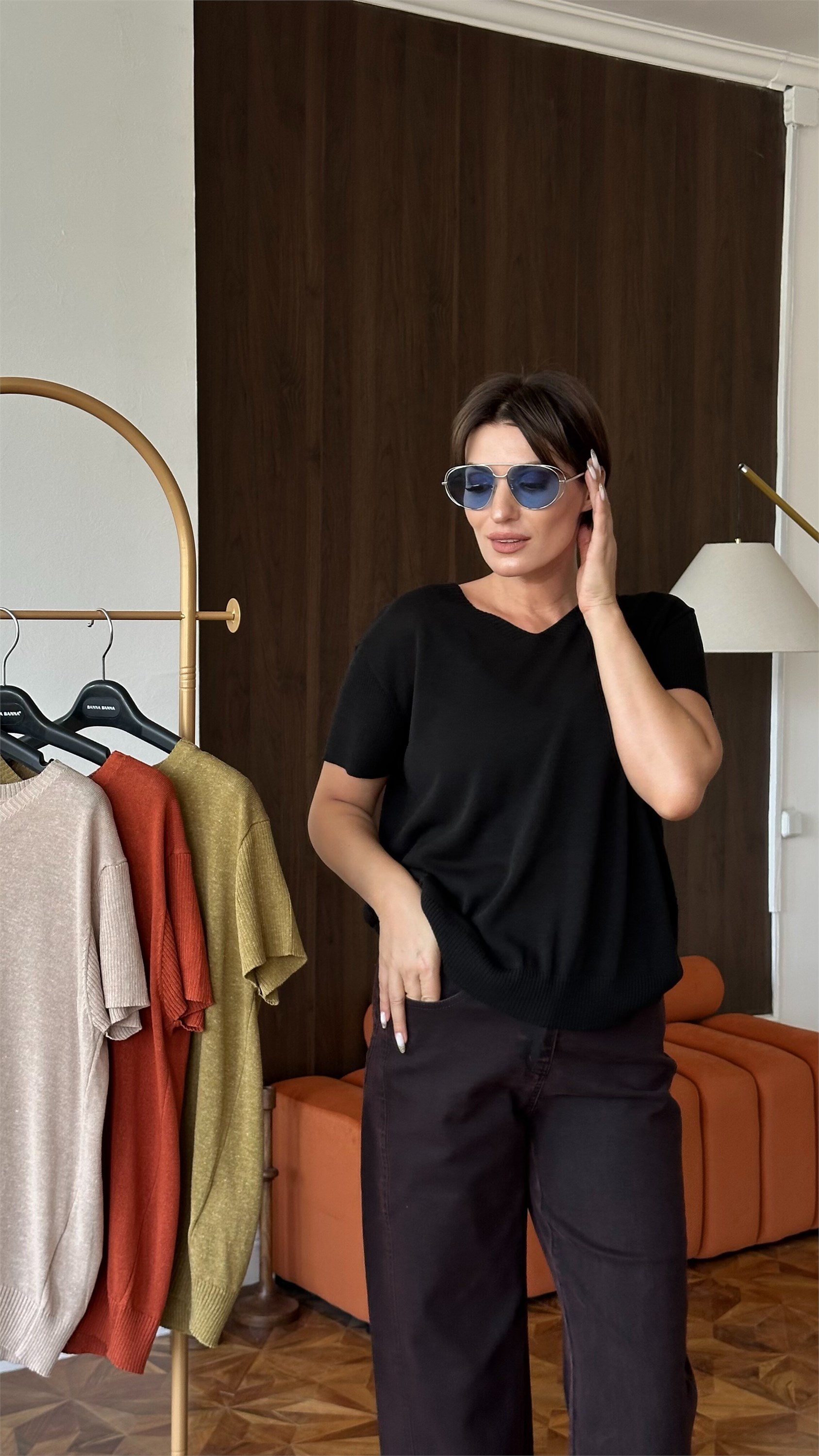 Тонкий вязаный джемпер с коротким рукавом — универсальная и стильная вещь для базового гардероба. Модель выполнена из мягкого, дышащего материала, приятного к телу. V-образный вырез подчёркивает линию шеи и добавляет образу женственности, а аккуратные короткие рукава делают джемпер идеальным для тёплого сезона или многослойных сочетаний. Эластичная резинка по низу обеспечивает комфортную посадку и подчёркивает силуэт. Отлично сочетается как с джинсами и брюками, так и с юбками — для создания как повседневного, так и более собранного образа.Размер free size.Модель представлена в черном безовом цвете, цвете грейпфрут,песочном и оливковом.