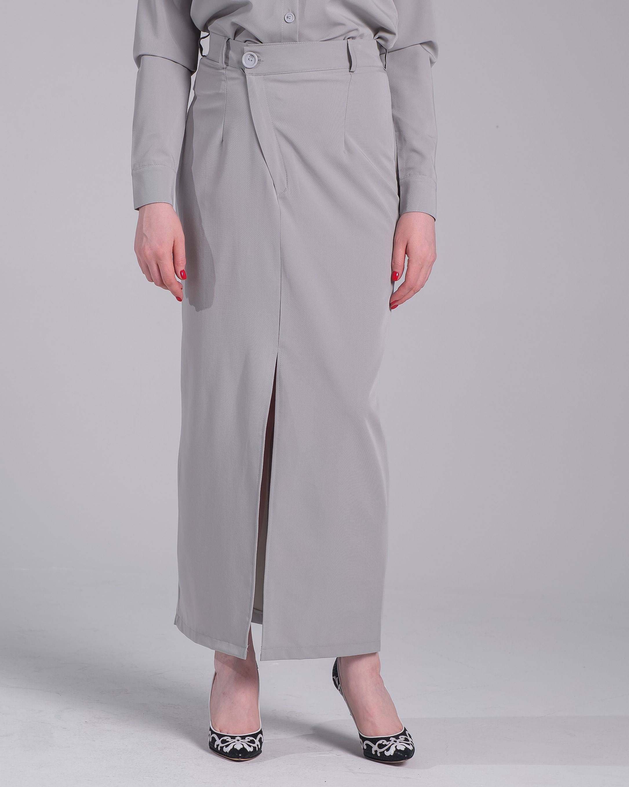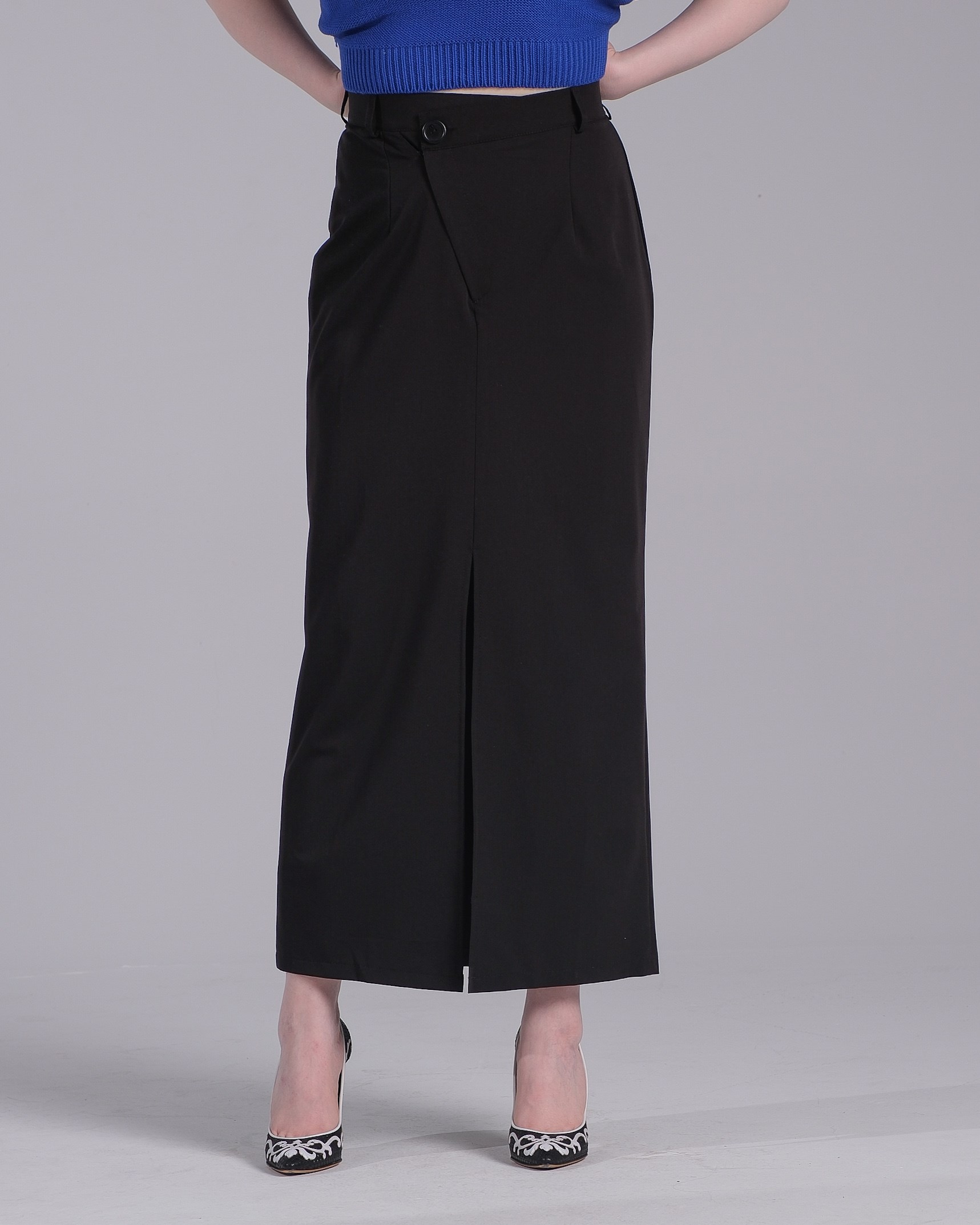 Юбка текстильная длины макси. Разрез спереди до колен, застежка гульфика косая на молнии и пуговице.