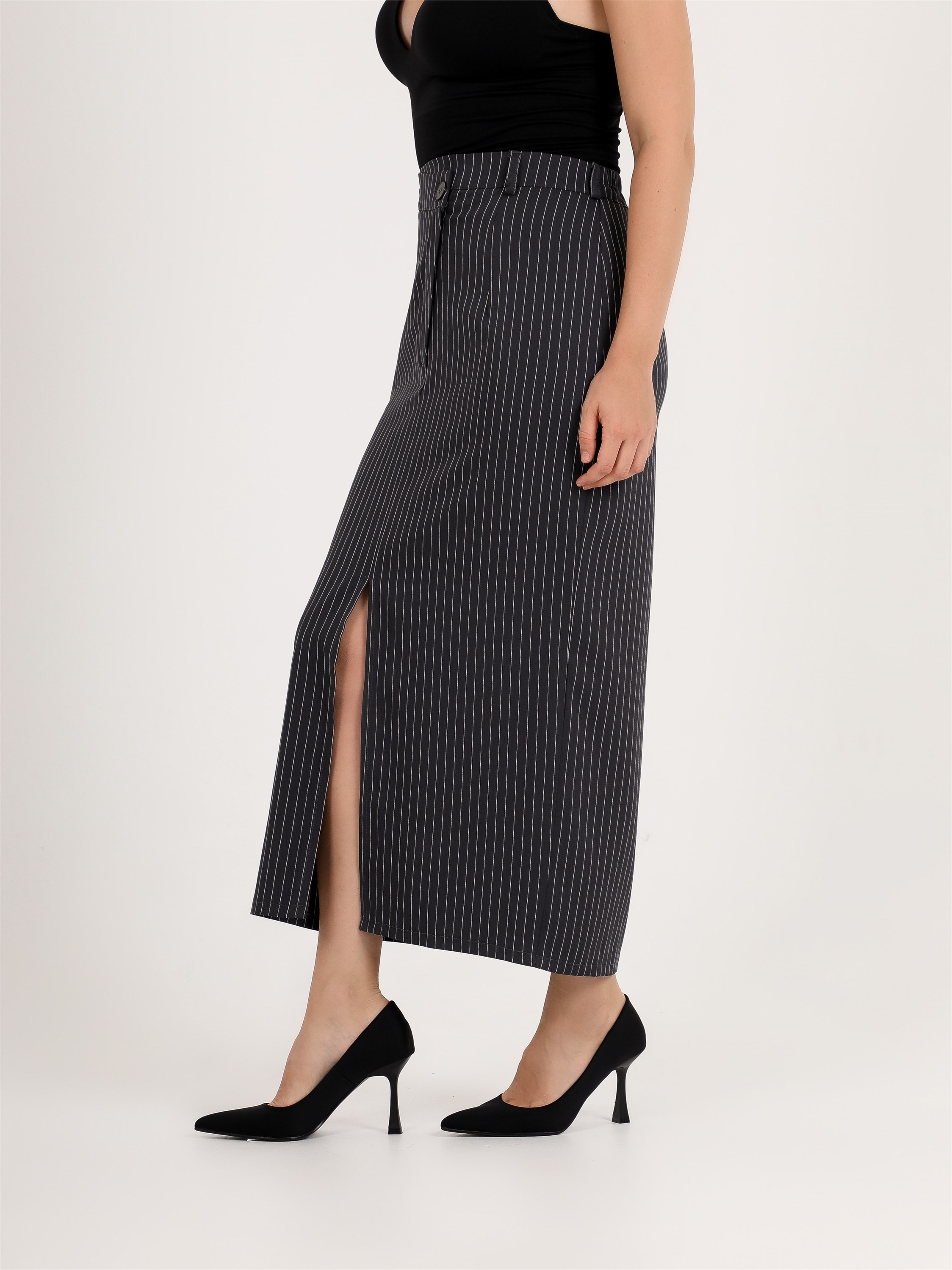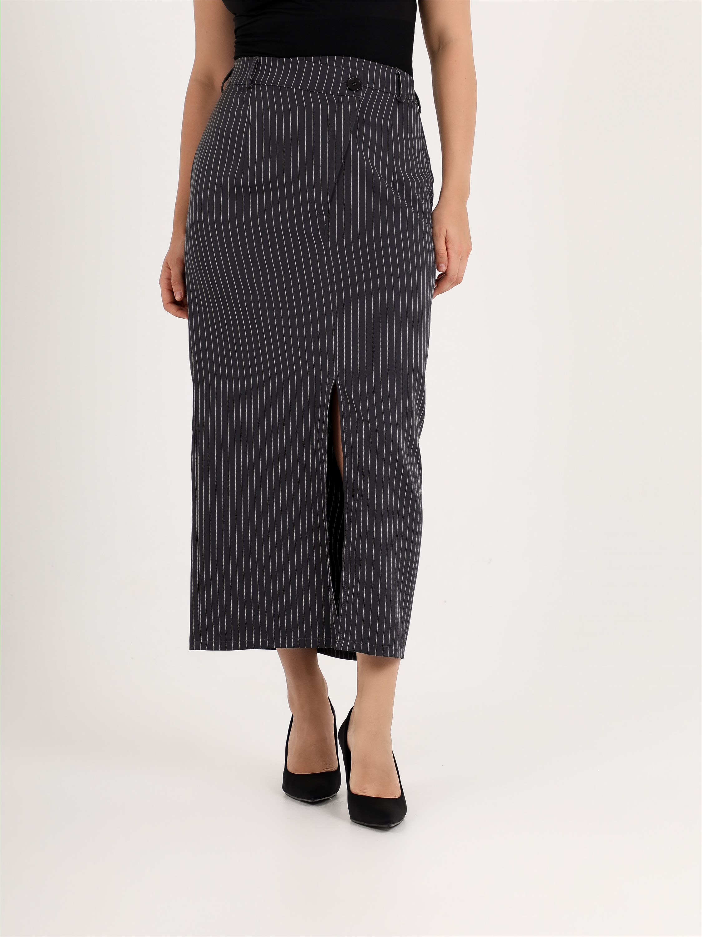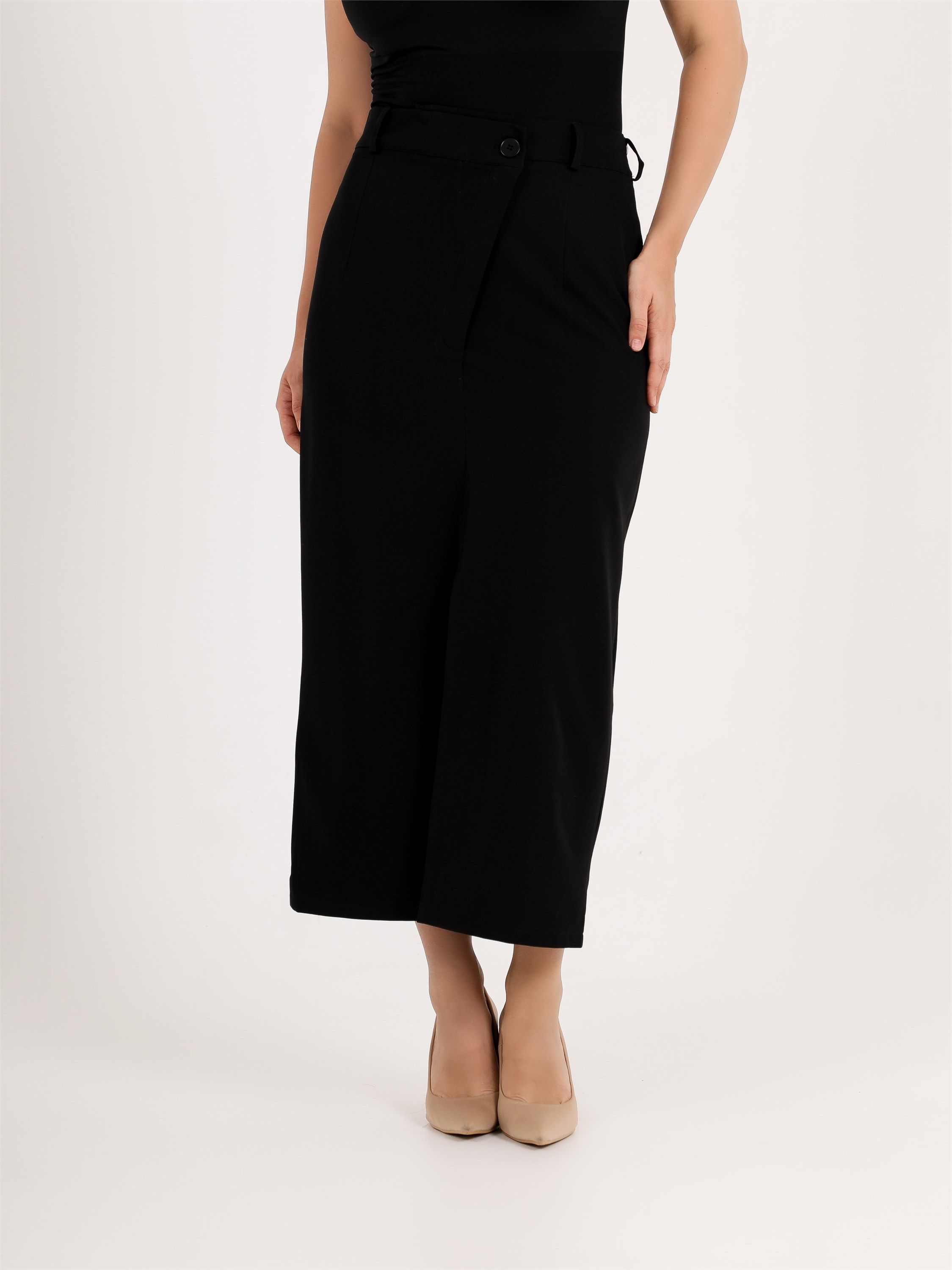 Юбка текстильная длины миди. Разрез спереди до колен, застежка гульфика косая на молнии и пуговице.
