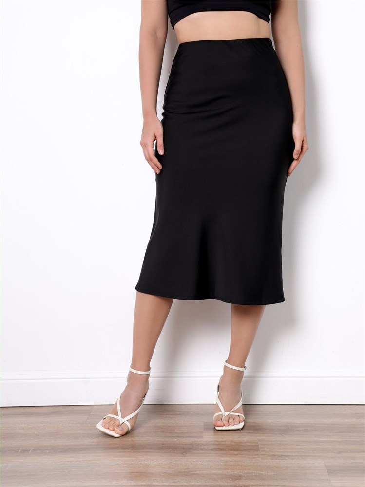 Юбка полуприлегающего силуэта длины миди с эластичной резиновой тесьмой по поясу.