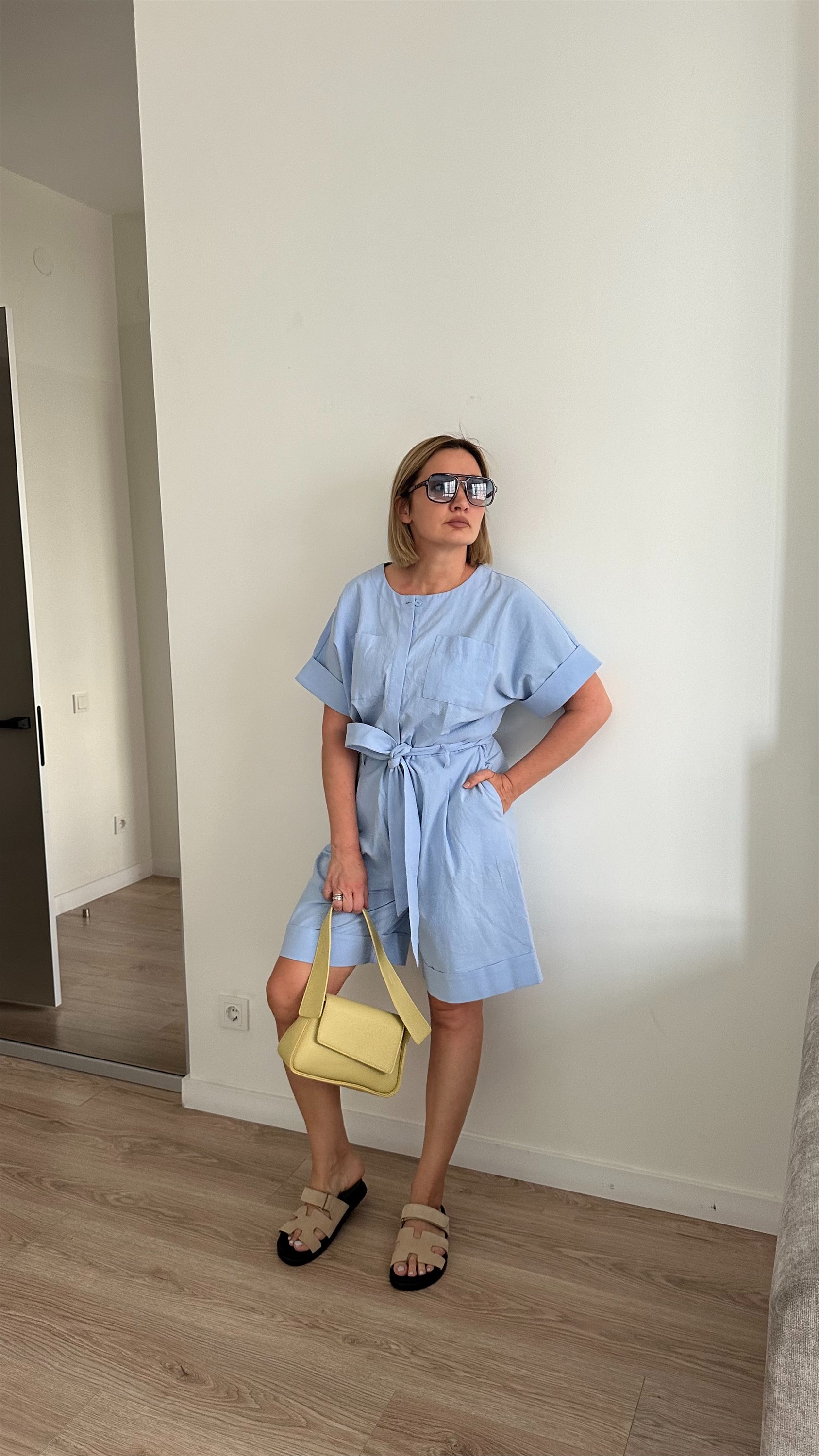 ***Жеңі тұтас, қысқа пішілген комбинезон. Кеуде тұсында жапсырма қалталары, шалбар тұсында бүйір қалталары бар. Жасырын түйме тесігіне бекітілген, алынбалы белдігі бар, ұзындығы тізеден жоғары.