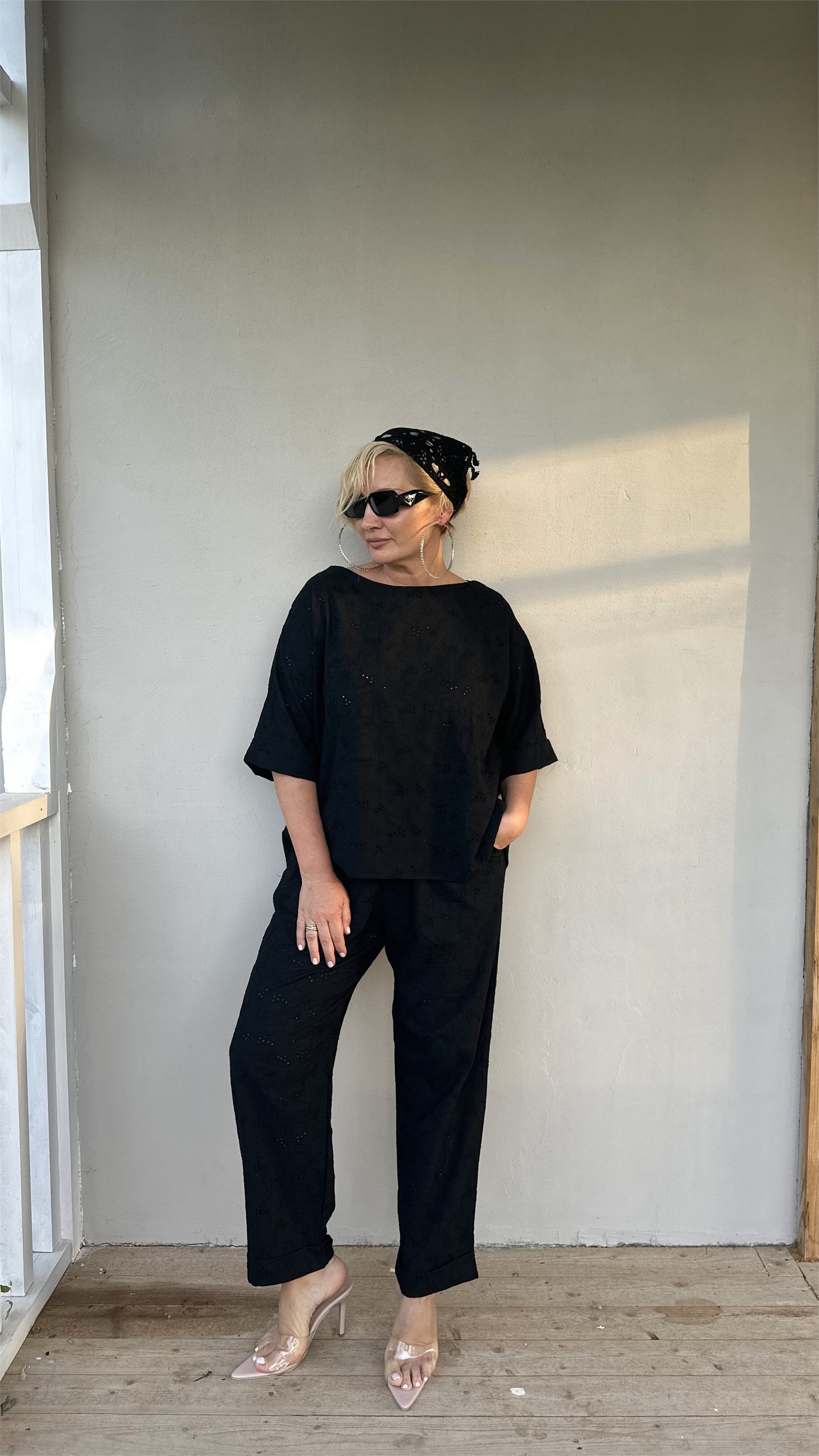 Женственный и воздушный костюм из натурального выбитого хлопка — идеальное сочетание комфорта и элегантности. Комплект состоит из свободной оверсайз-блузки с рукавами и прямых брюк на мягкой резинке. Лёгкая фактура ткани с ажурным узором придаёт образу изысканный акцент, оставаясь при этом максимально дышащей и приятной к телу. Универсальный силуэт позволяет носить костюм как комплектом, так и по отдельности — с денимом, льняными изделиями или базовыми топами. Идеален для тёплого сезона, прогулок, отдыха или стильных городских образов.Модель представлена в трех цветах-белый, черный и молочный шоколад.Размерная линейка от 44 до 54 р
