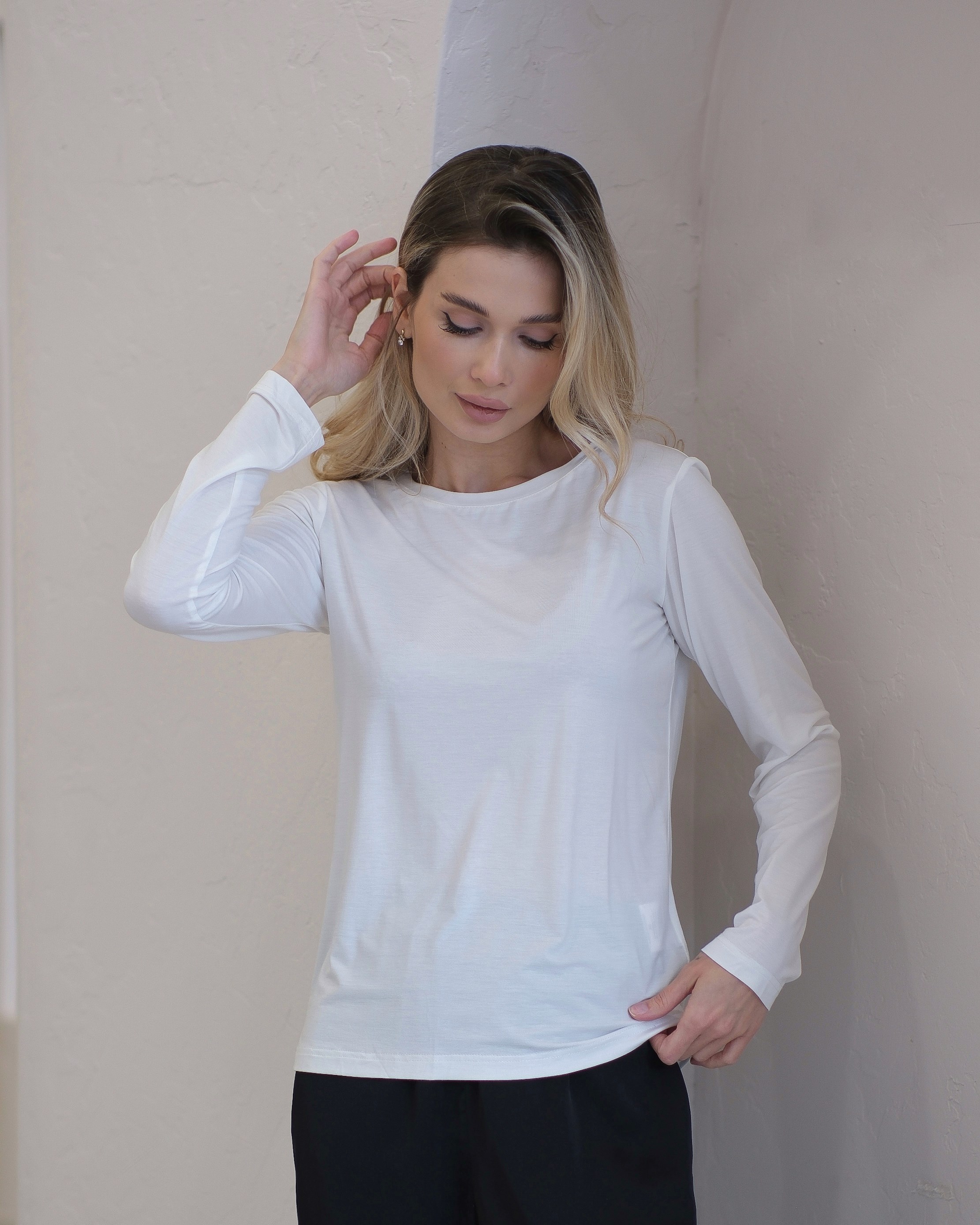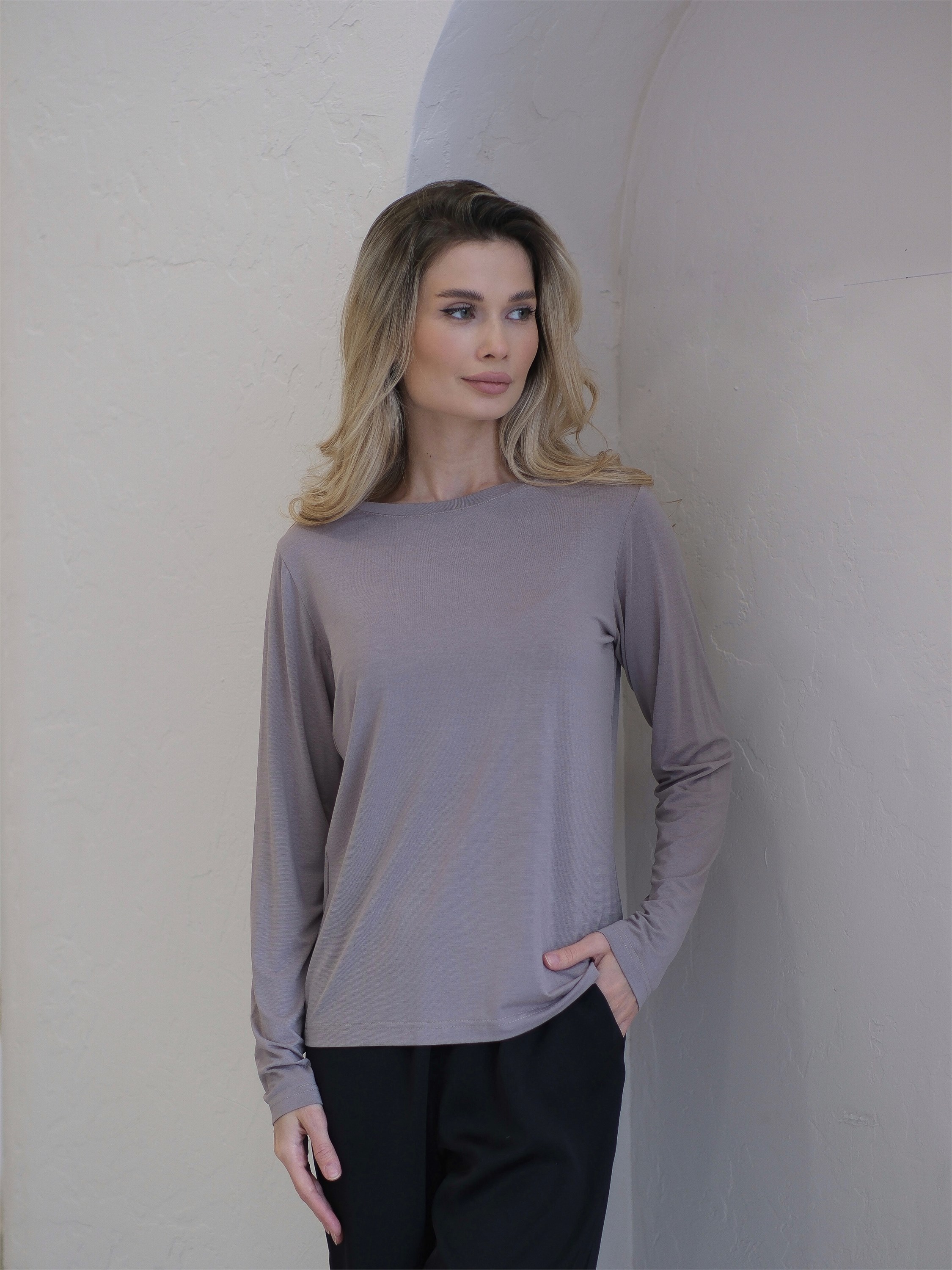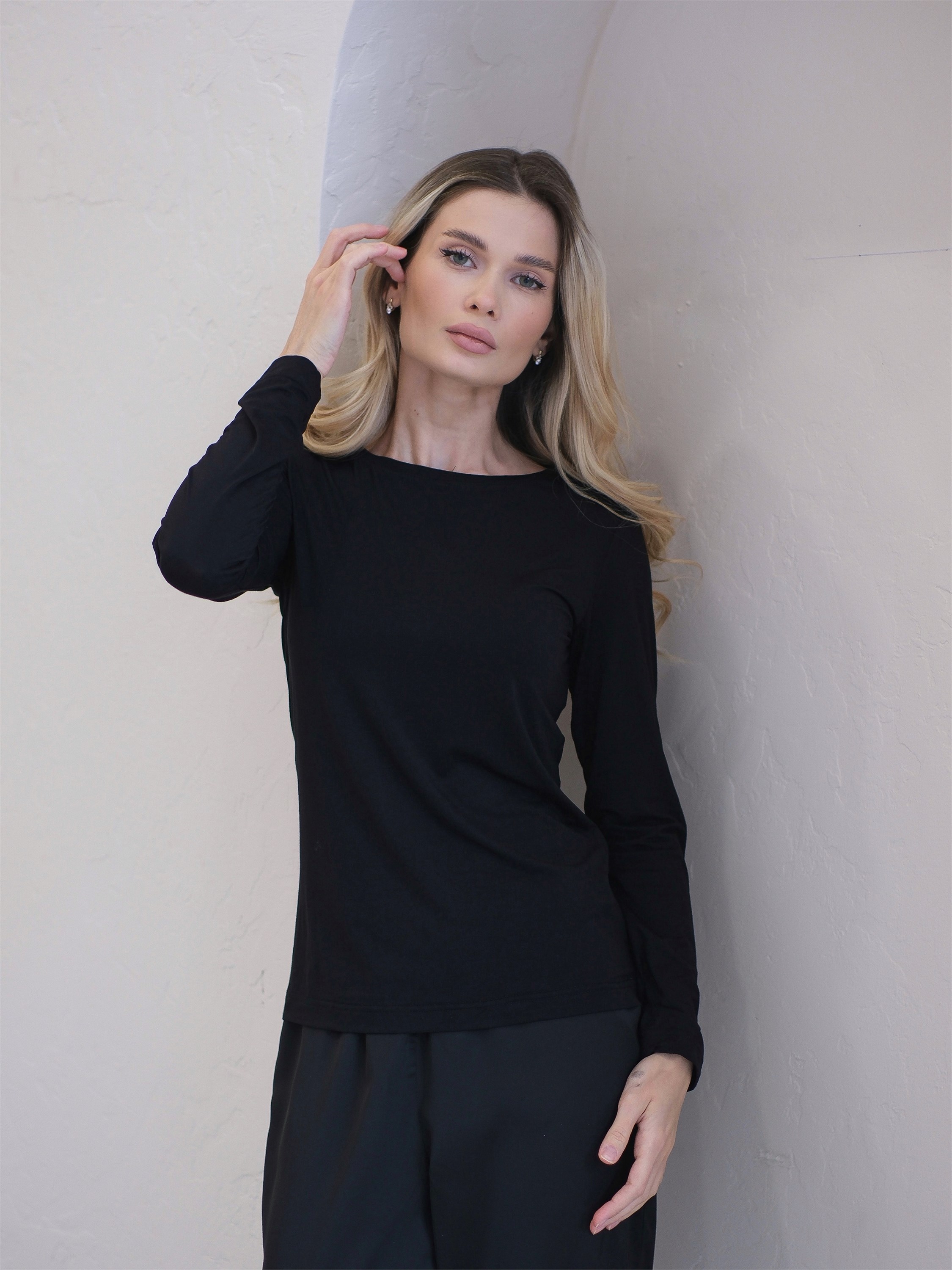 Лонгслив прилегающего силуэта, со втачным рукавом полной длины,.Вырез горловины круглый.Длина изделия до бедер.Лонгслив отлично подходит для самостоятельной носки,как база под жакет.Может сочетаться с любым стилем одежды.Сезон- круглогодичный.