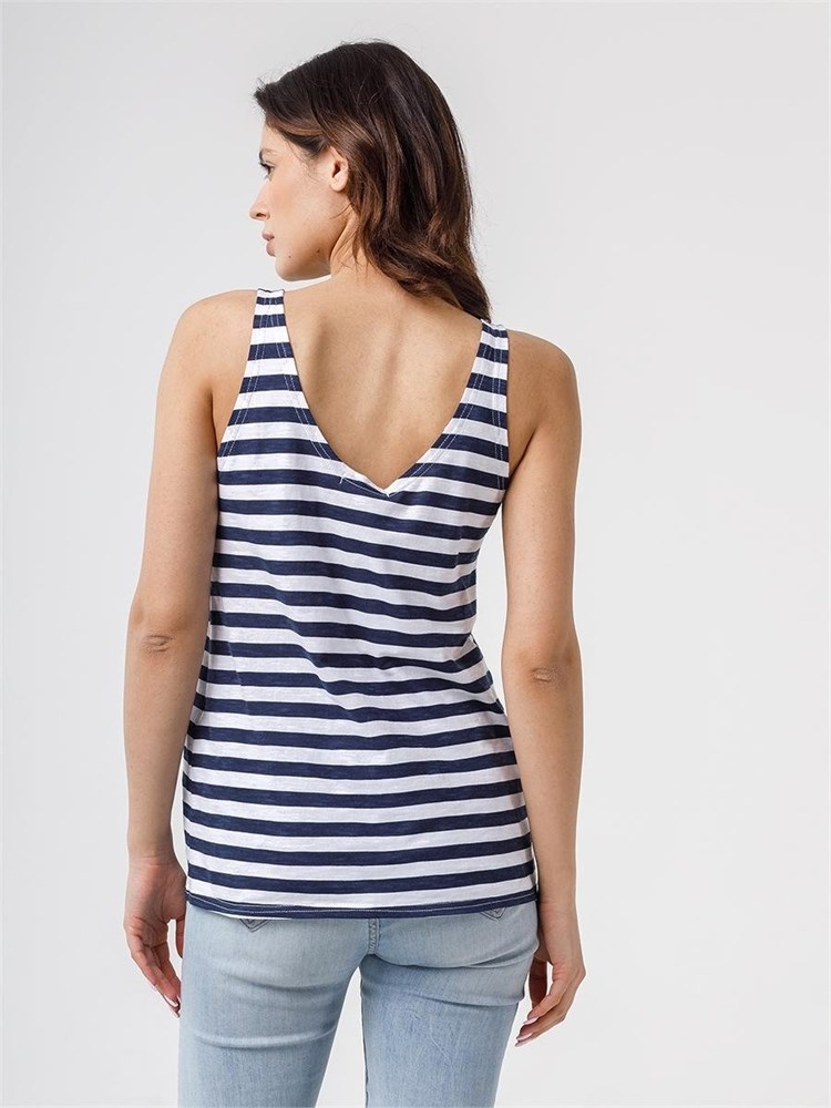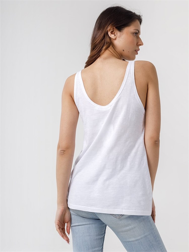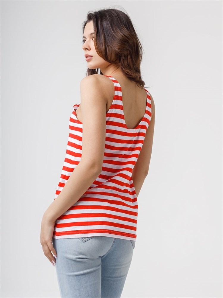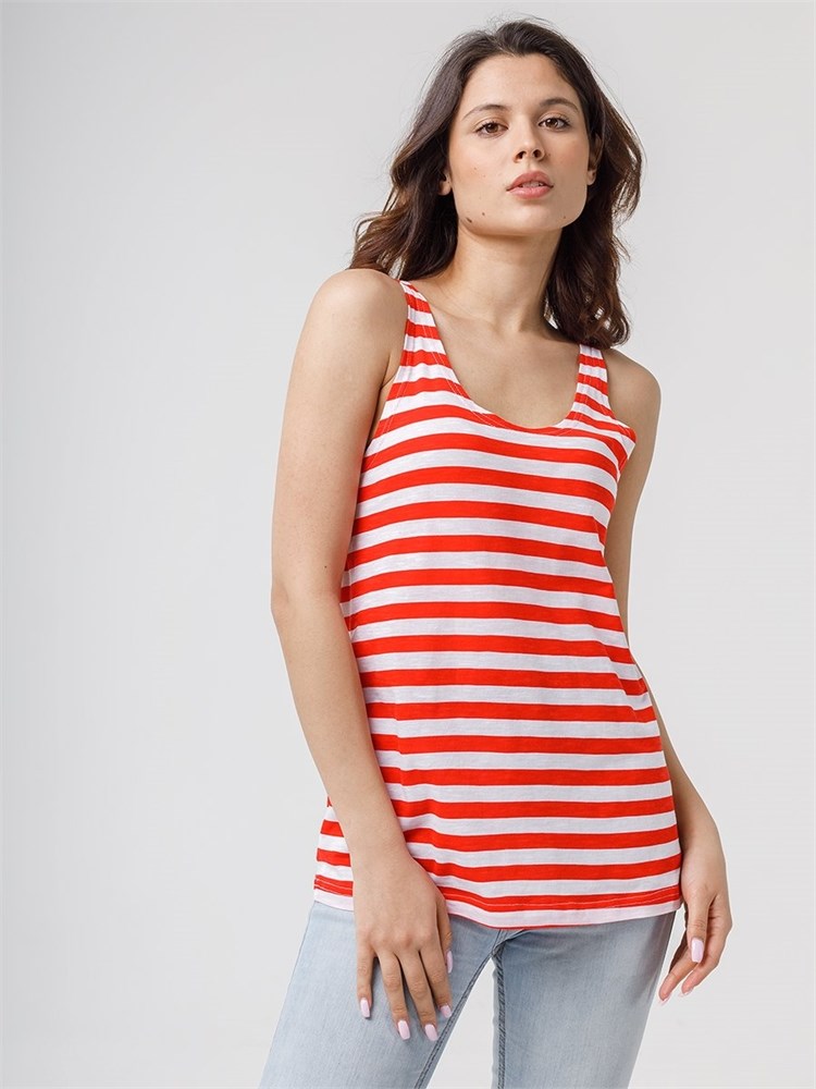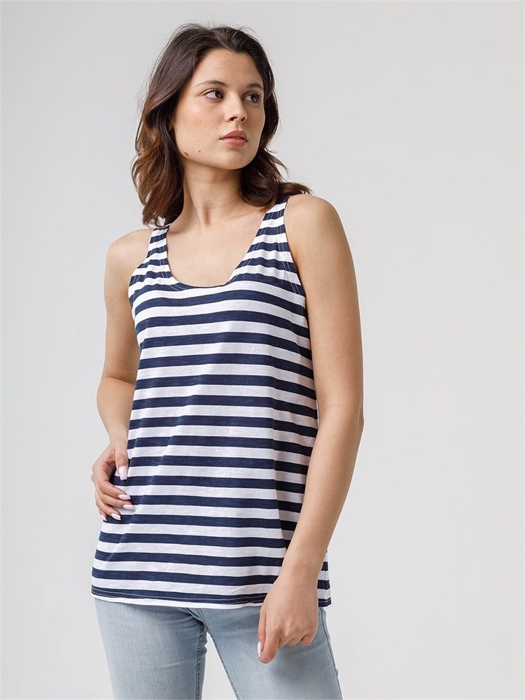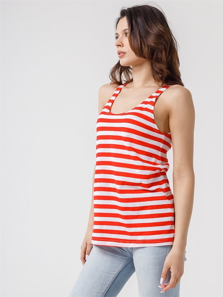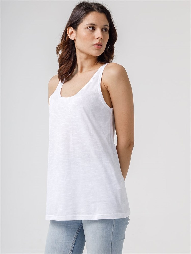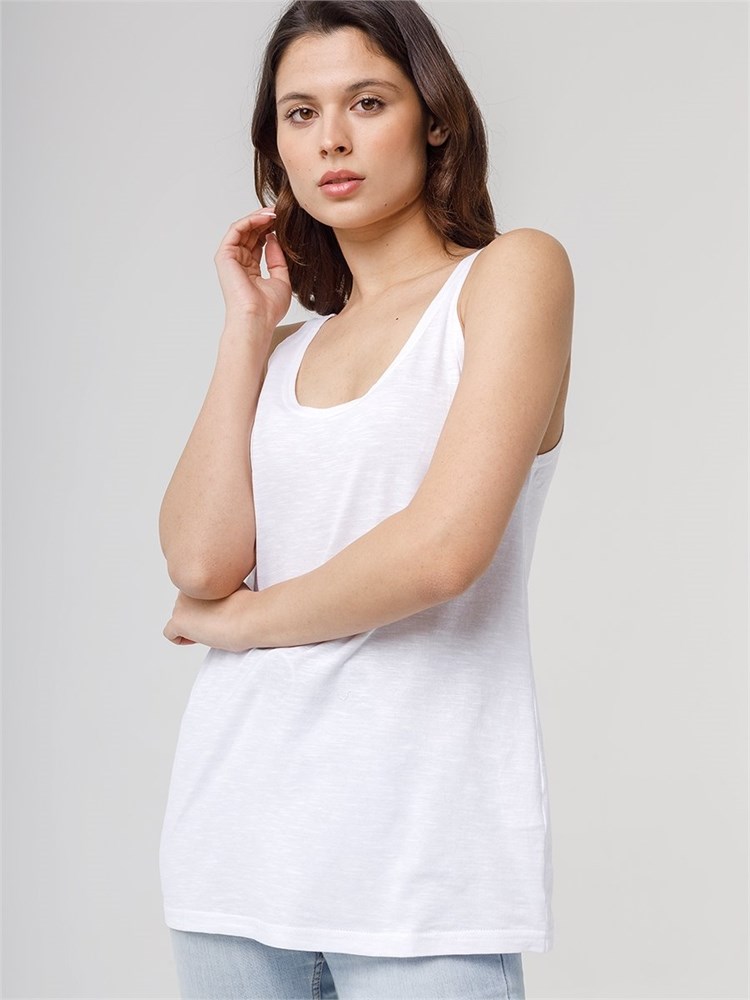 Майка трикотажная с круглым вырезом по горловине. Длина изделия до середины бедер