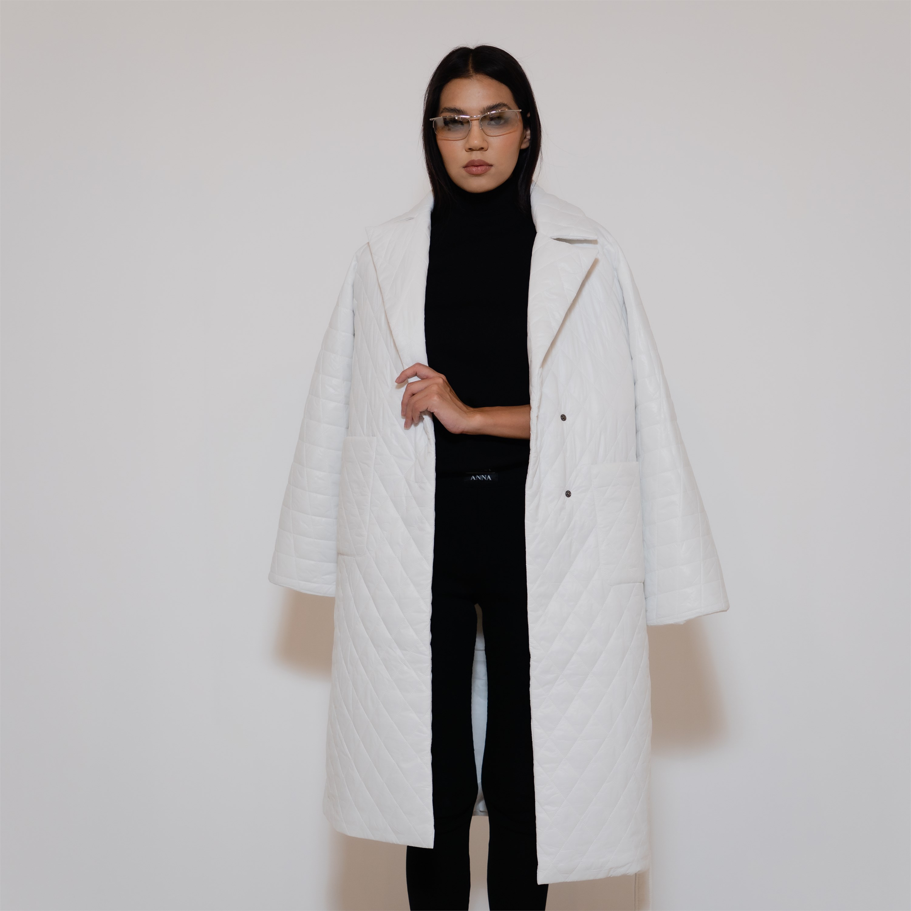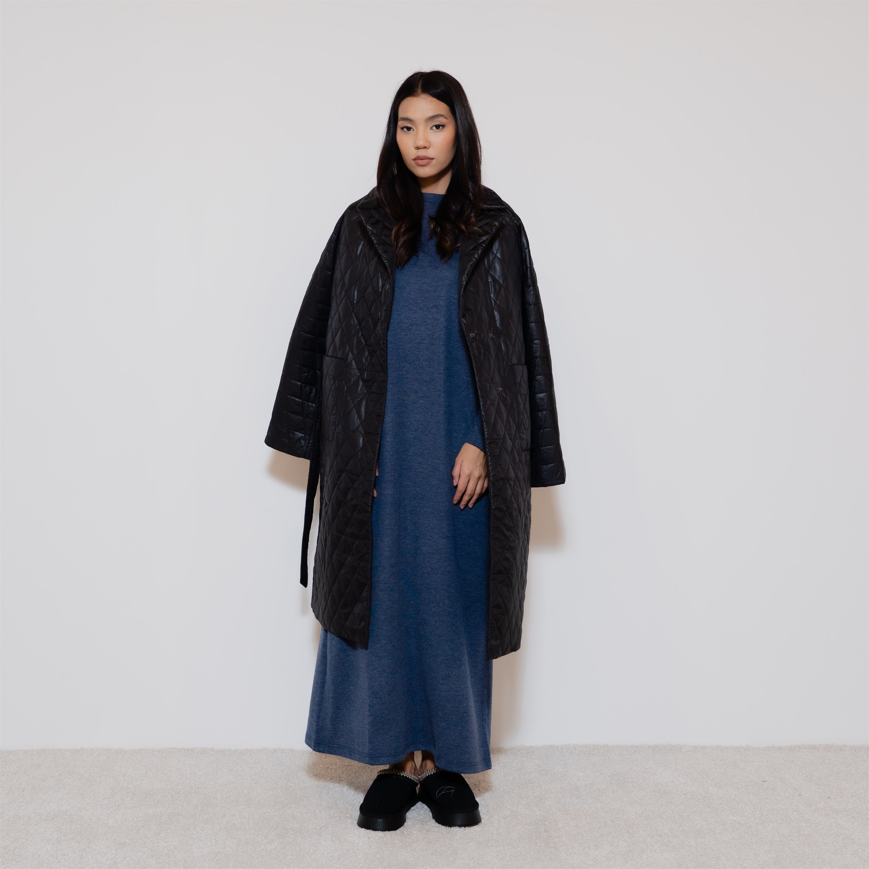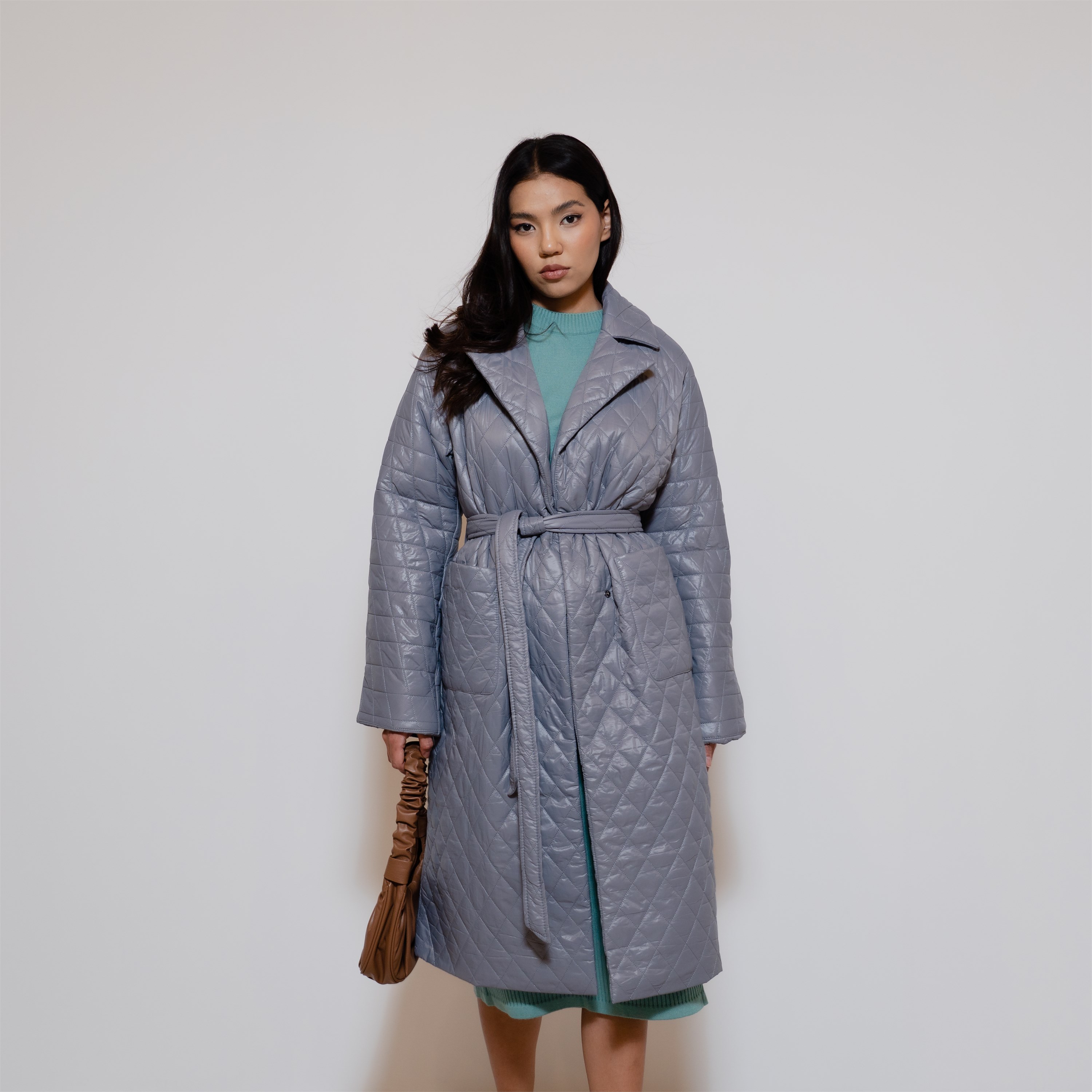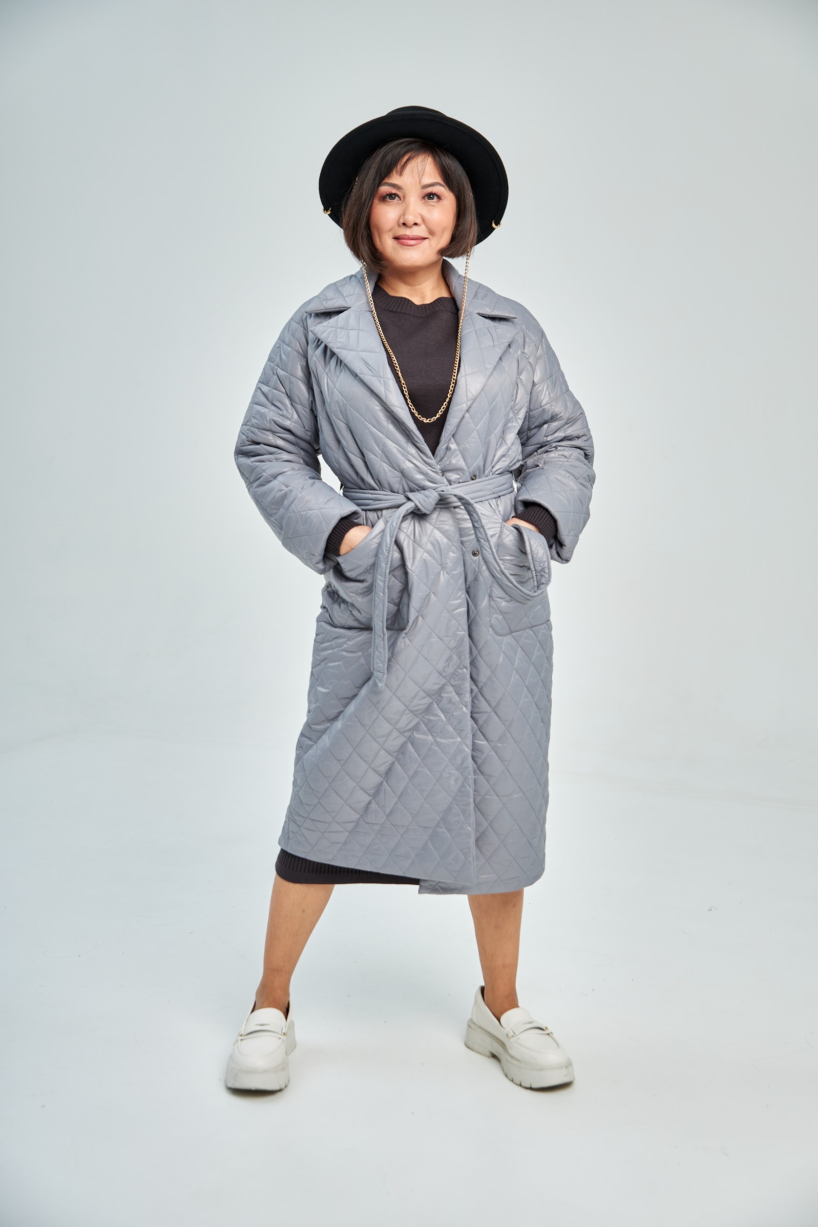 Пальто стеганное прямого силуэта с цельнокроеным рукавом. Воротник с лацканом, карманы накладные, застежка на кнопках, пояс съемный.