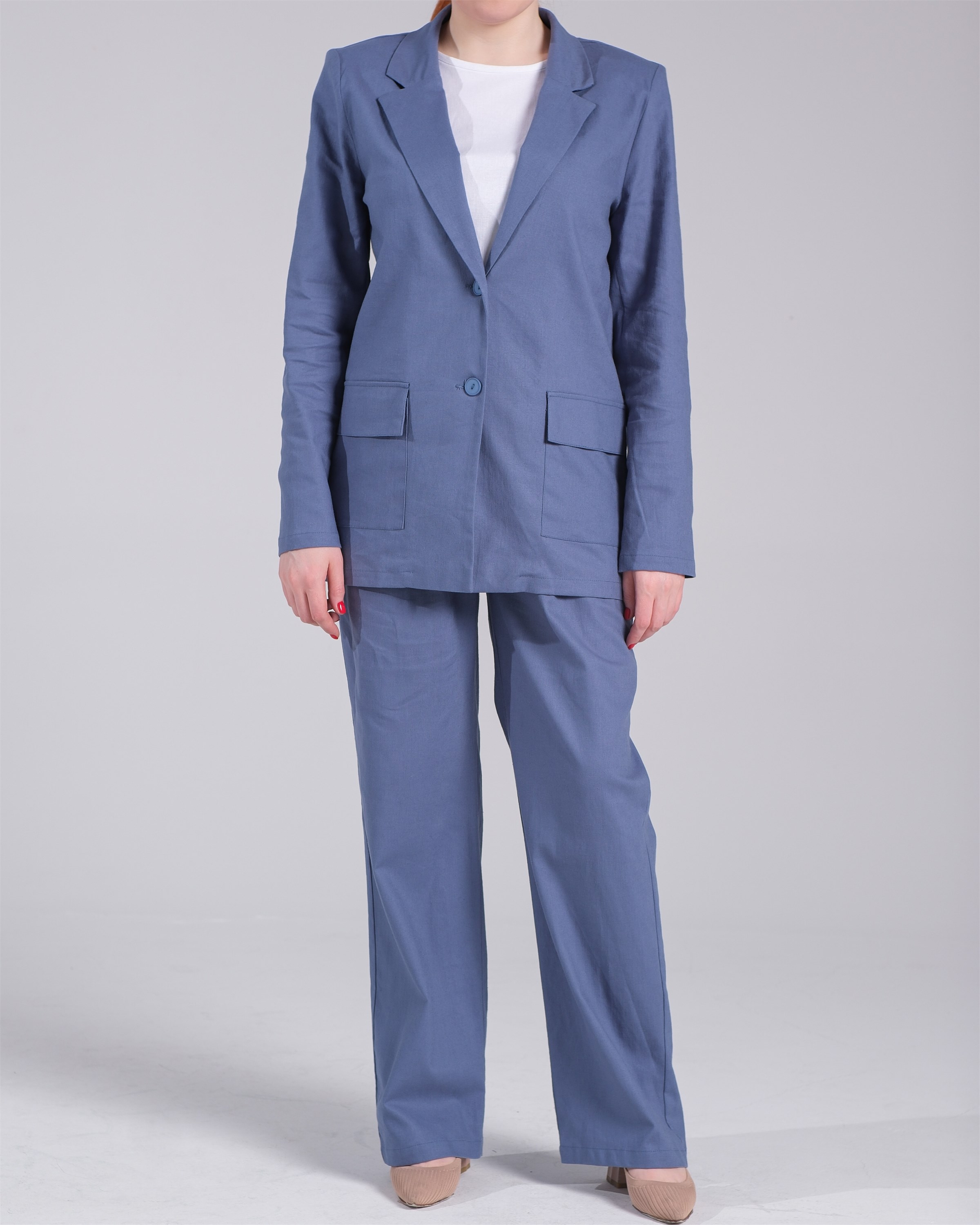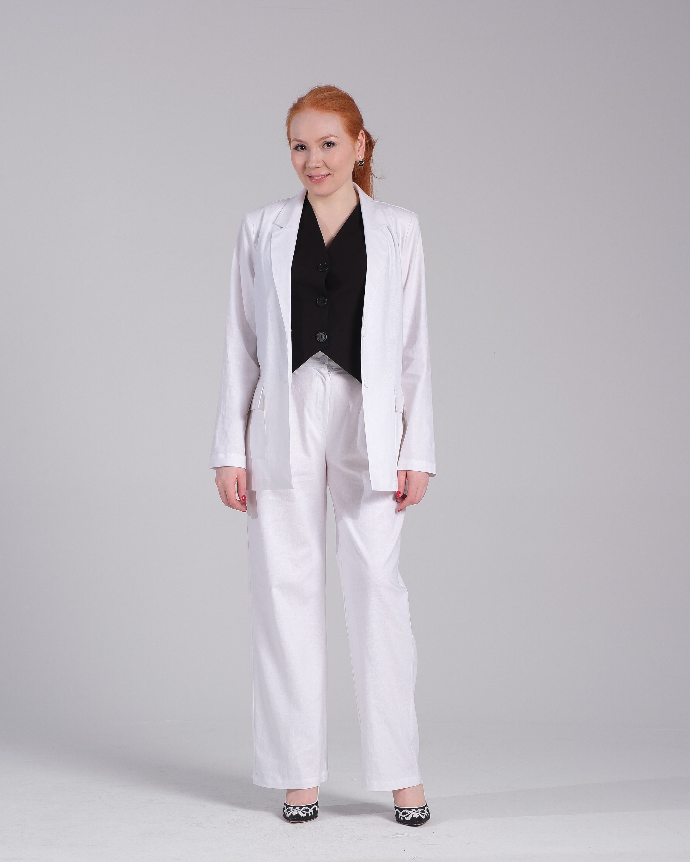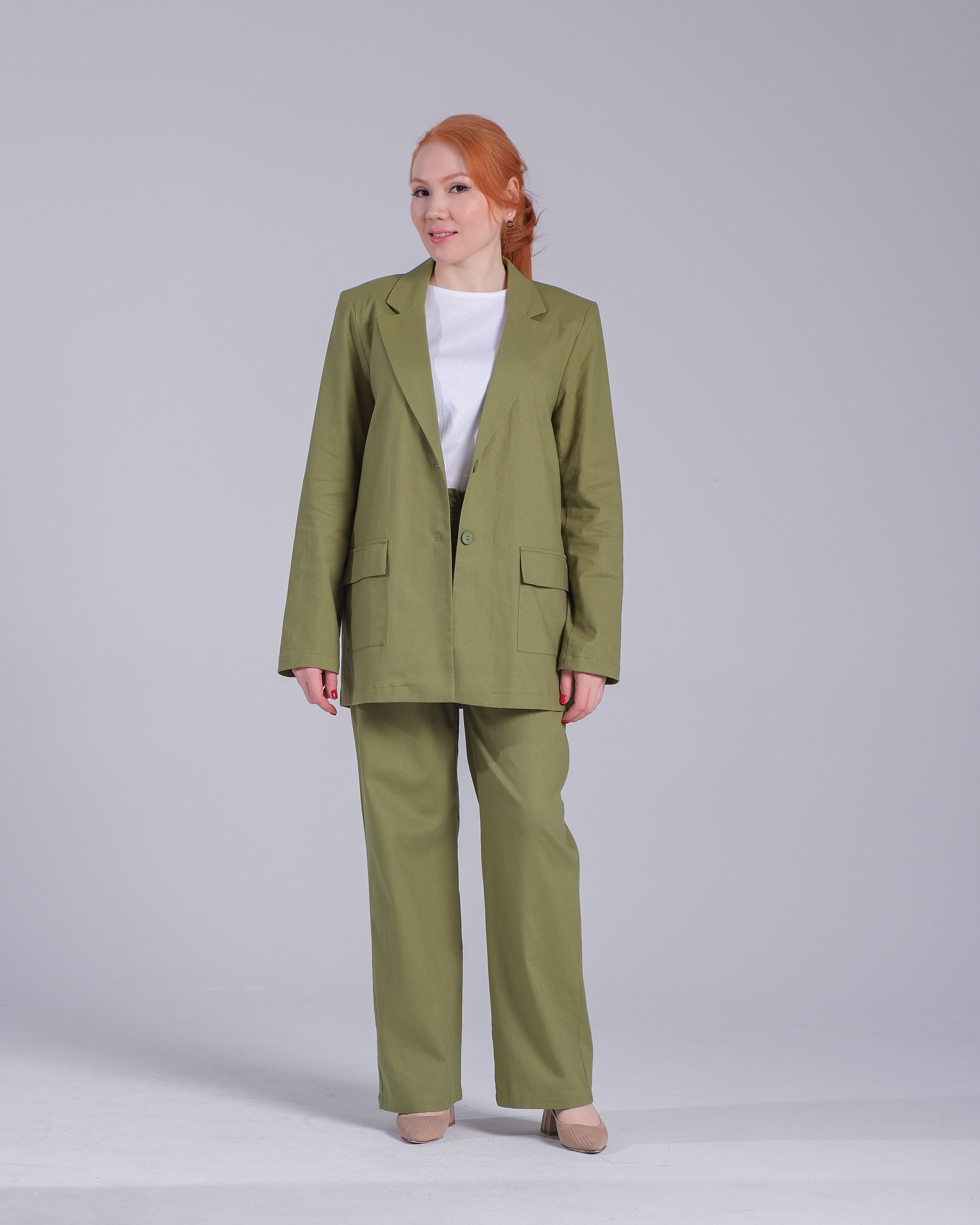 ***Тік пішімді, қондырма жеңді және лацкан жағалы жакет. Бұйым ұзындығы бөкседен төмен, жапсырма қалталы, түйме тесігіне бекітілген.
