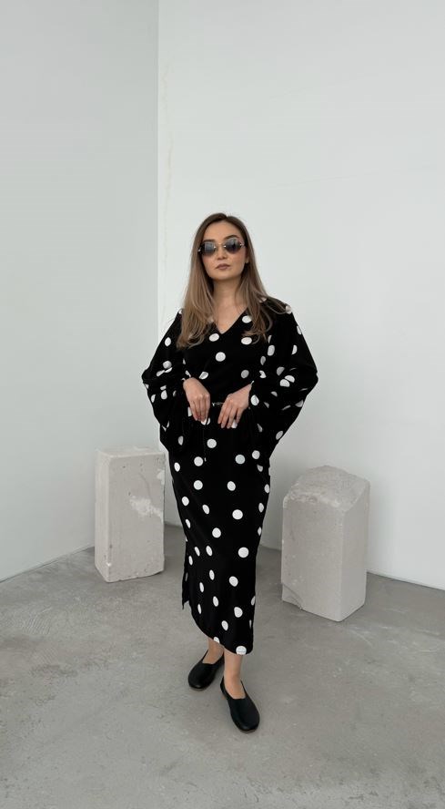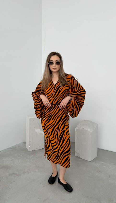 ***Тік силуэтті, балтырға дейінгі ұзындықтағы көйлек. Қондырмалы кең жеңді.