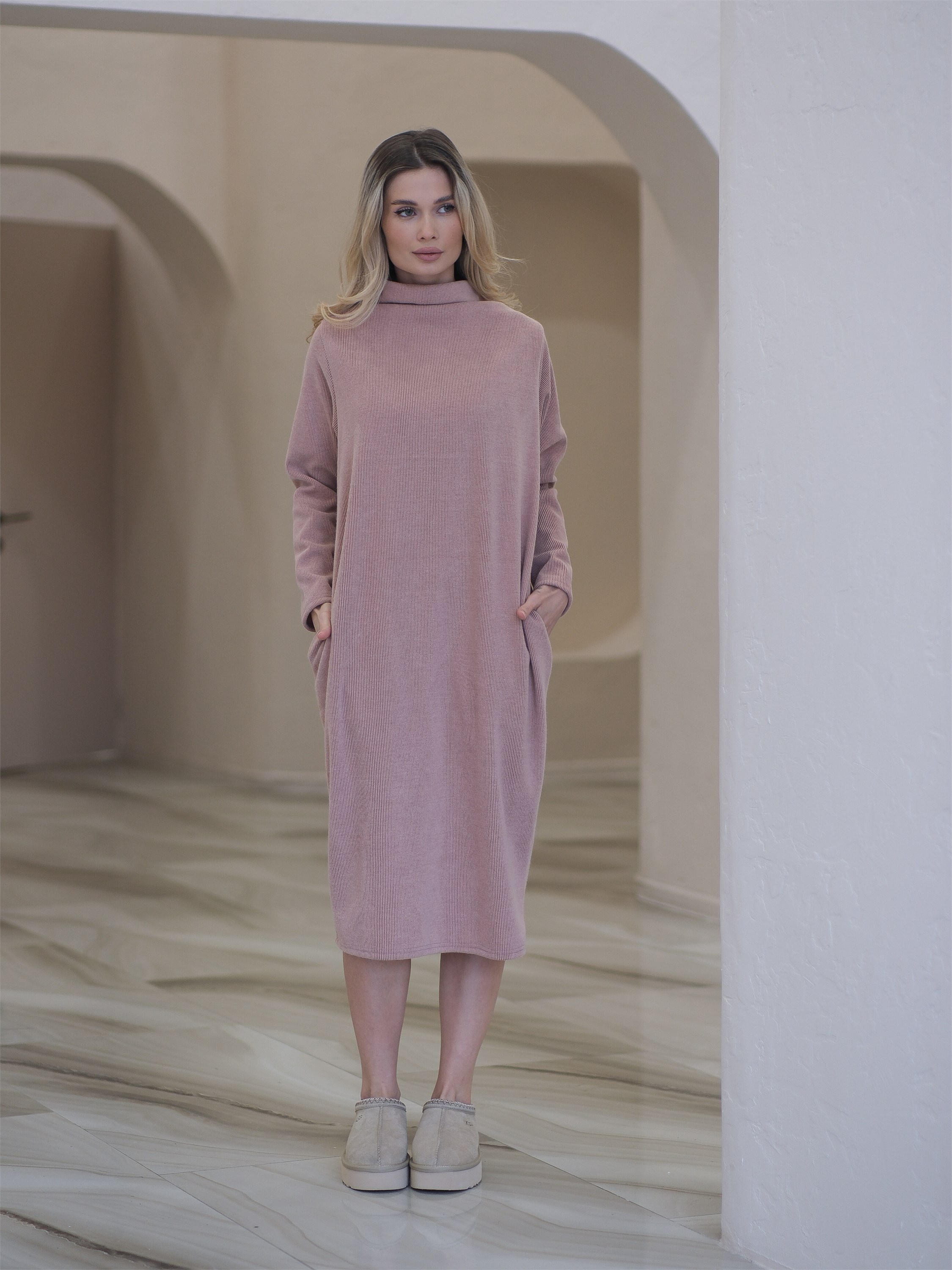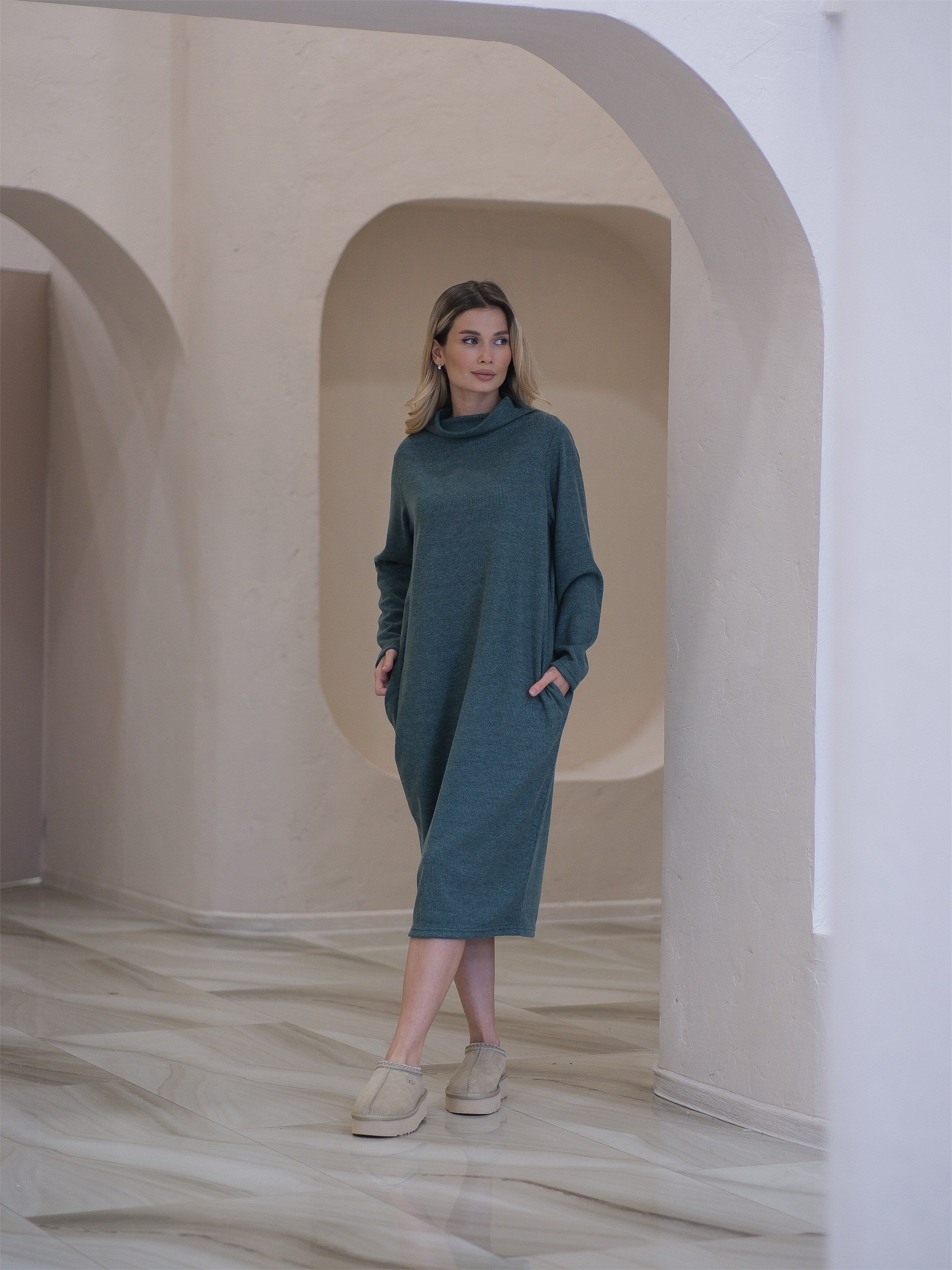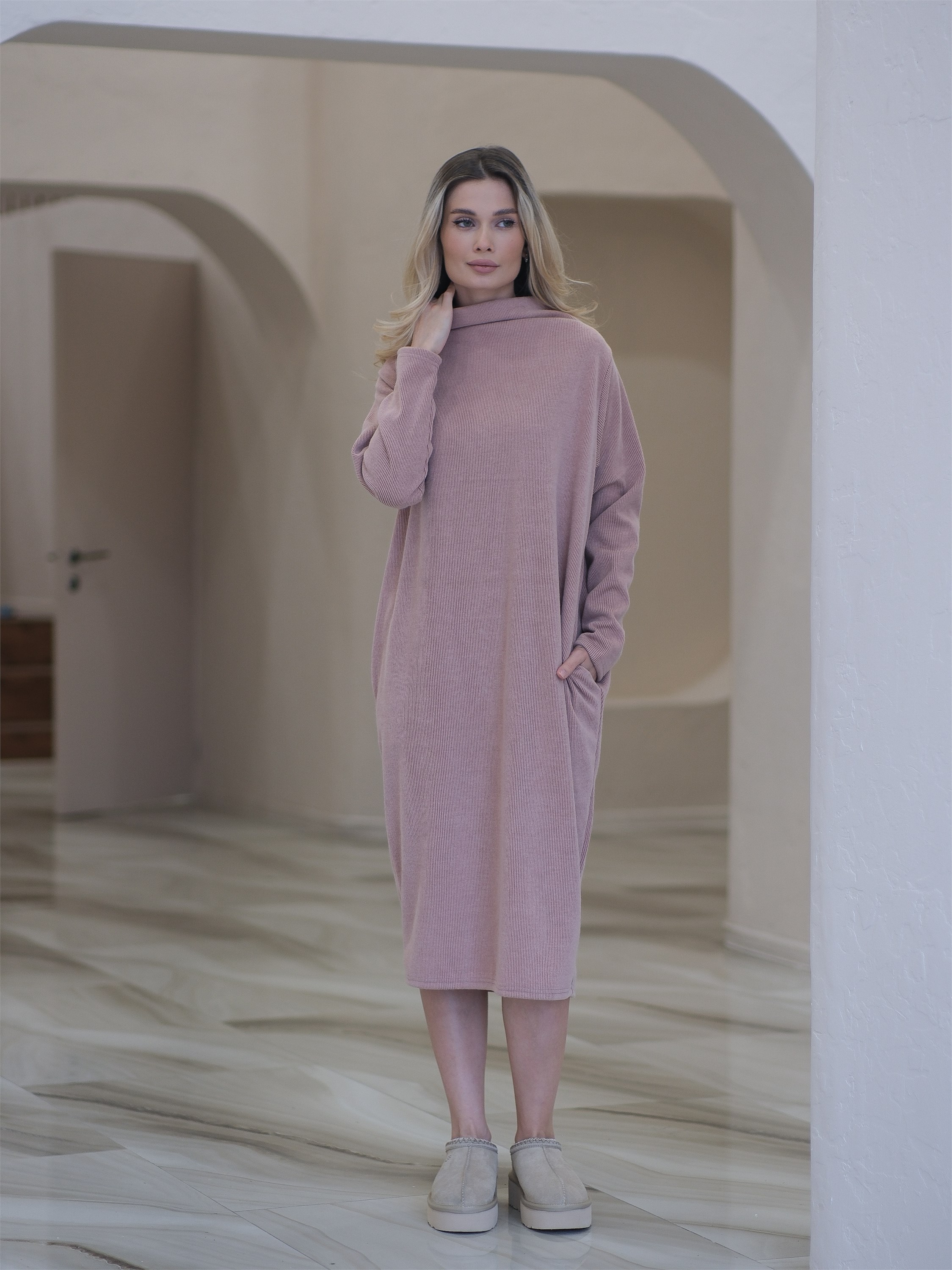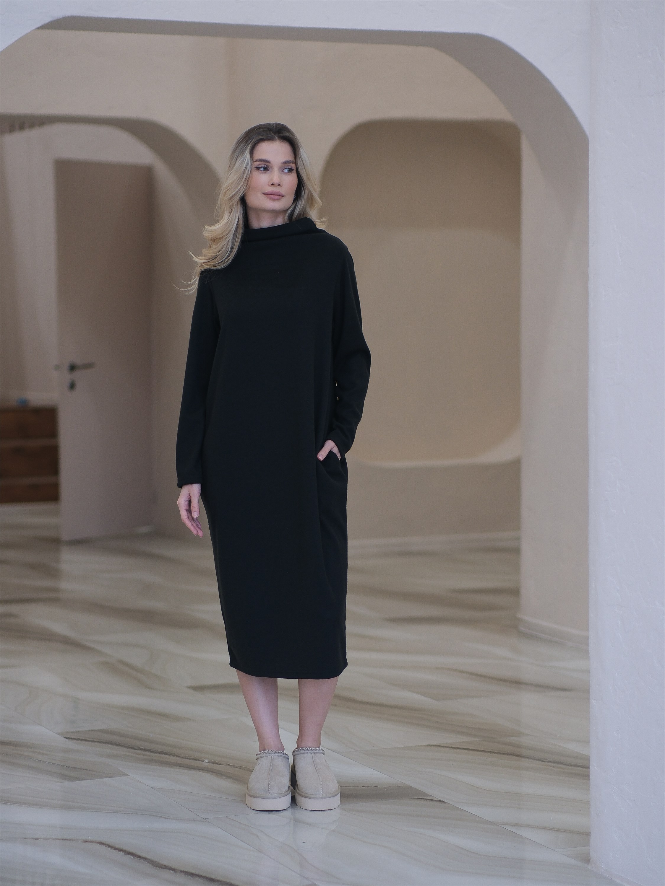 Платье "бочонок" длины миди со спущенным плечом. Горловина высокая, цельнокроеная. Карманы в боковых швах.