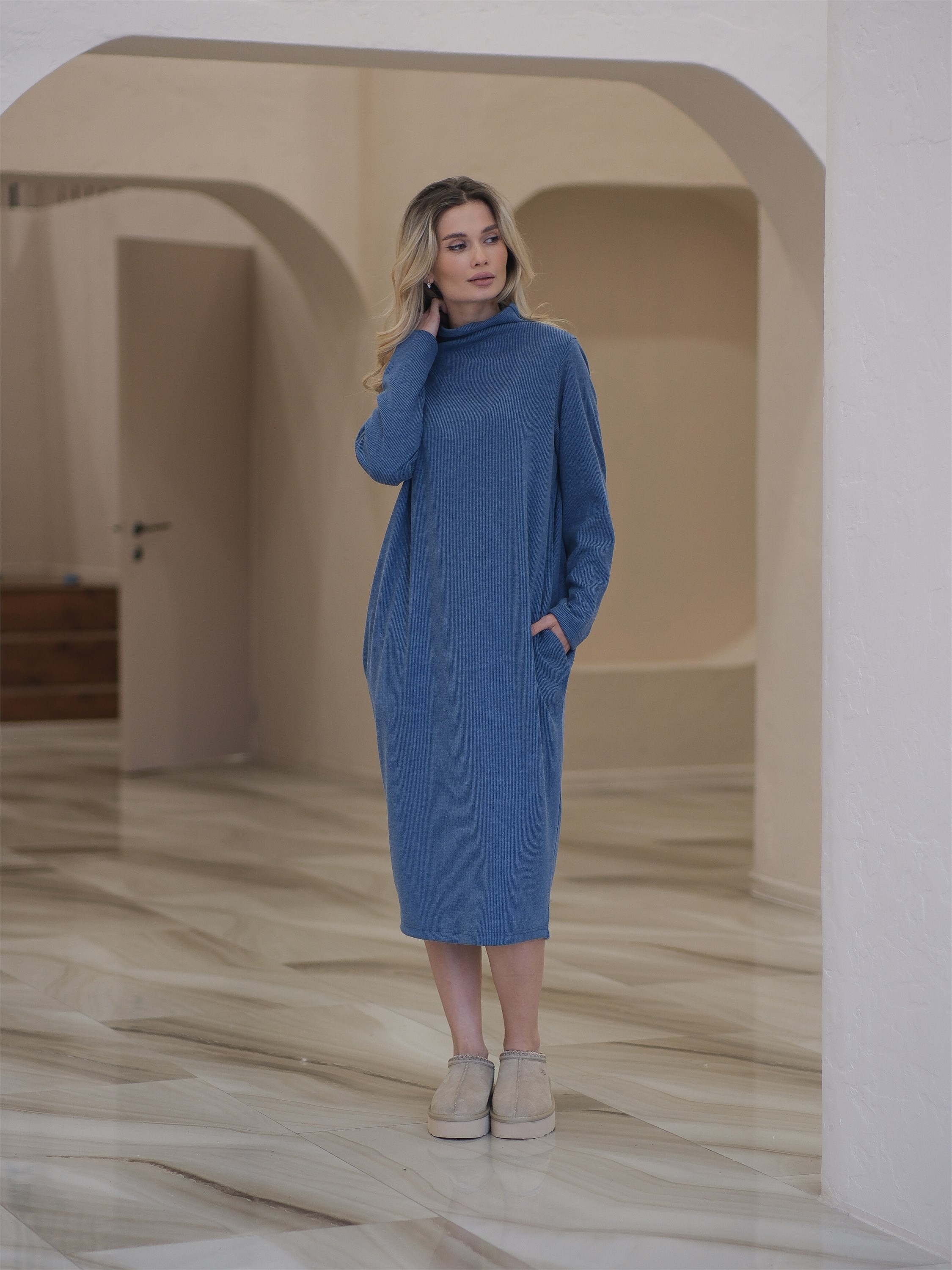 ***Кең силуэтті, жеңі төмен пішілген көйлек. Мойыны тұтас пішімді, ұзындығы балтырға дейін, қалтасы бүйір тігістерінде