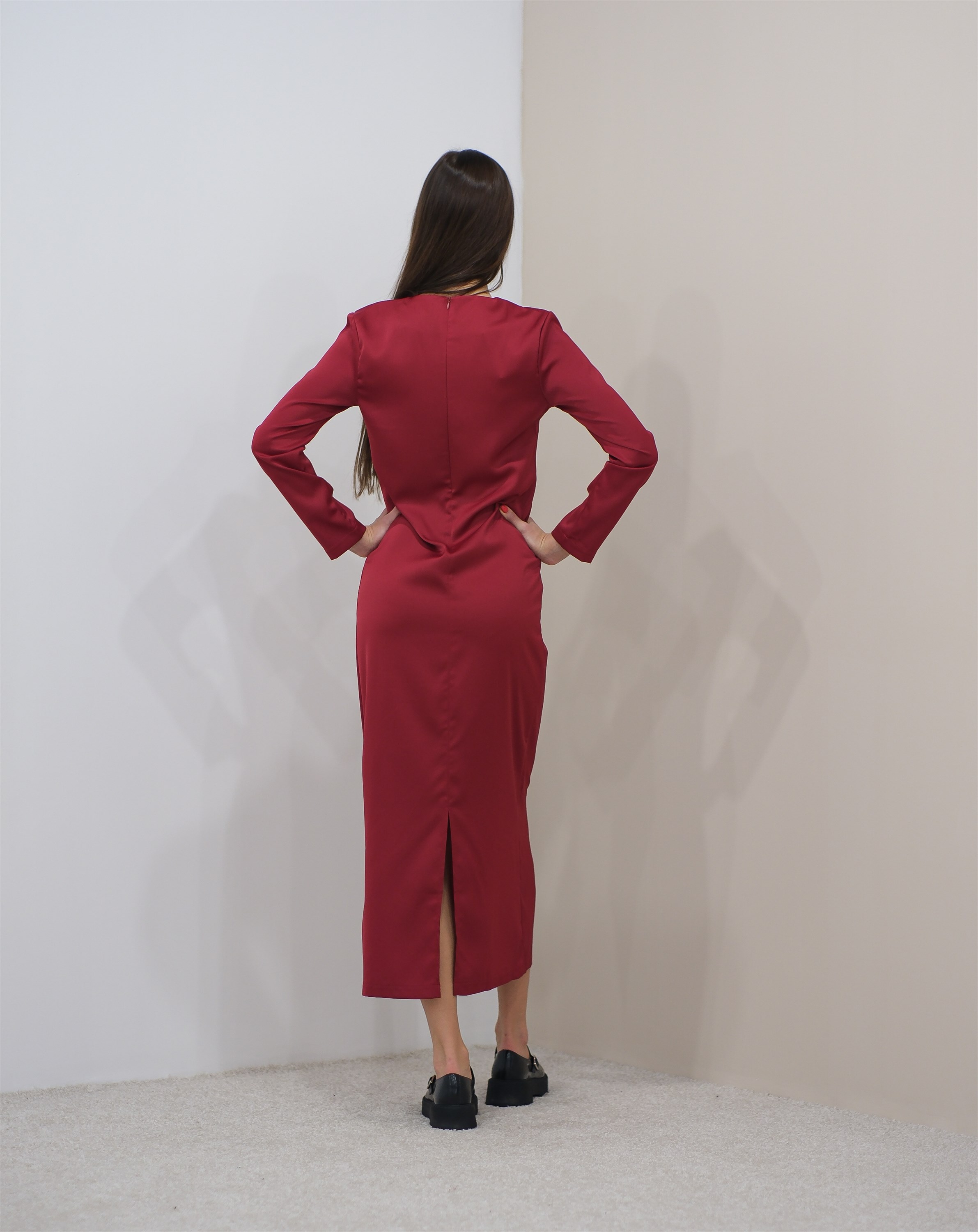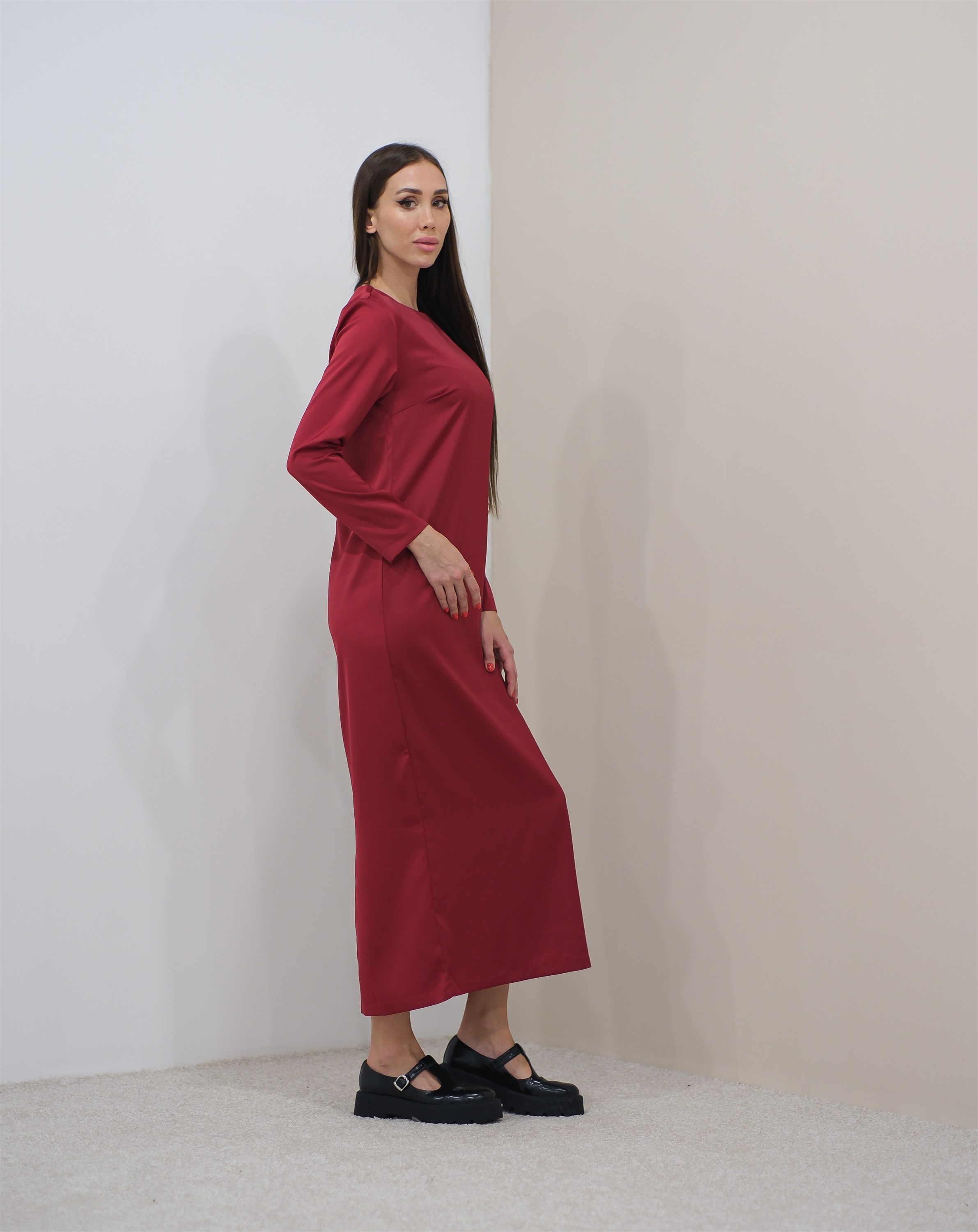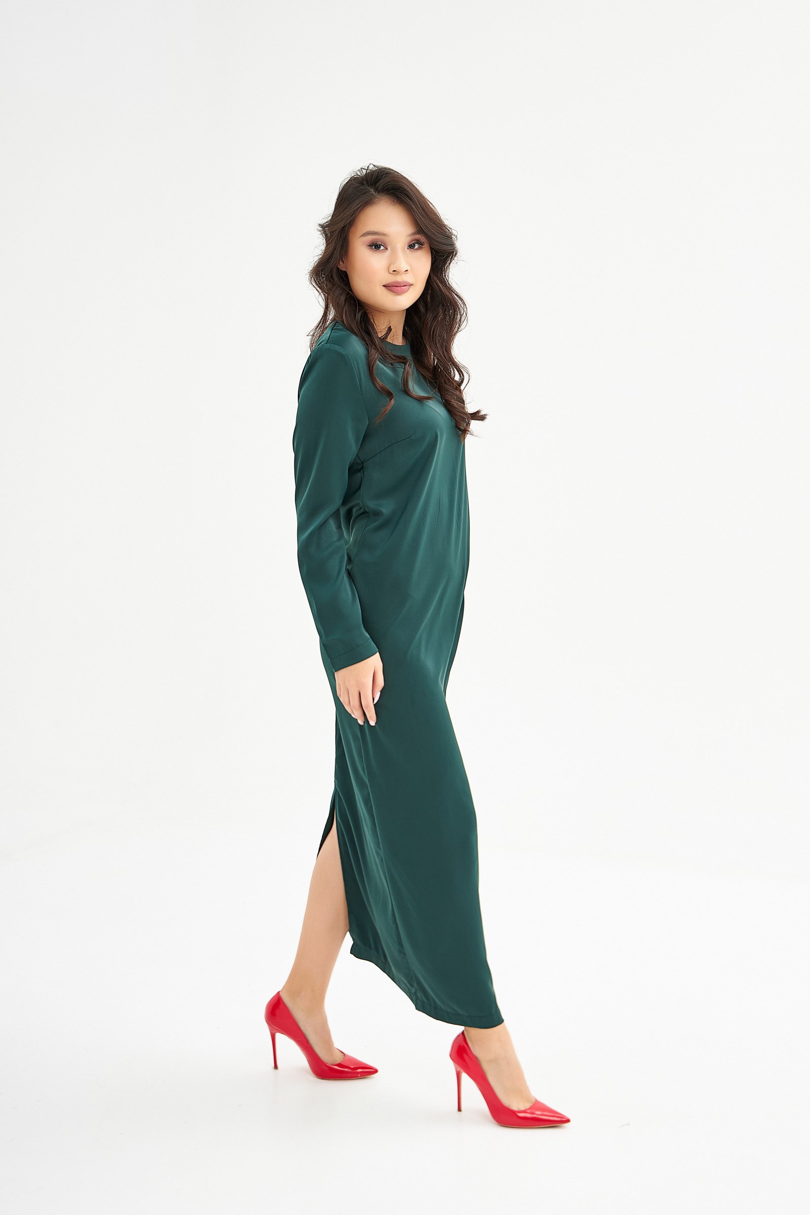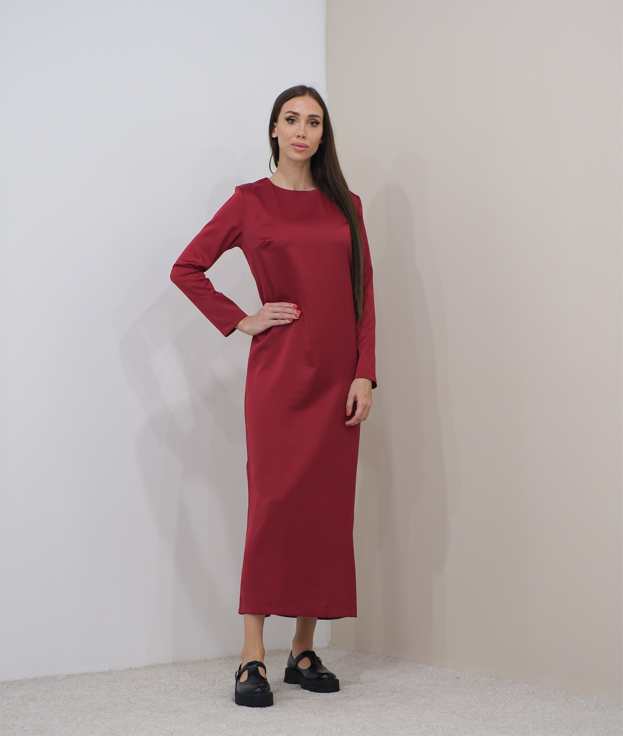 Платье прямого кроя полной длины. Рукава втачные, застежка на молнии по среднему шву спинки.