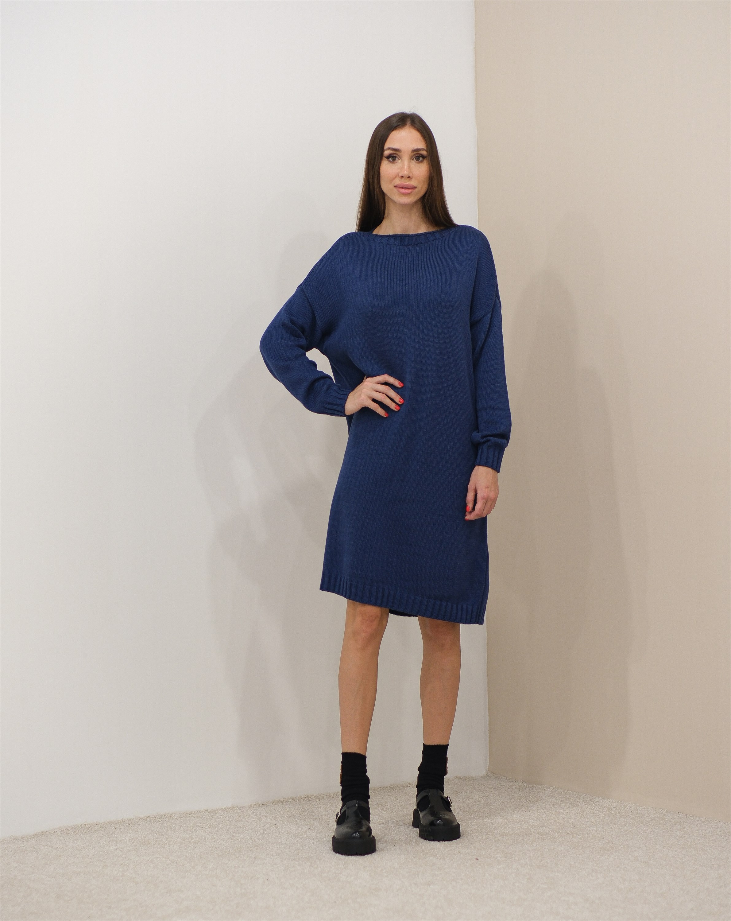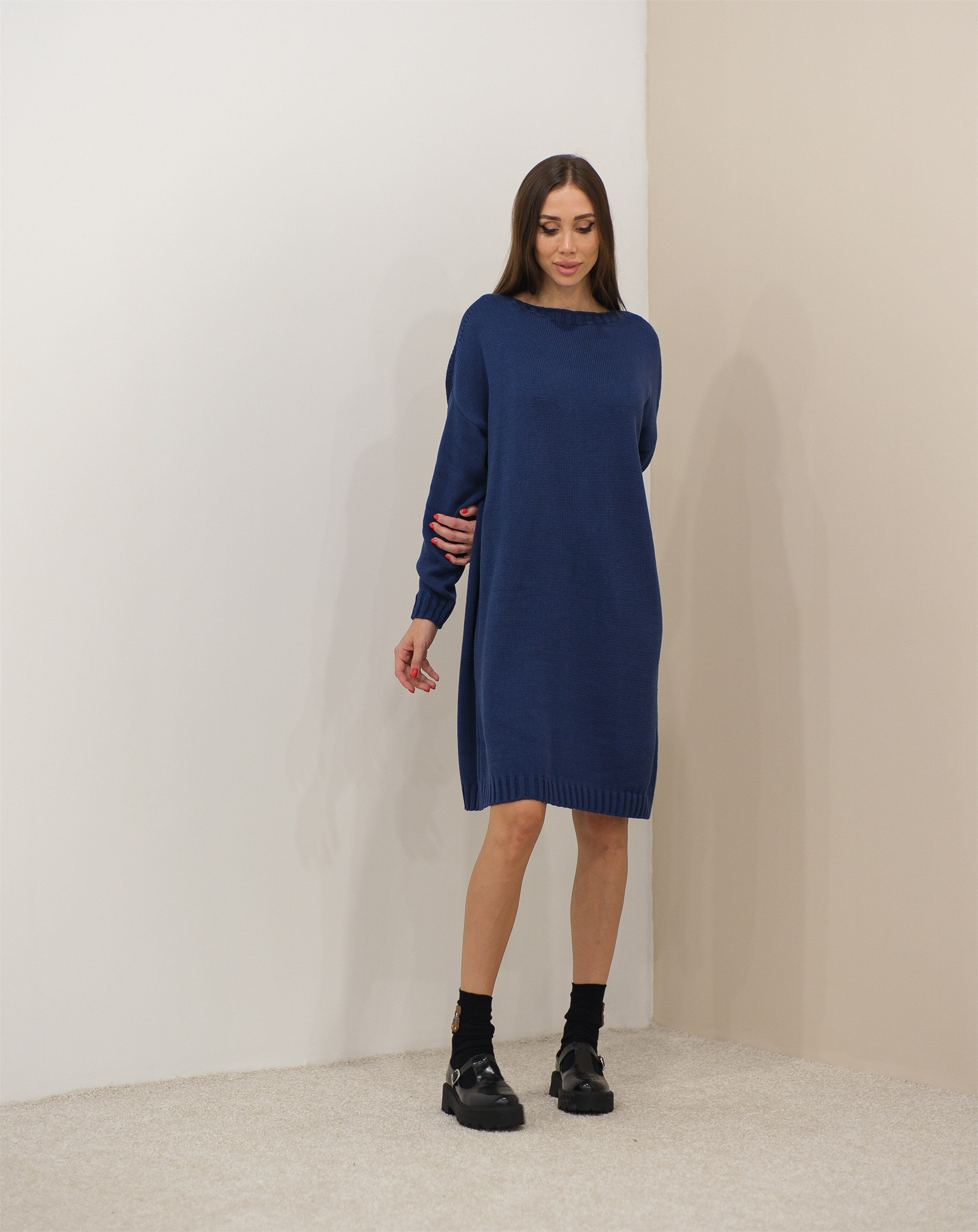 Платье вязаное свободного кроя со спущенным рукавом. Воротник высокий, длина ниже колен.