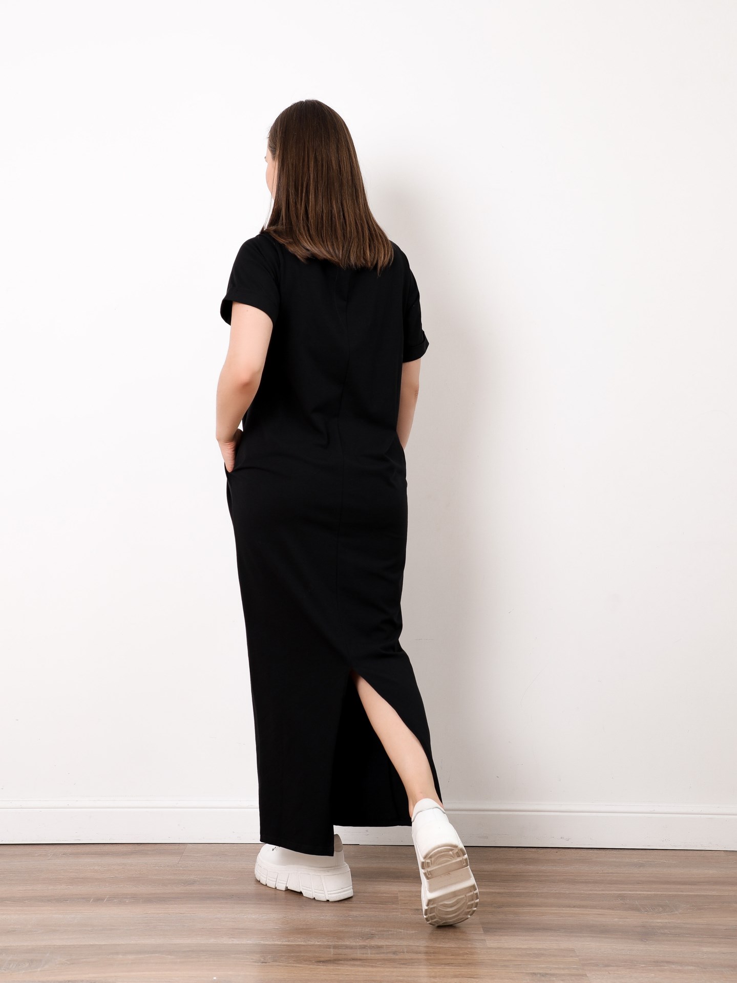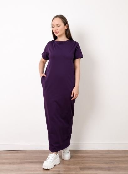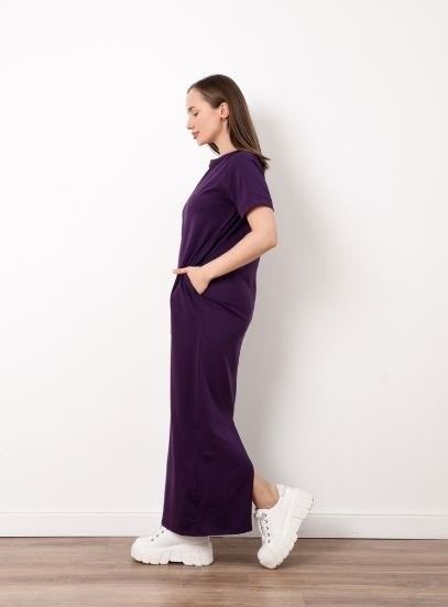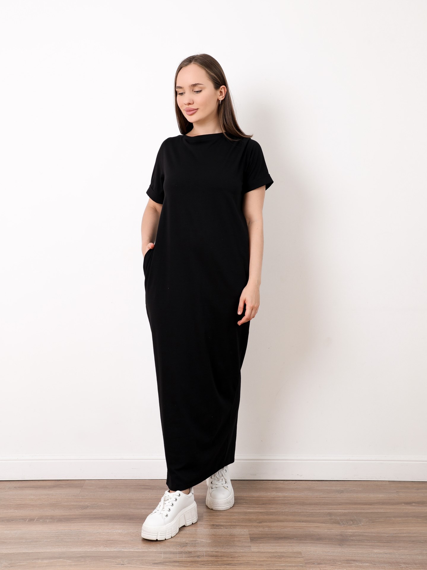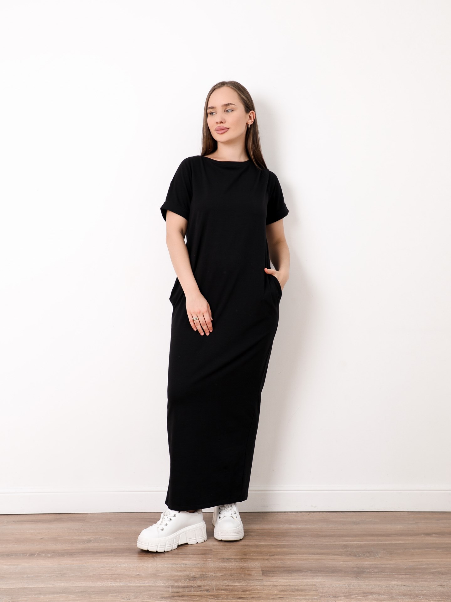 Платье длины макси со втачным рукавом. Вырез горловины "лодочкой", карманы в боковых швах.