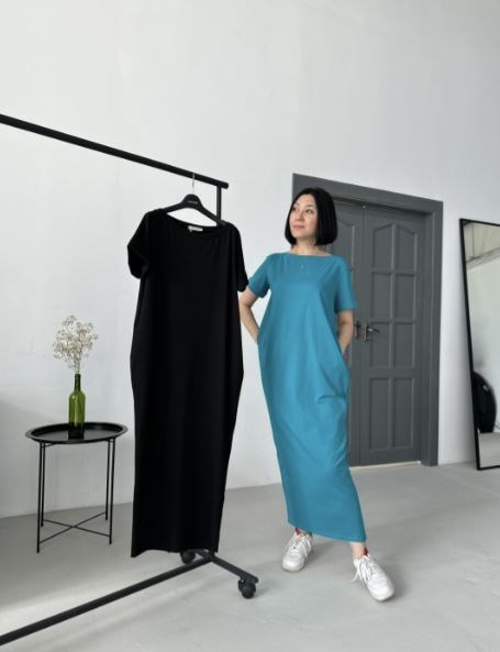 Платье длины макси со втачным рукавом. Вырез горловины "лодочкой", карманы в боковых швах.