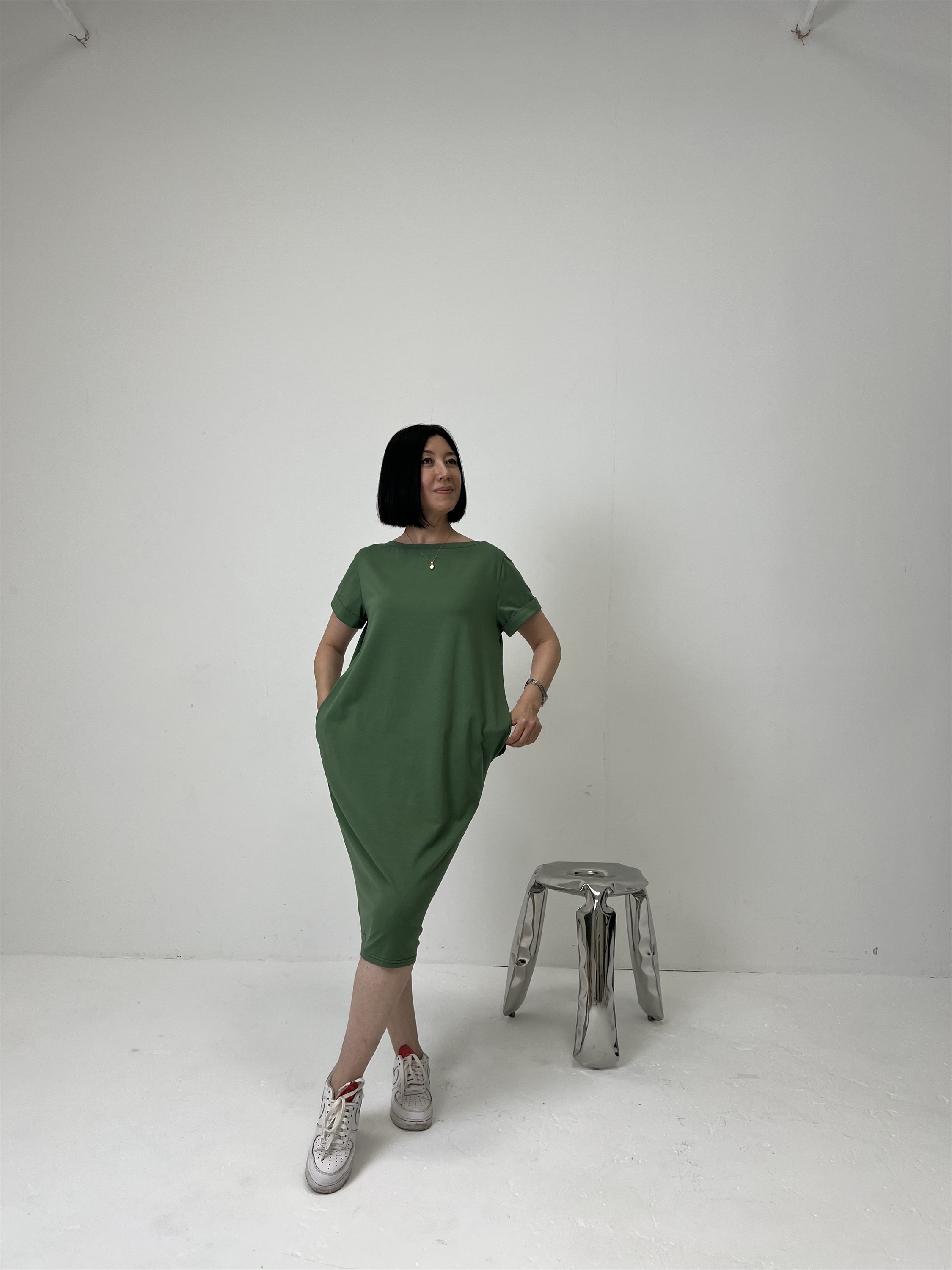 Платье из хлопкового высококачественного трикотажа длины миди с втачным укороченным рукавом. Вырез горловины "лодочкой", карманы в боковых швах.Модель представлена в черном, ярко-оранжевом, насыщенном голубом и теплом зеленом цветах.Размерная линейка от 44 до 52р.