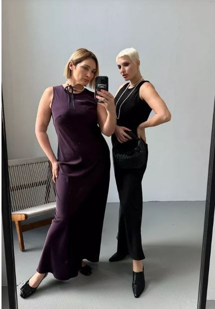 Платье,являющееся идеальной комбинацией базовой вещи и праздничного наряда, изготовлено из высококачественного японского шелка, обладающего неповторимым блеском и изяществом.Модель имеет полуприлегающий силуэт, благодаря крою ткани по косой отлично тянется и красиво драпируется.Горловина круглая, брители широкие, длина платья макси. Размерная линейка от 44 до 52 размеров.Модель представлена в двух расцветках-элегантный черный и глубокий баклажановый цвет.