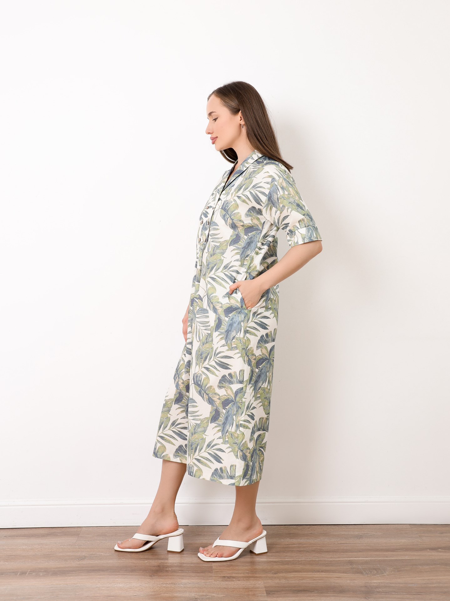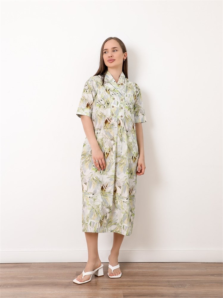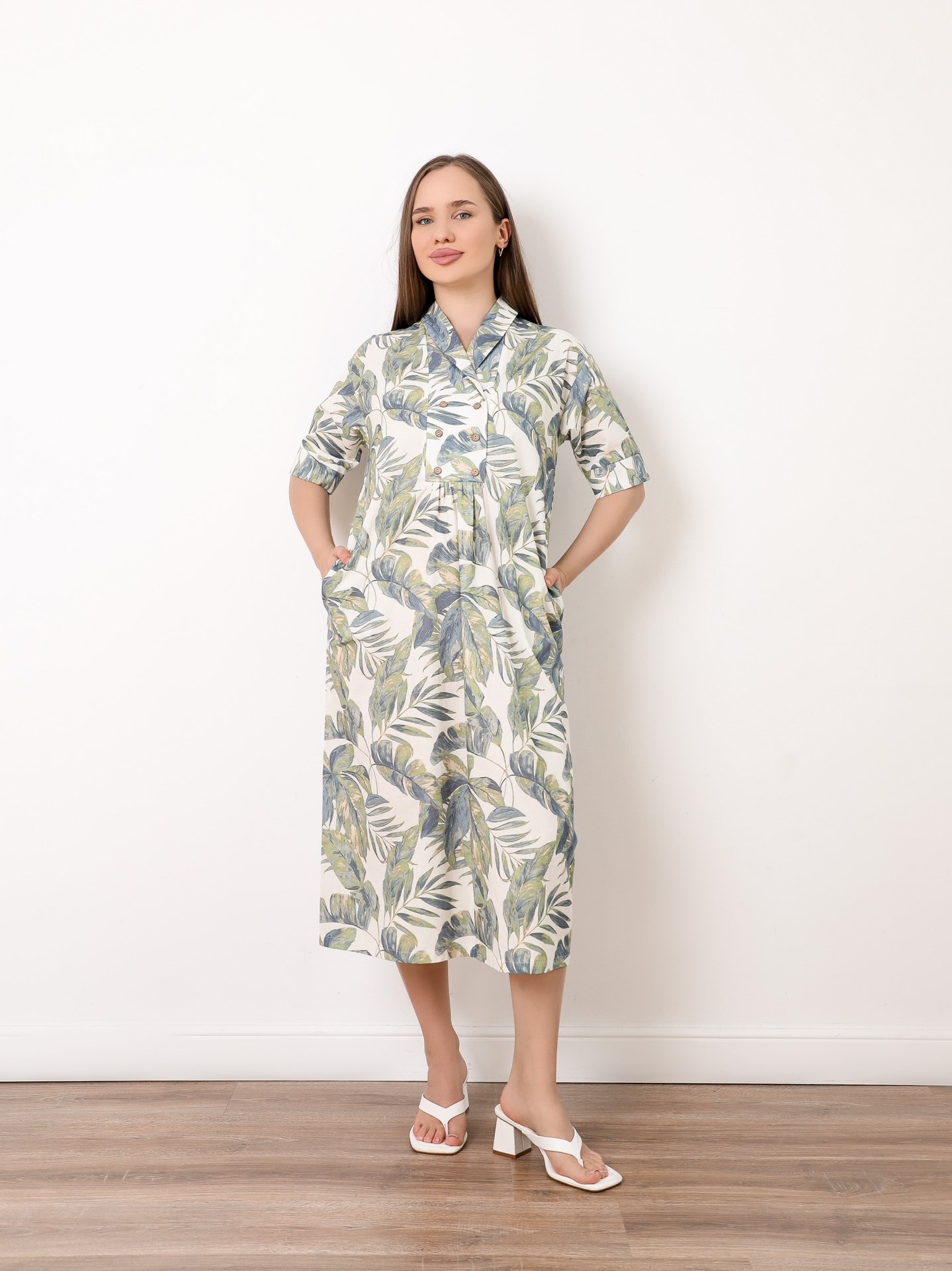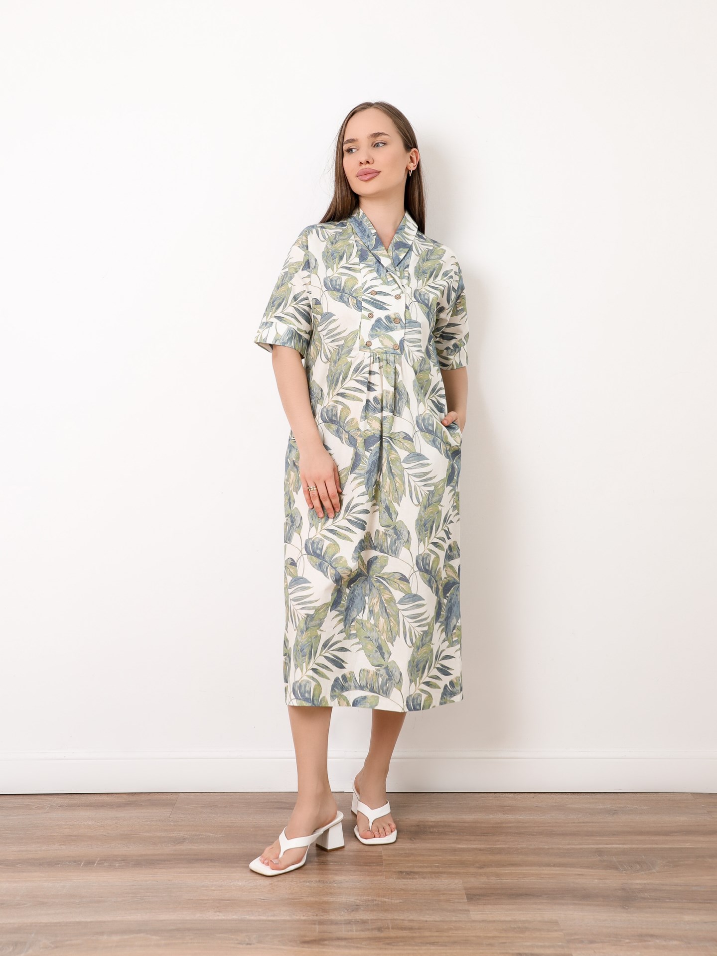 Платье свободного кроя с шалевым воротником и запахом на пуговицах. Рукав втачной с манжетом, в боковых швах карманы. Сборки на линии талии по юбке платья, длина миди