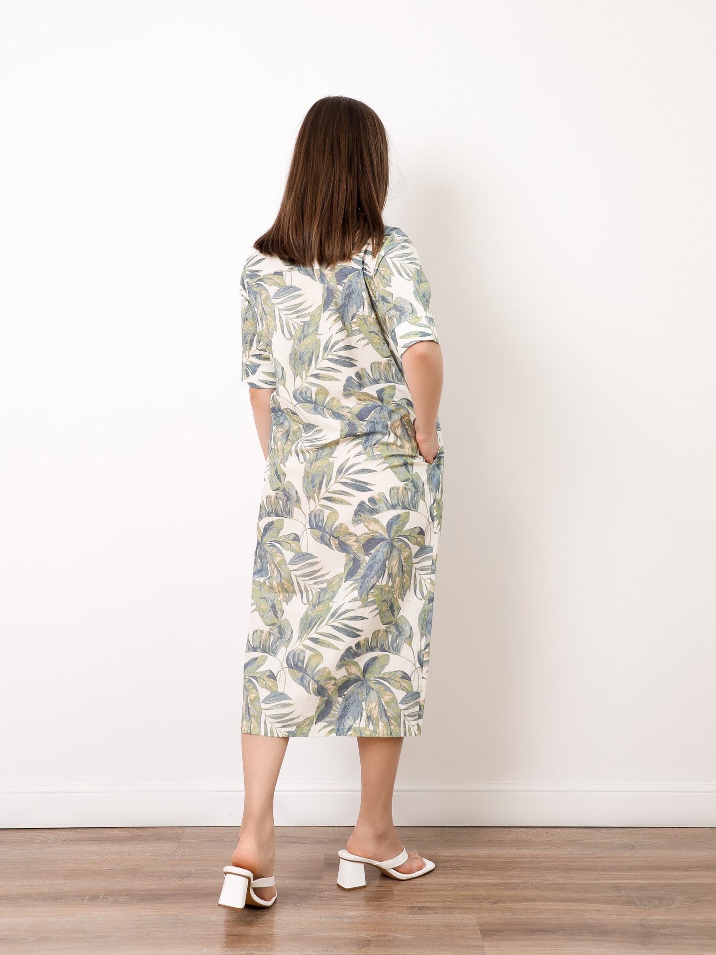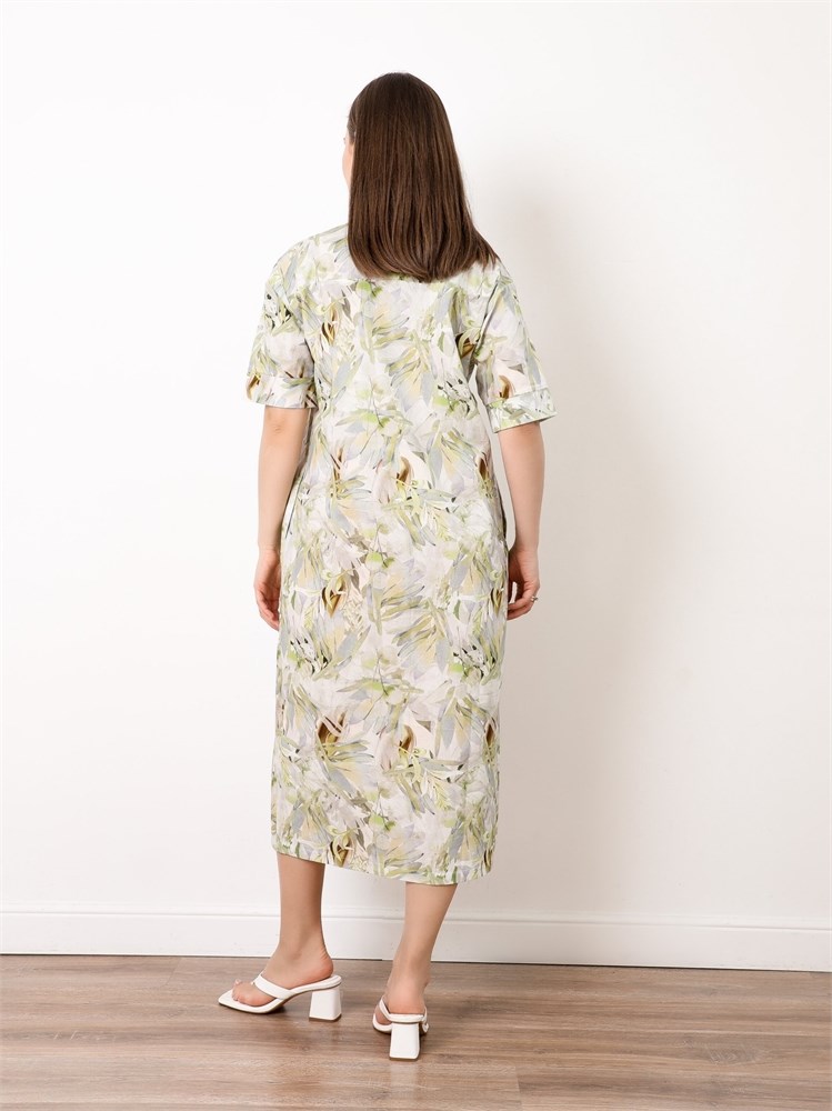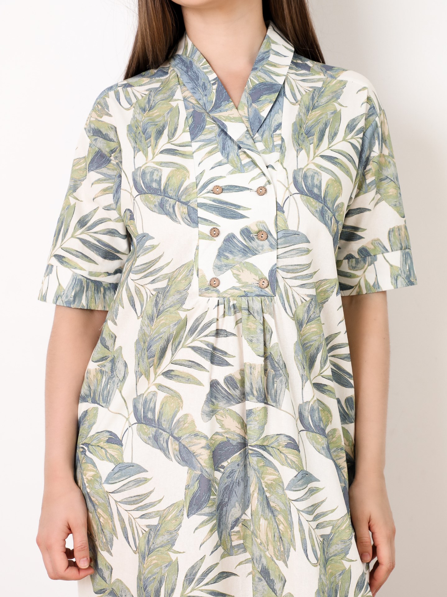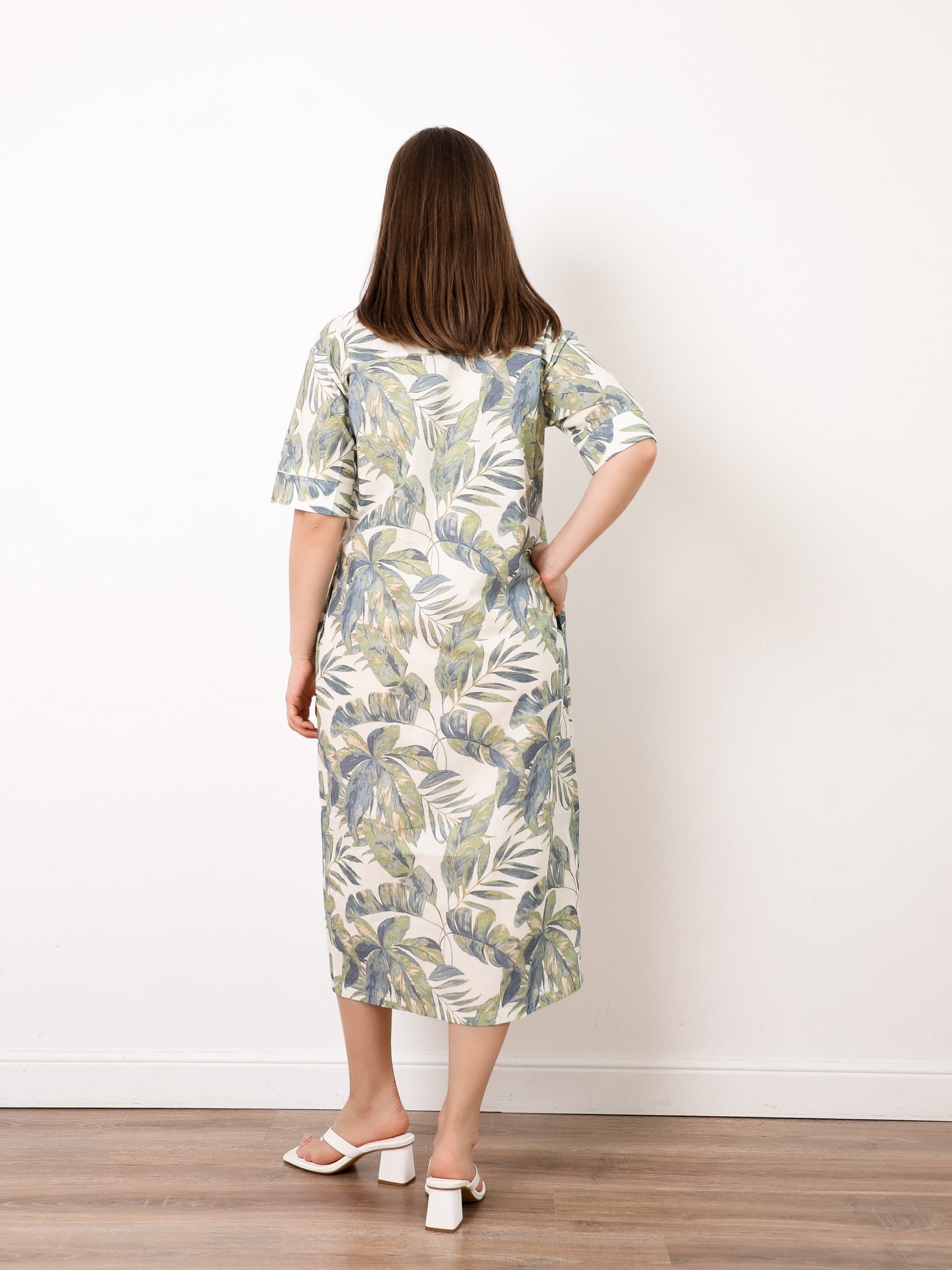 Платье свободного кроя с шалевым воротником и запахом на пуговицах. Рукав втачной с манжетом, в боковых швах карманы. Сборки на линии талии по юбке платья, длина миди