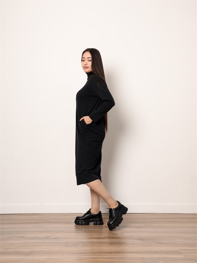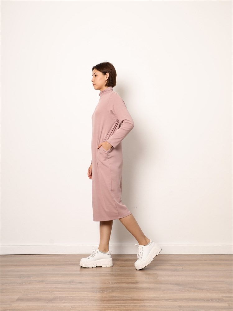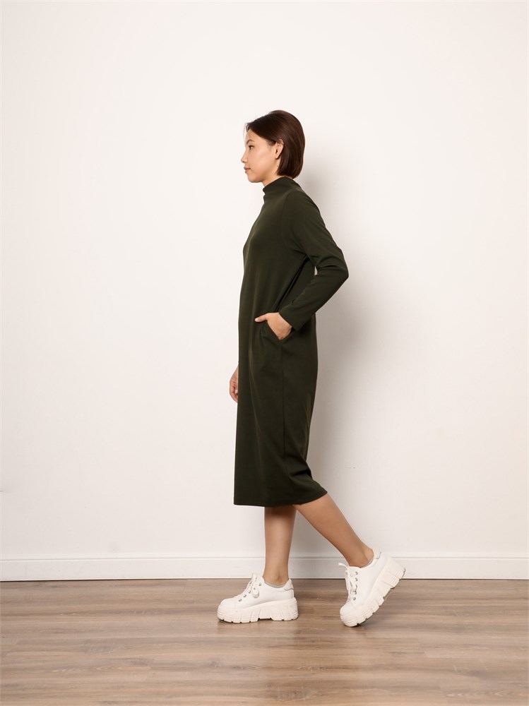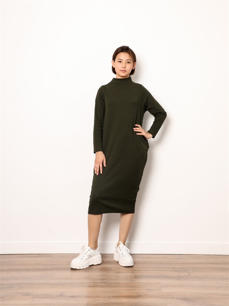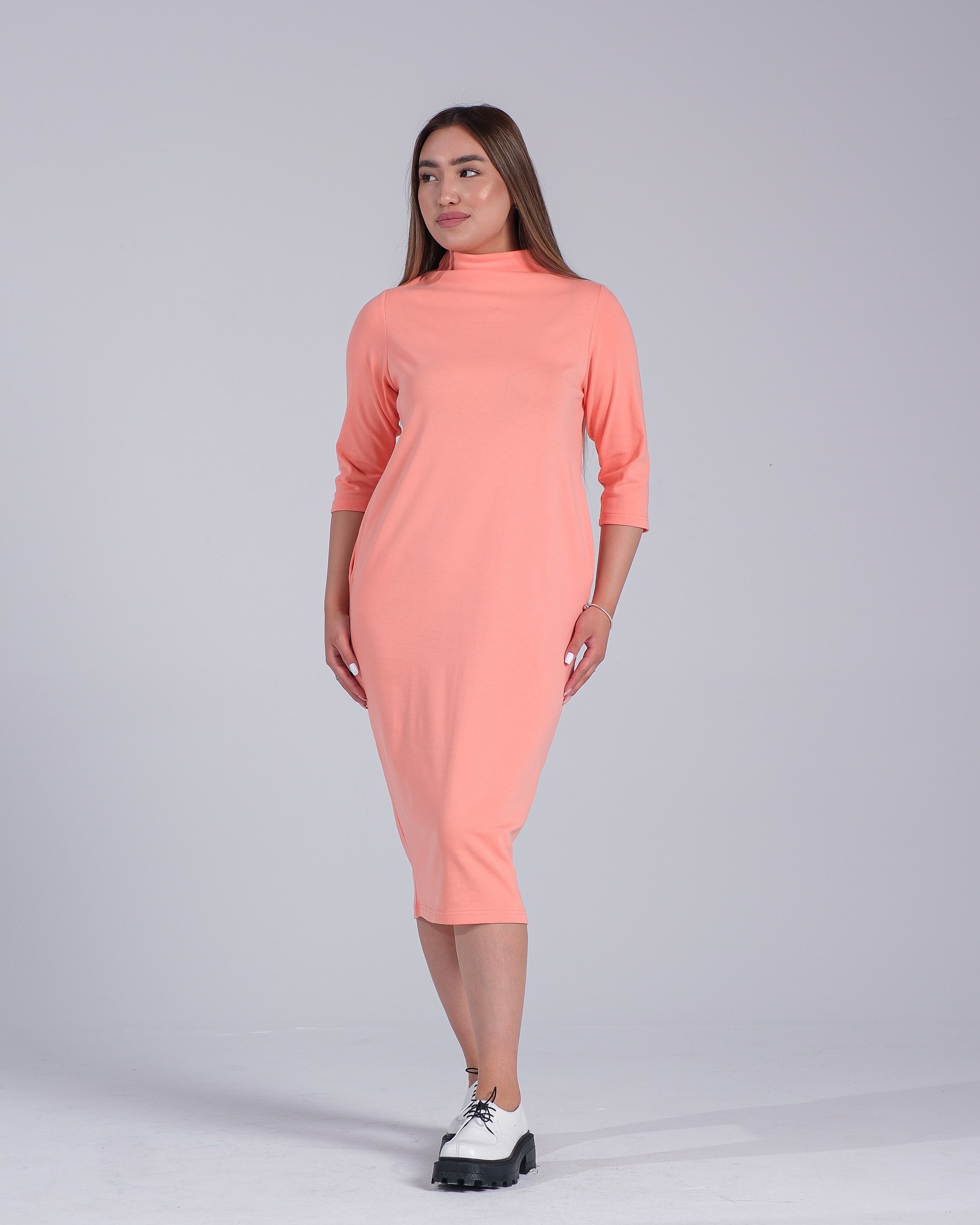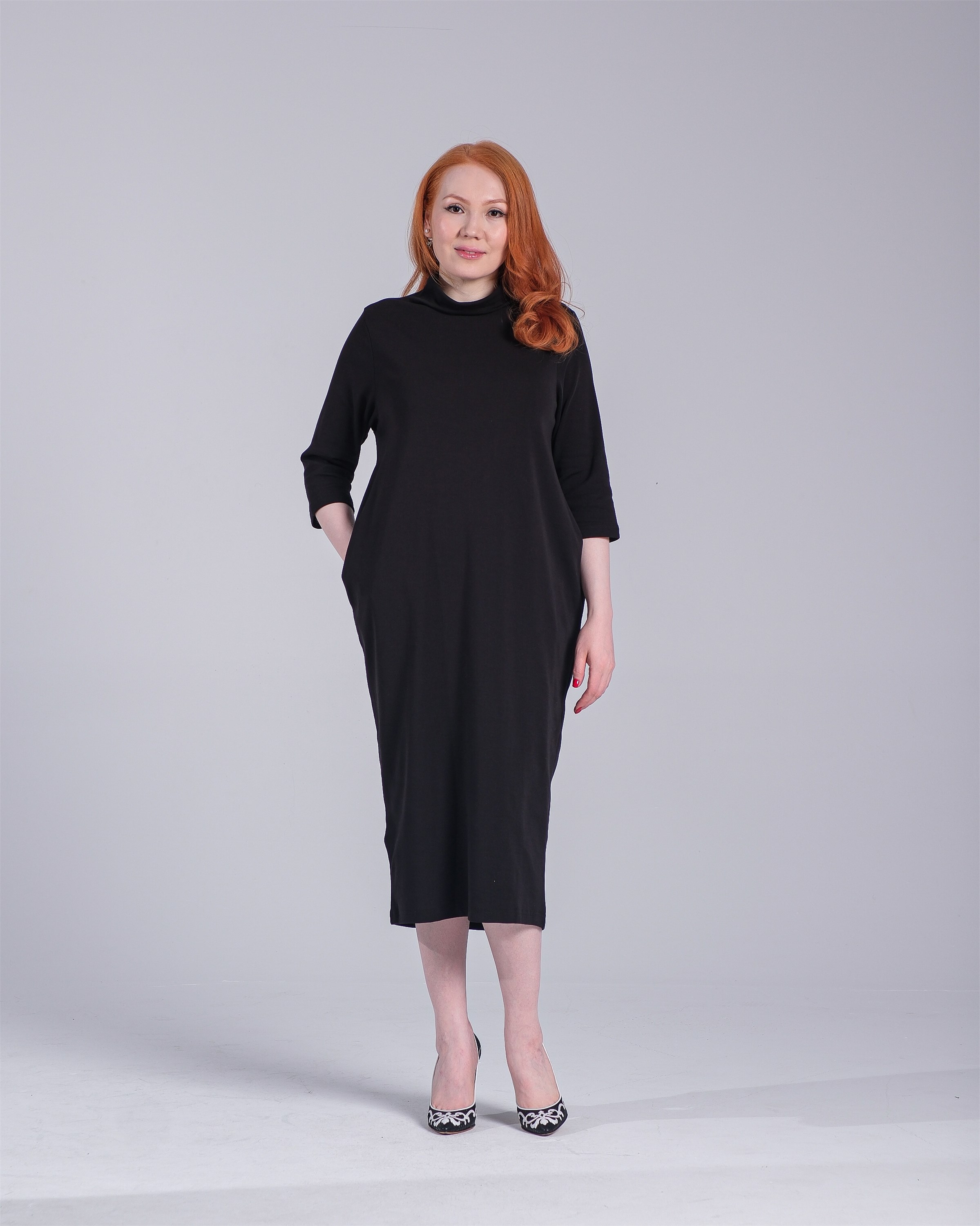 ***Трикотаж матасынан иығы төмен пішімді көйлек. Жағасы биік, қалтасы бүйір тігісінде. Бұйым ұзындығы балтырға дейін