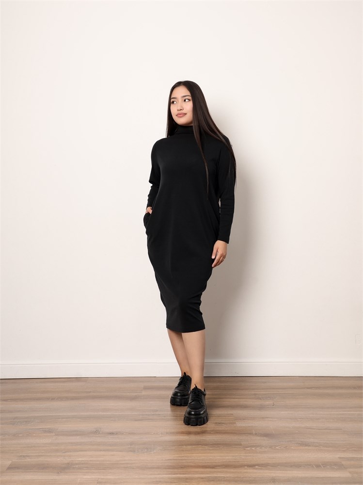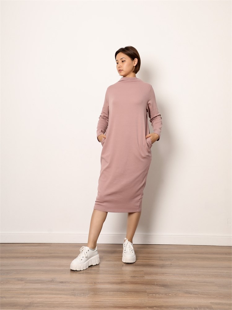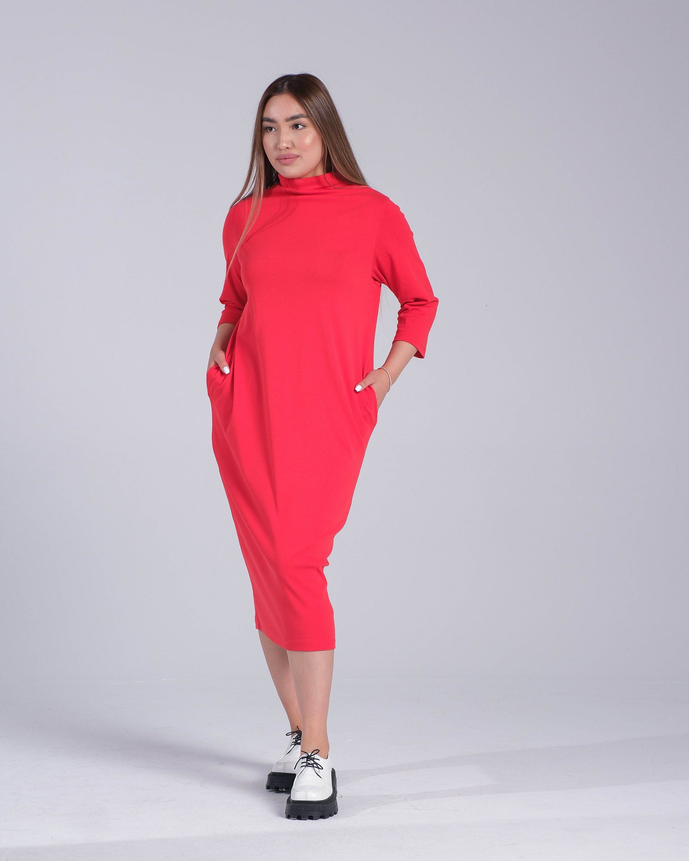 Платье трикотажное свободного кроя длины миди. Воротник цельнокроеная стойка, линия плеча спущена, рукав втачной, карманы в боковых швах.Сезон осень-весна.