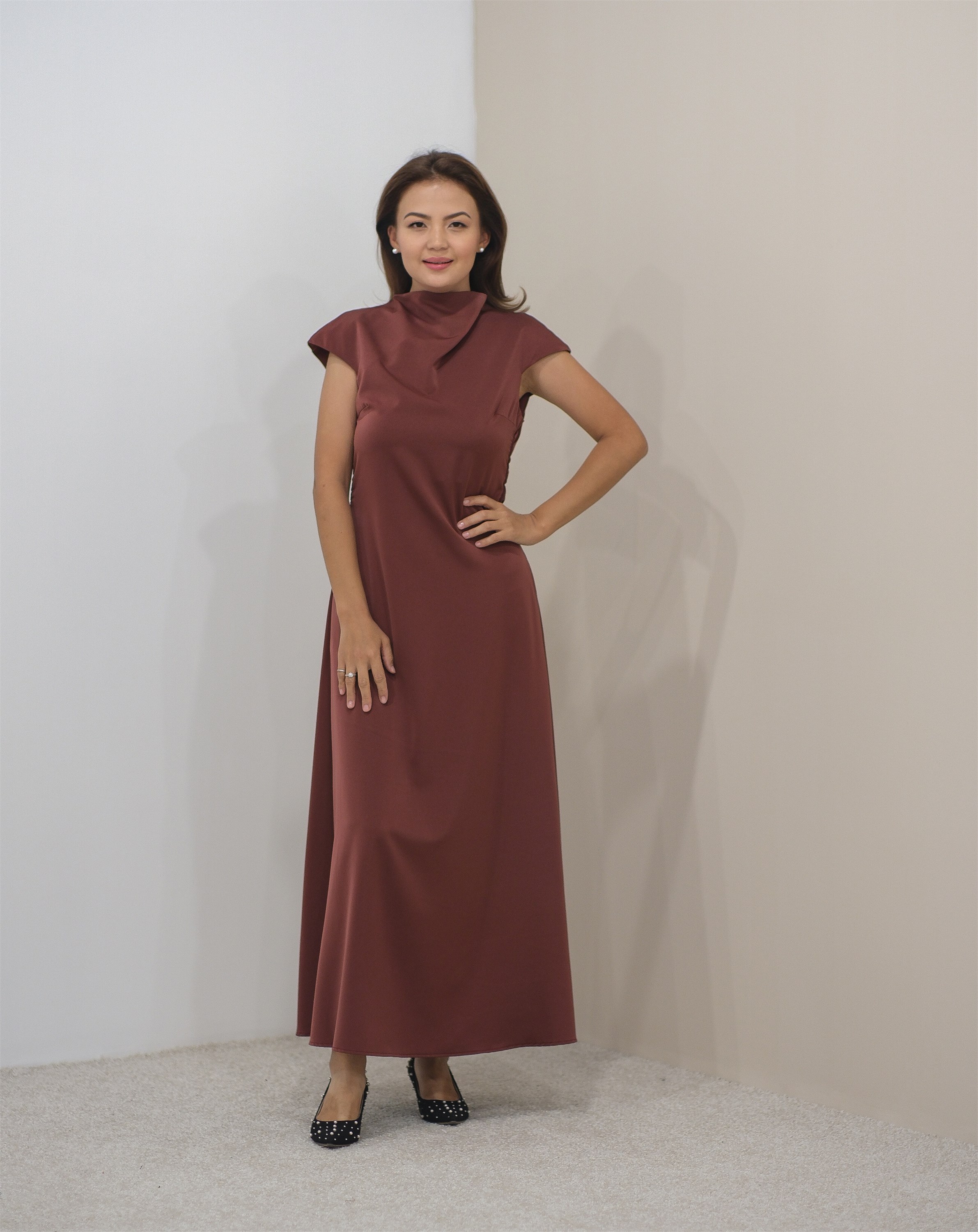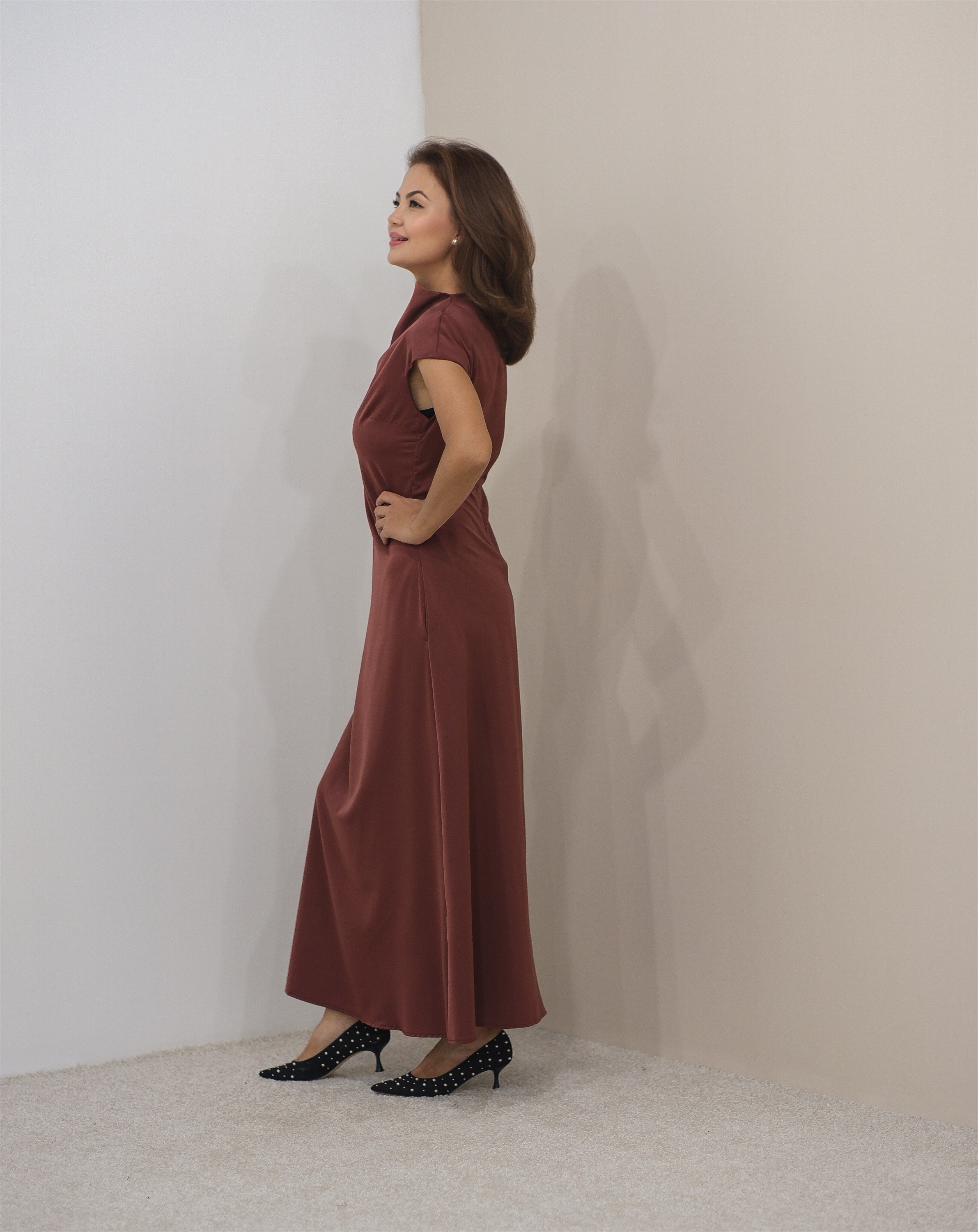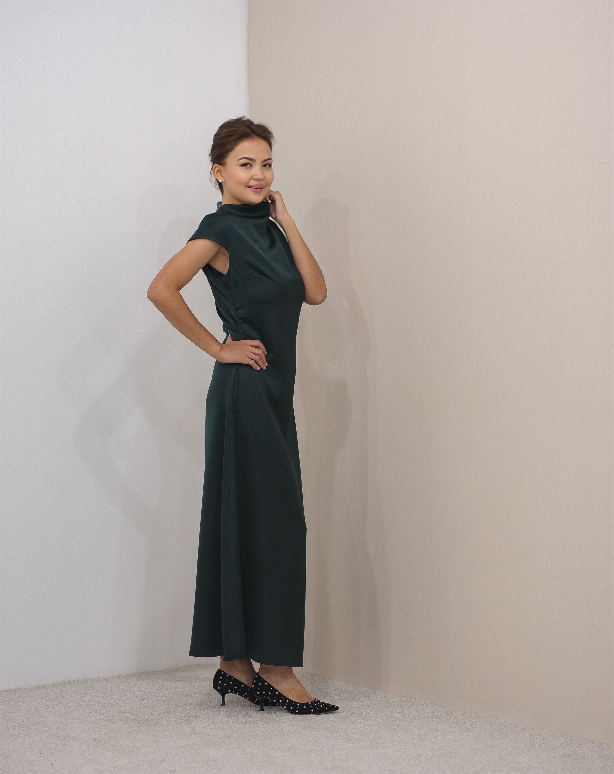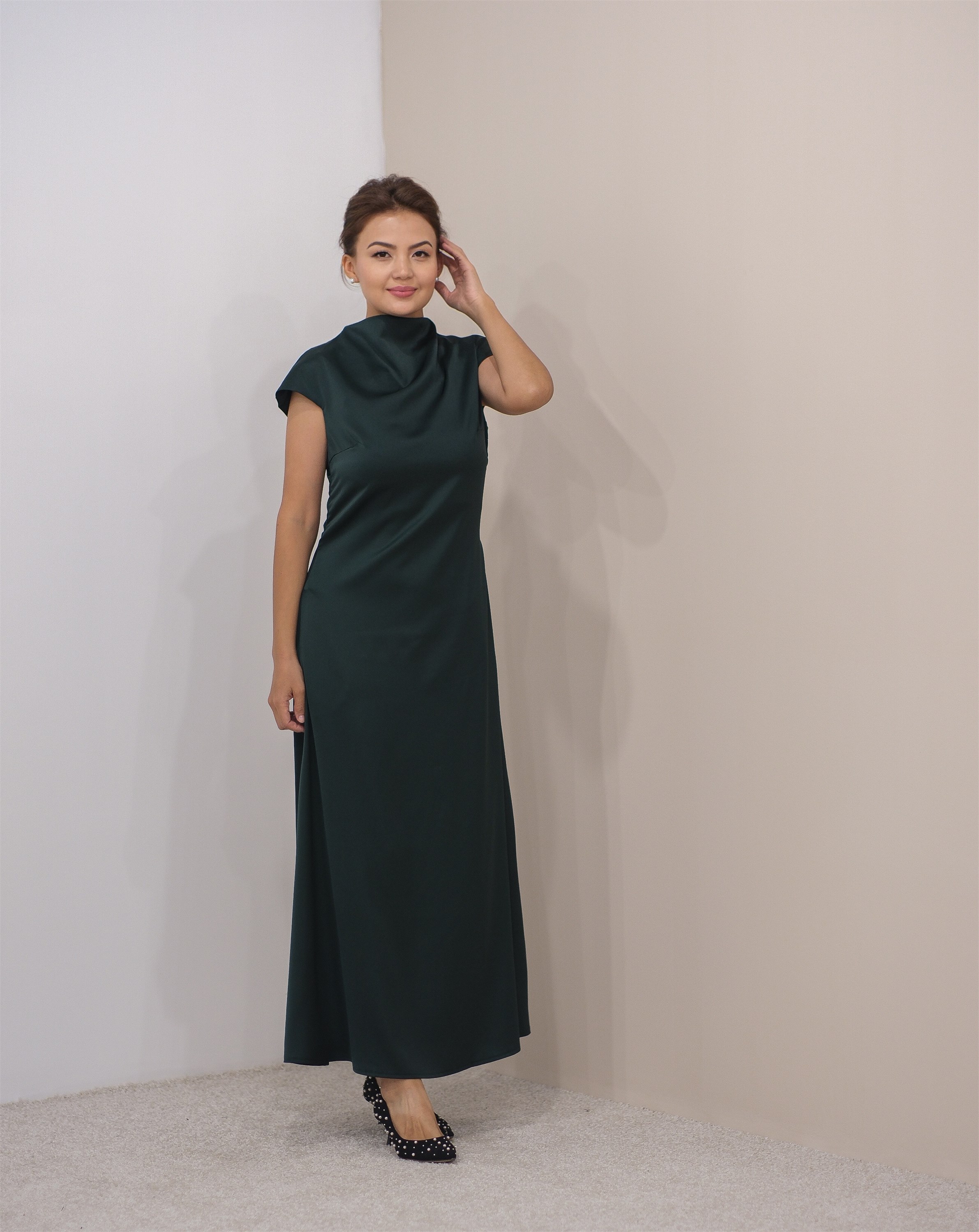 Платье приталенное с цельнокроеным воротником и рукавом. Застежка на молнии по среднему шву спинки, длина макси.