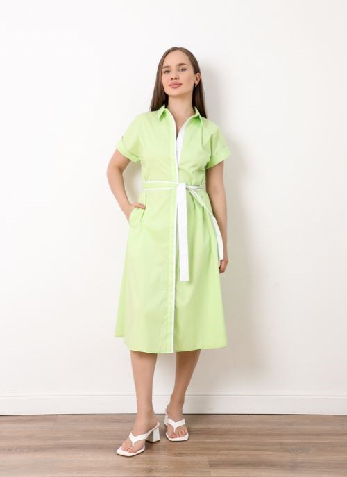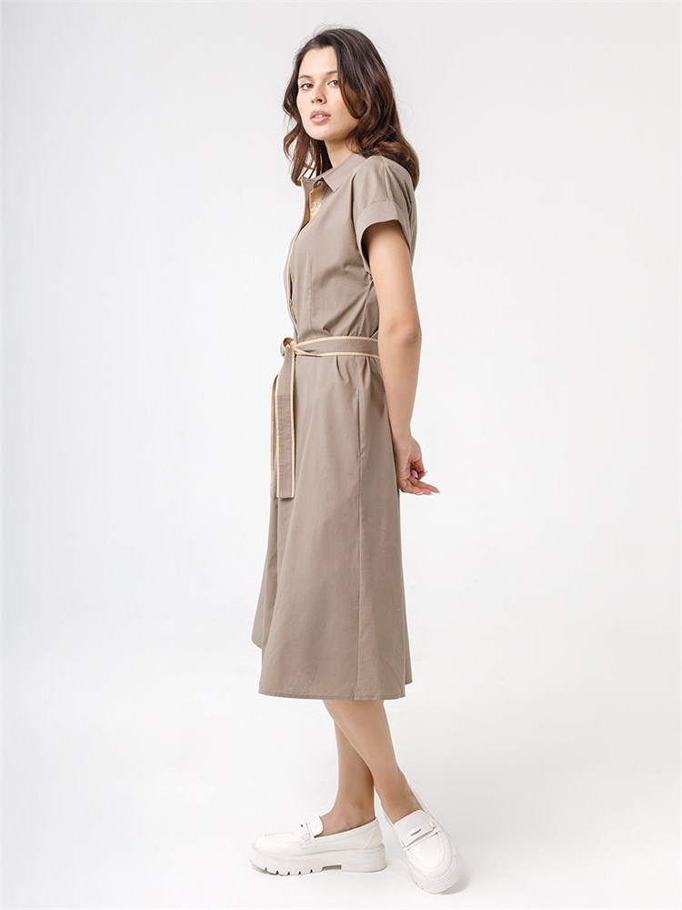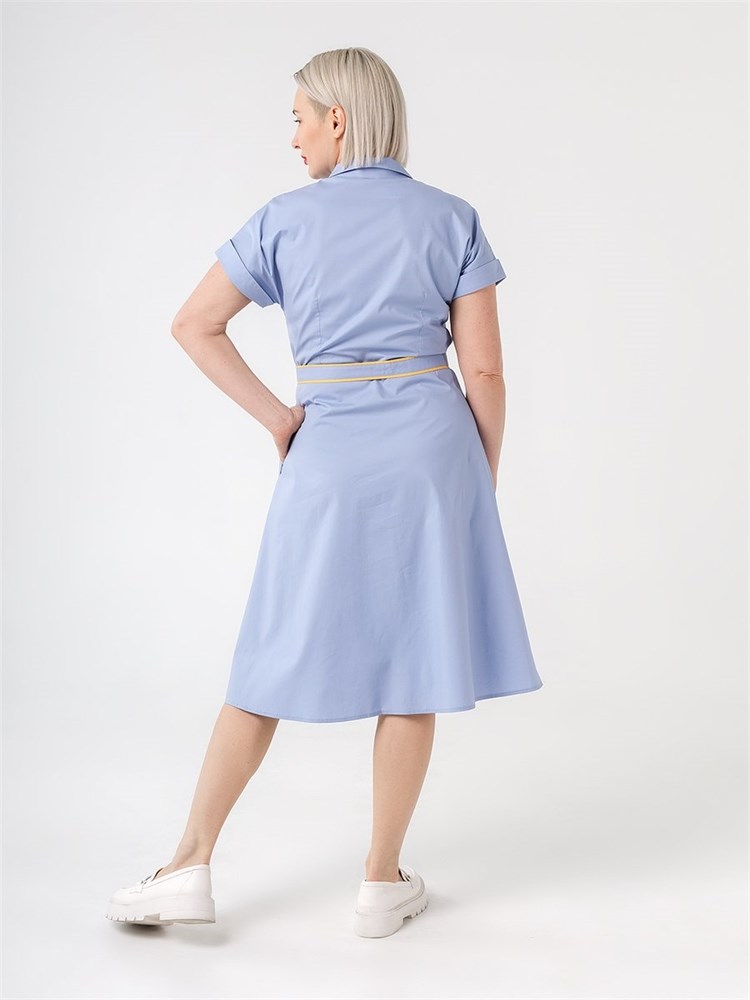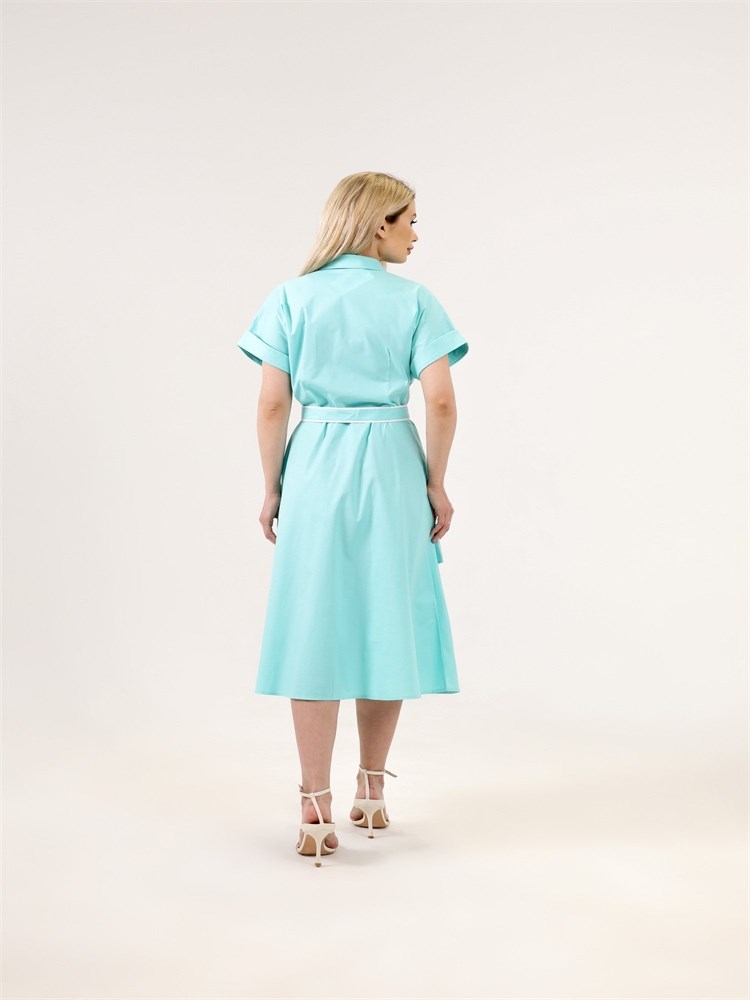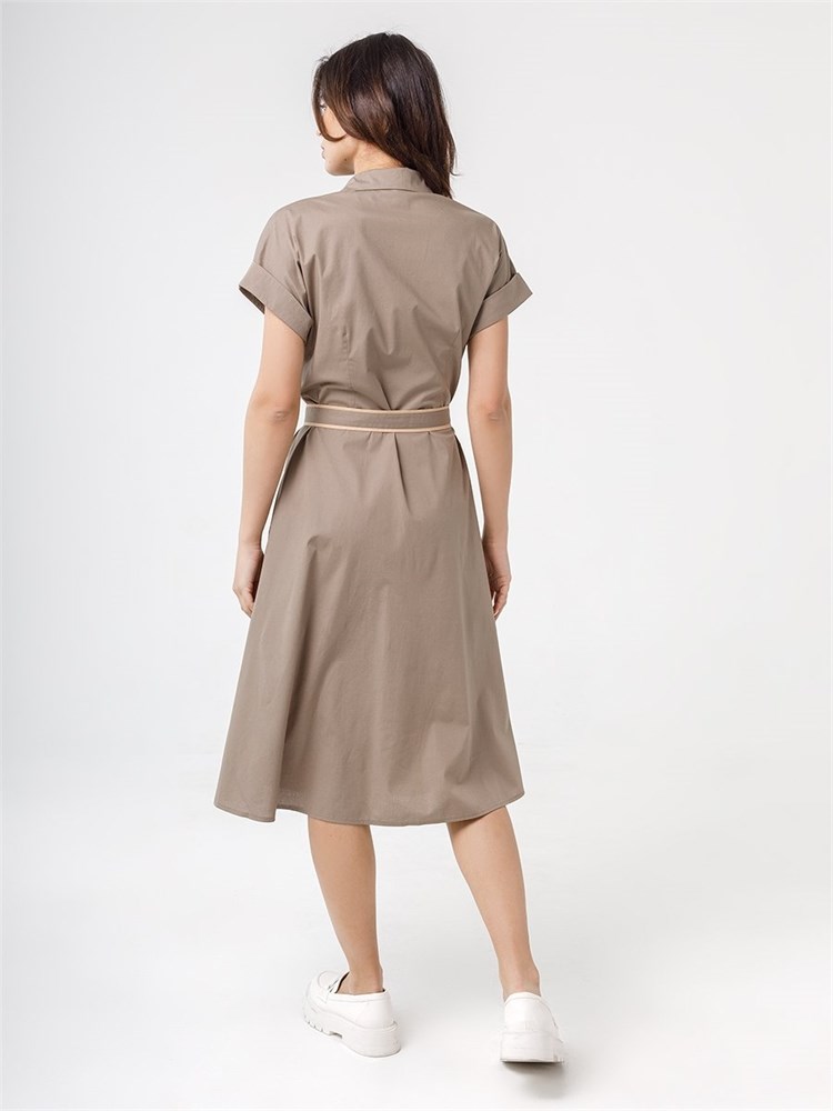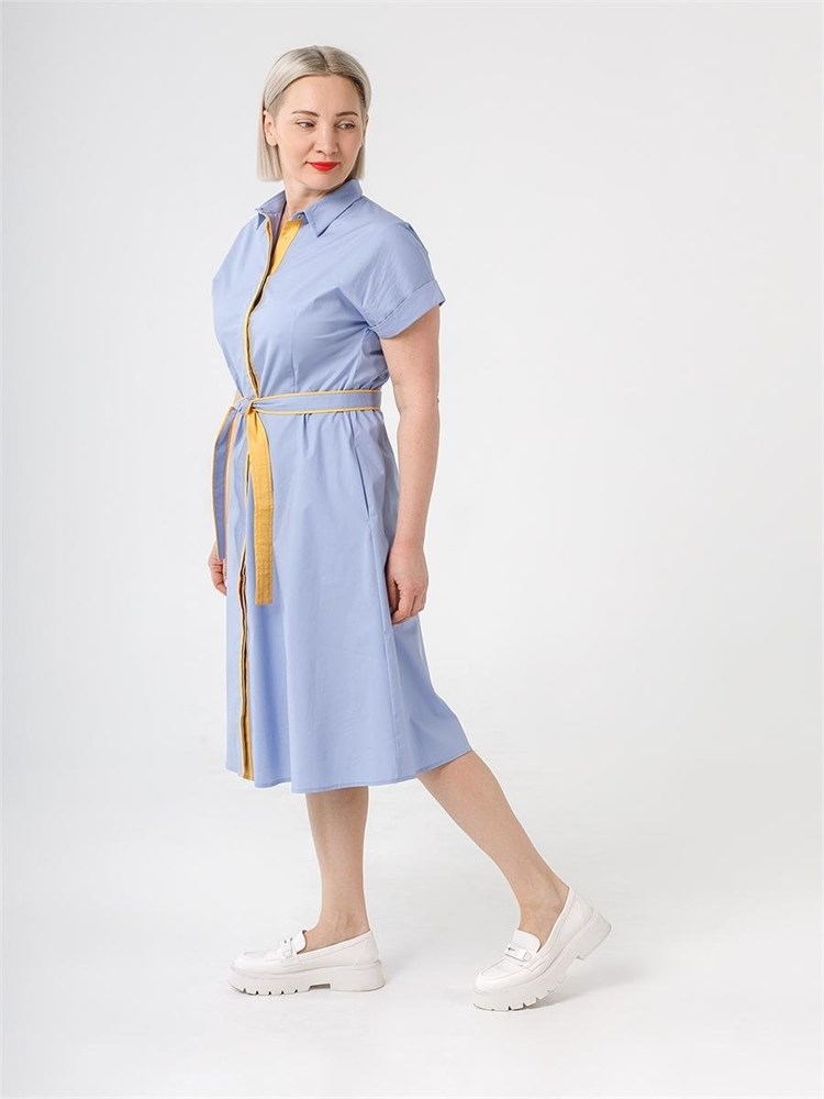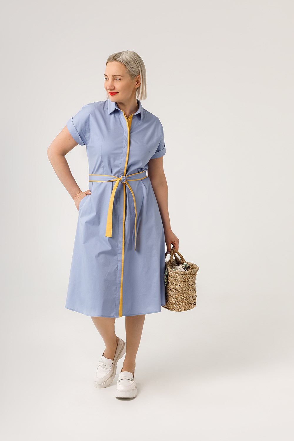 Платье-рубашка из хлопка со съемным поясом. Рукав цельнокроеный с воротником "стойкой", сулпатной застежкой на планке и карманами в шве. Платье приталеное с расклишением к низу