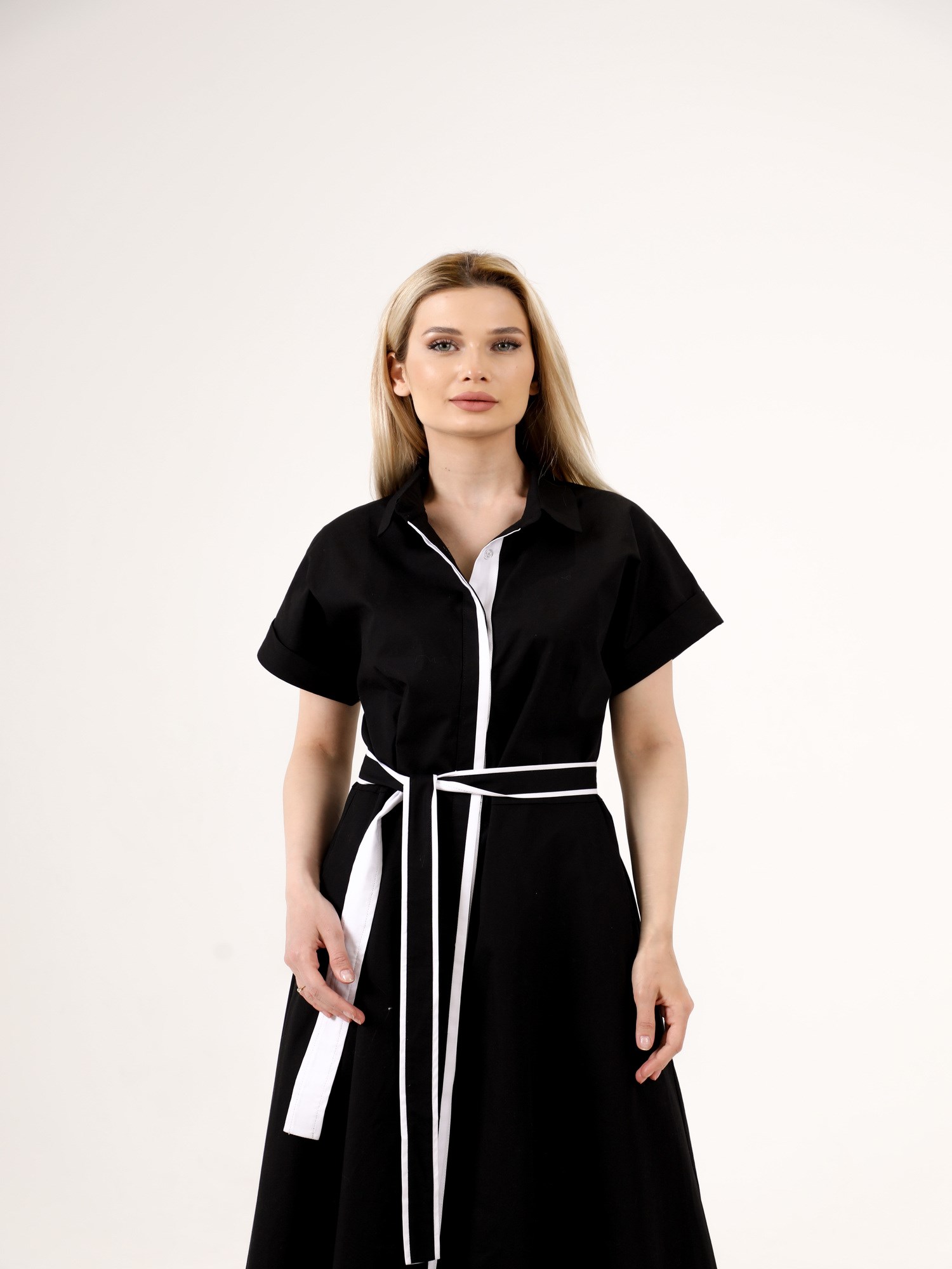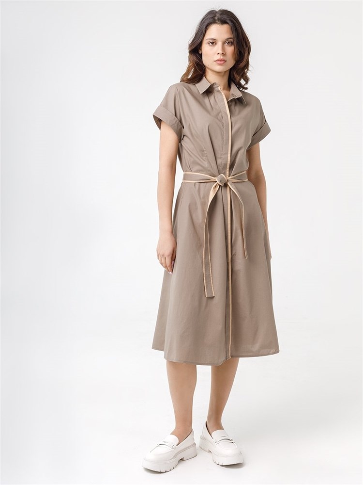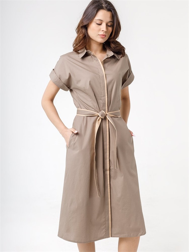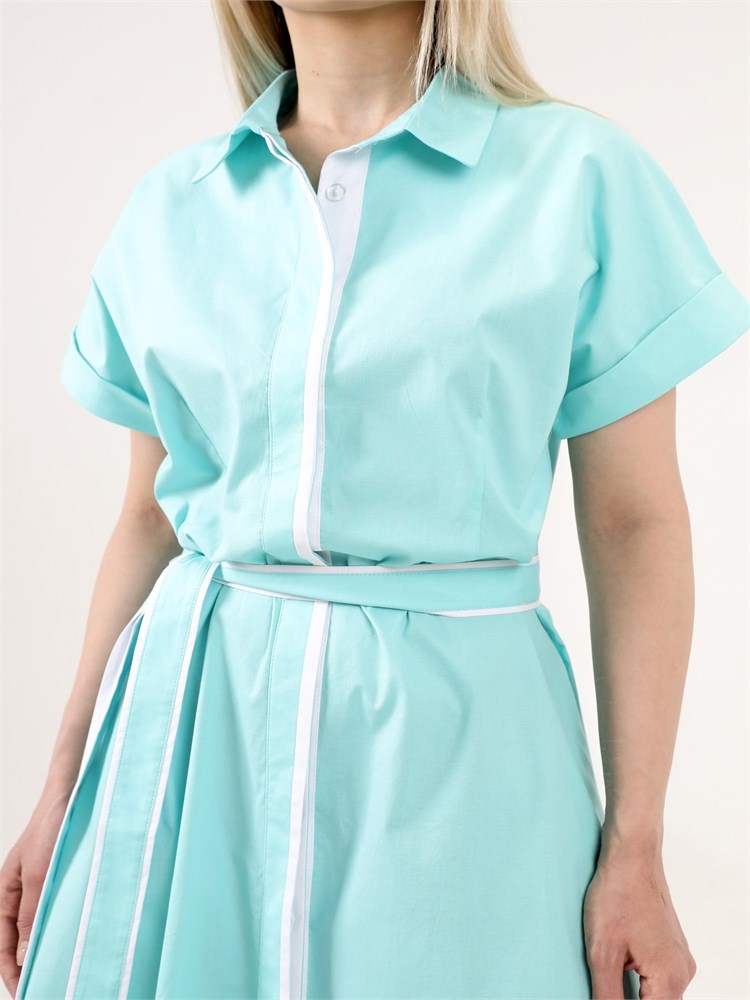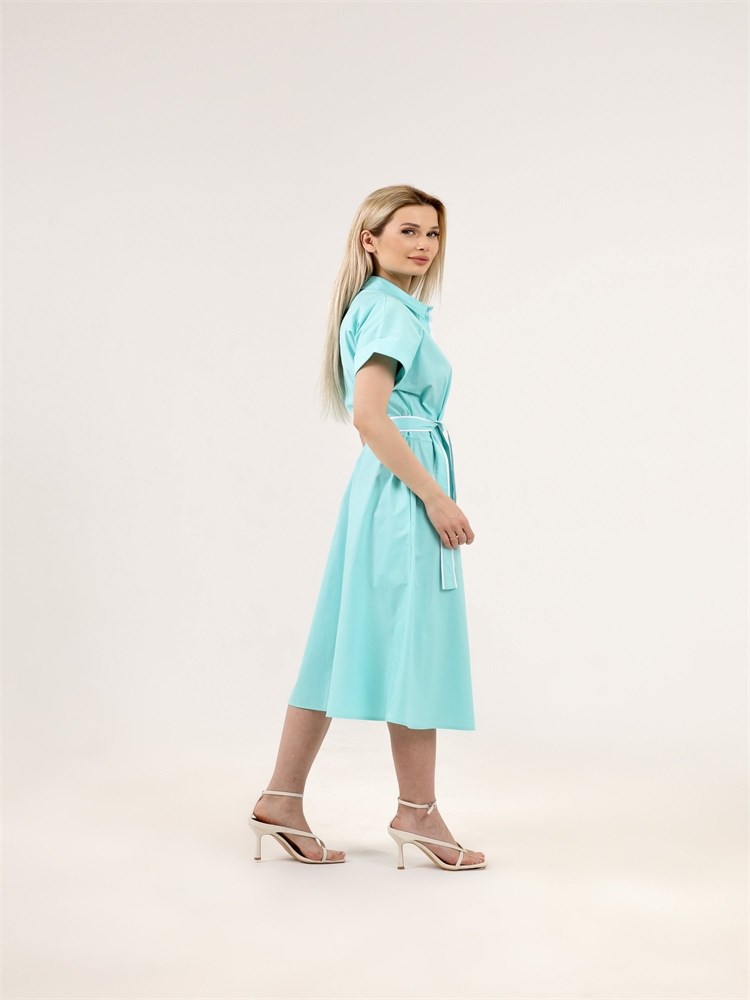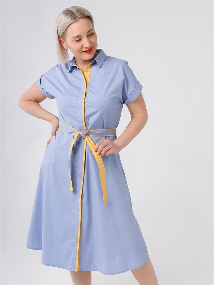 Платье-рубашка из хлопка со съемным поясом. Рукав цельнокроеный с воротником "стойкой", сулпатной застежкой на планке и карманами в шве. Платье приталеное с расклишением к низу