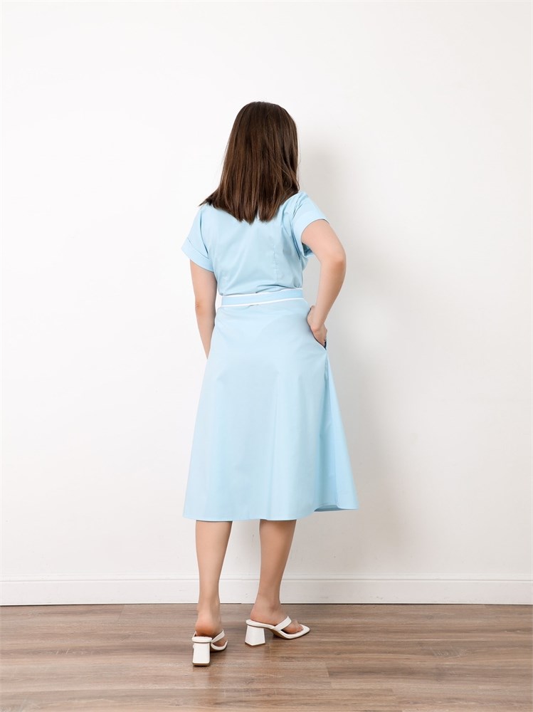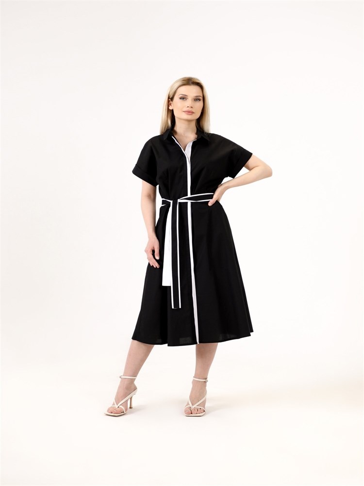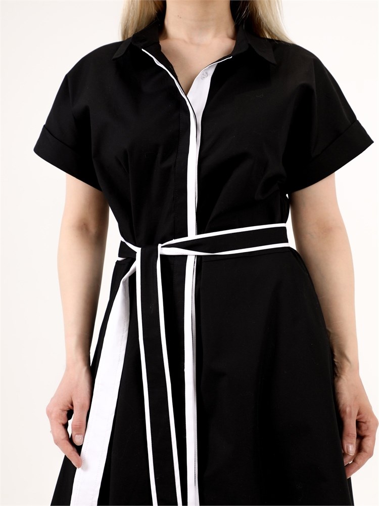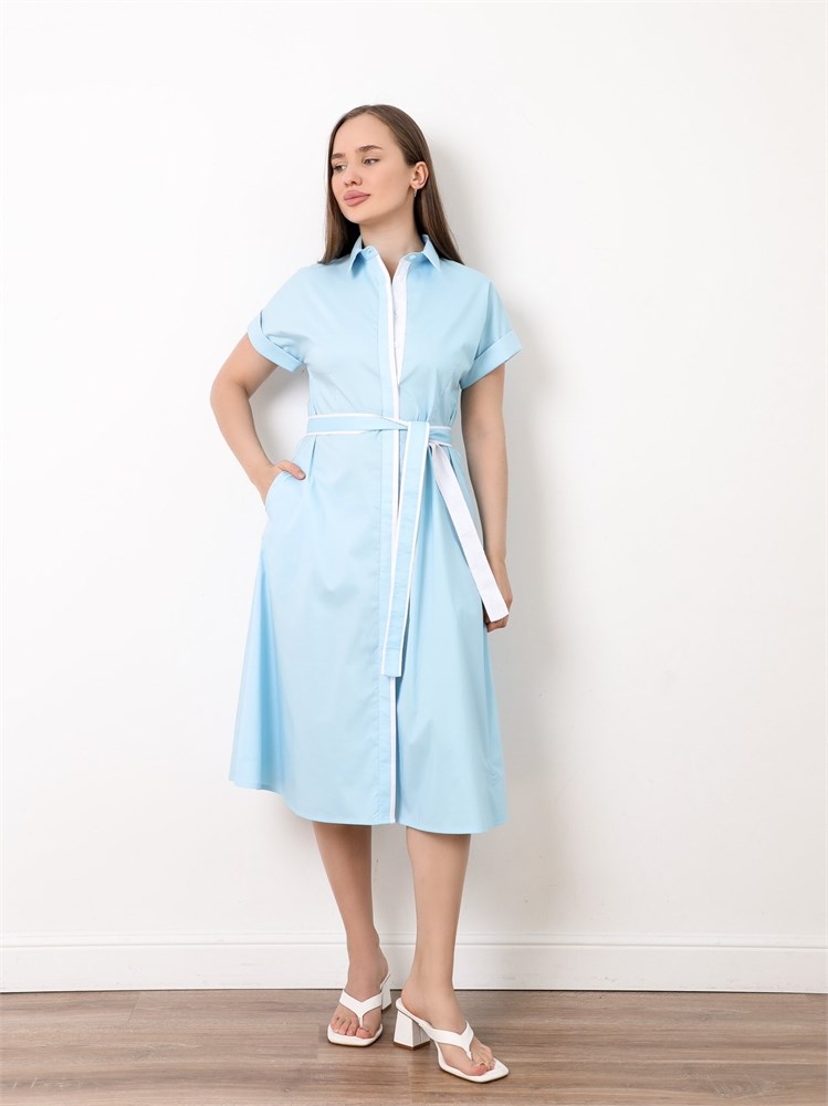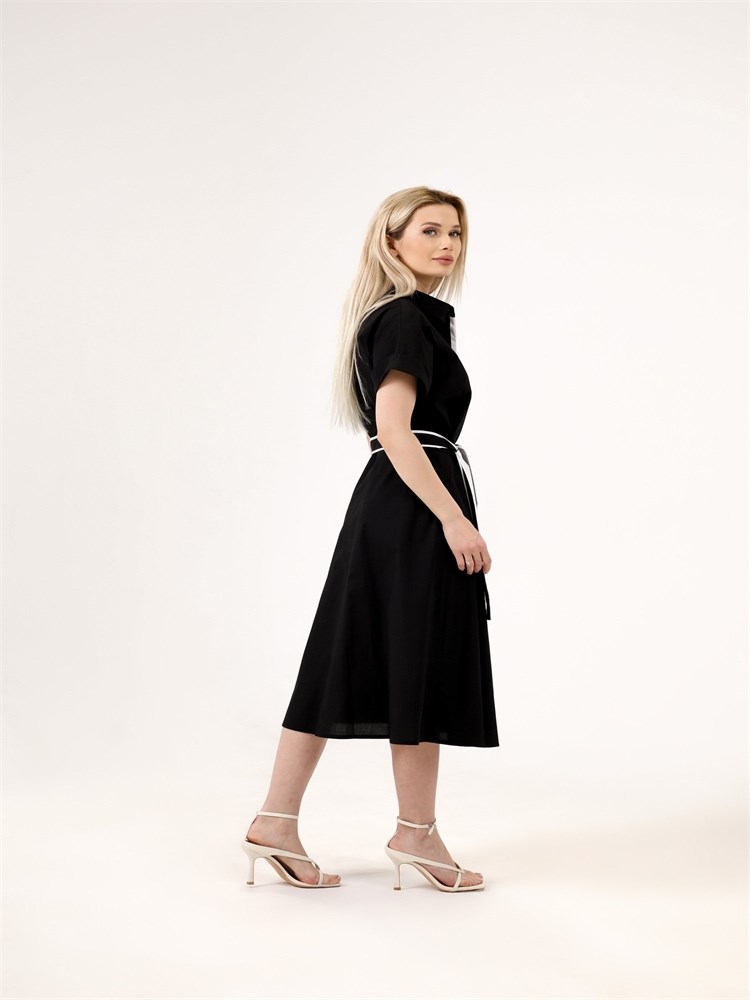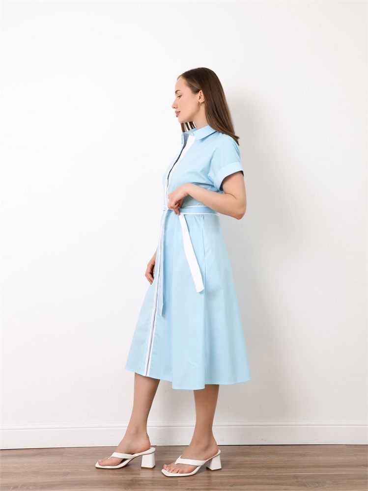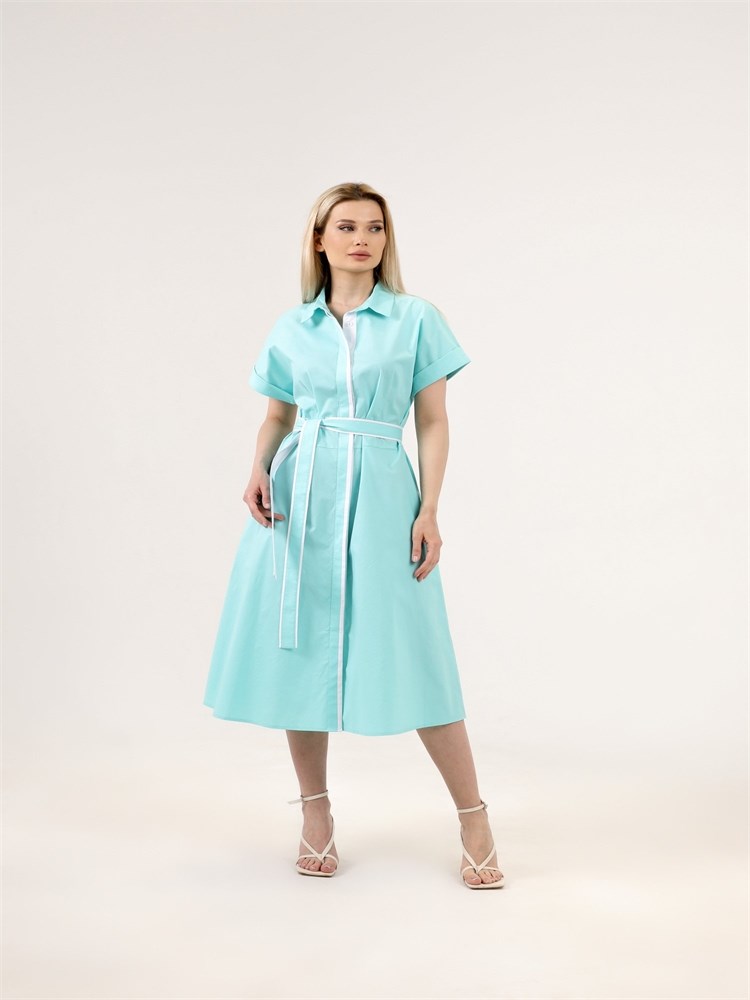 Платье-рубашка из хлопка со съемным поясом. Рукав цельнокроеный с воротником "стойкой", сулпатной застежкой на планке и карманами в шве. Платье приталеное с расклишением к низу