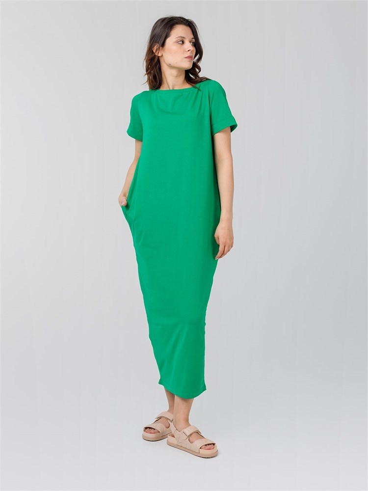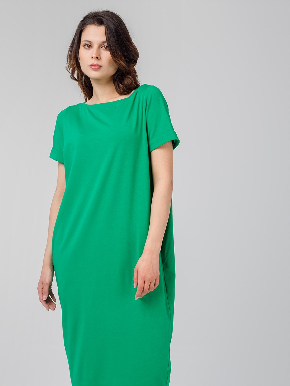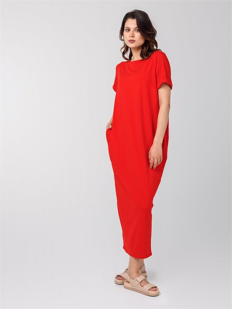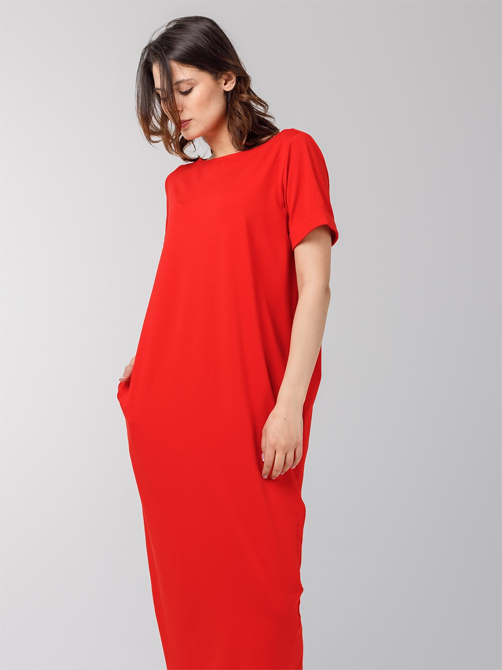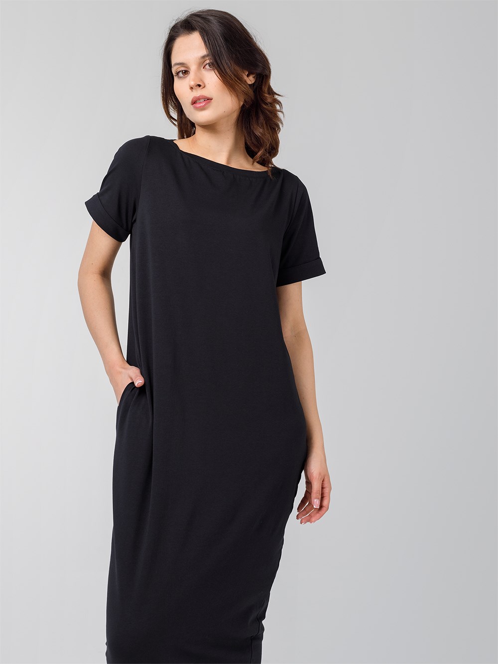 Платье длины миди со втачным рукавом. Вырез горловины "лодочка", карманы по боковым швам