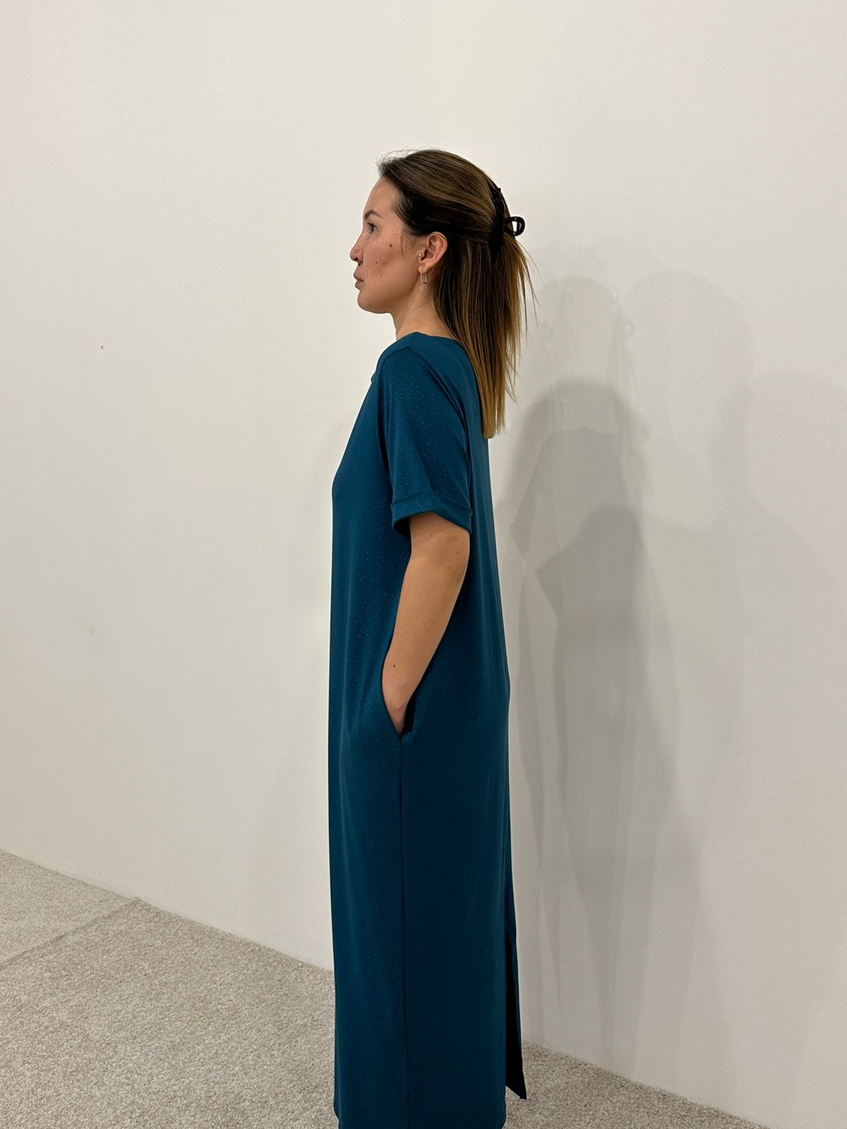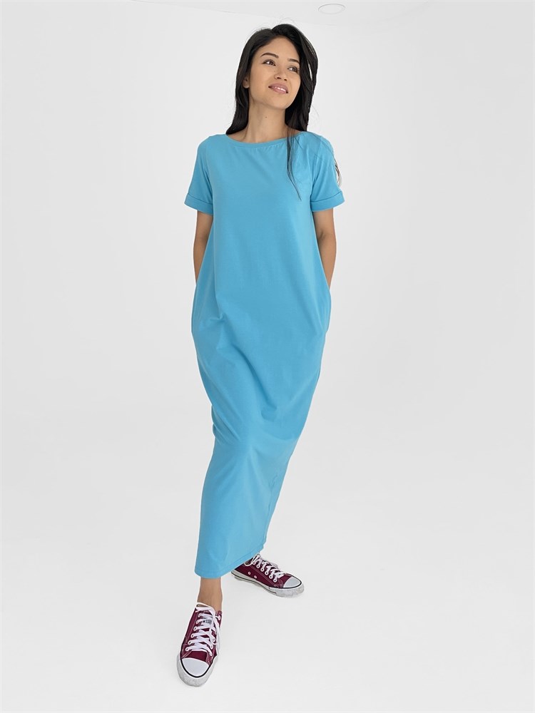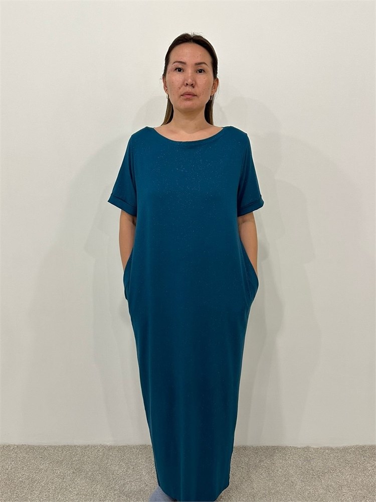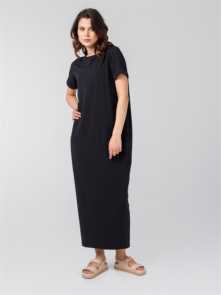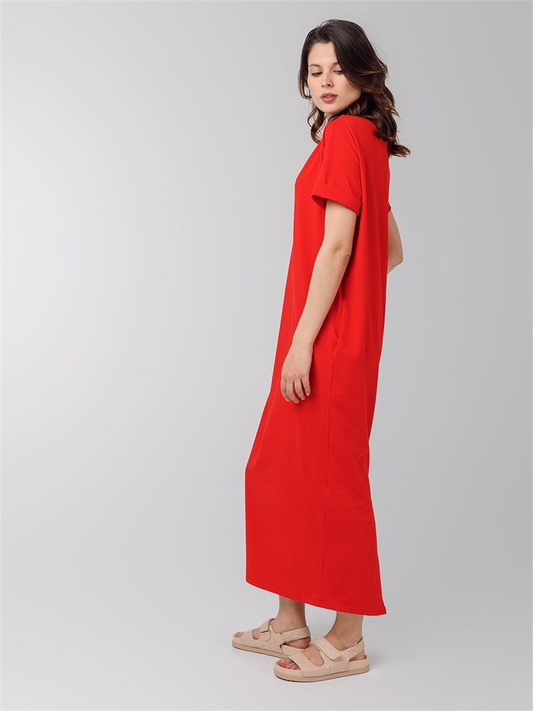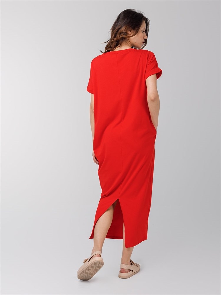Платье длины миди со втачным рукавом. Вырез горловины "лодочка", карманы по боковым швам