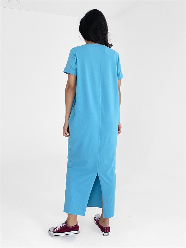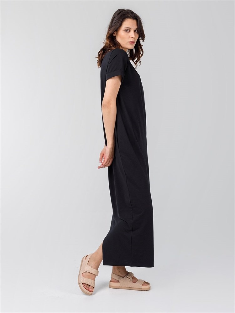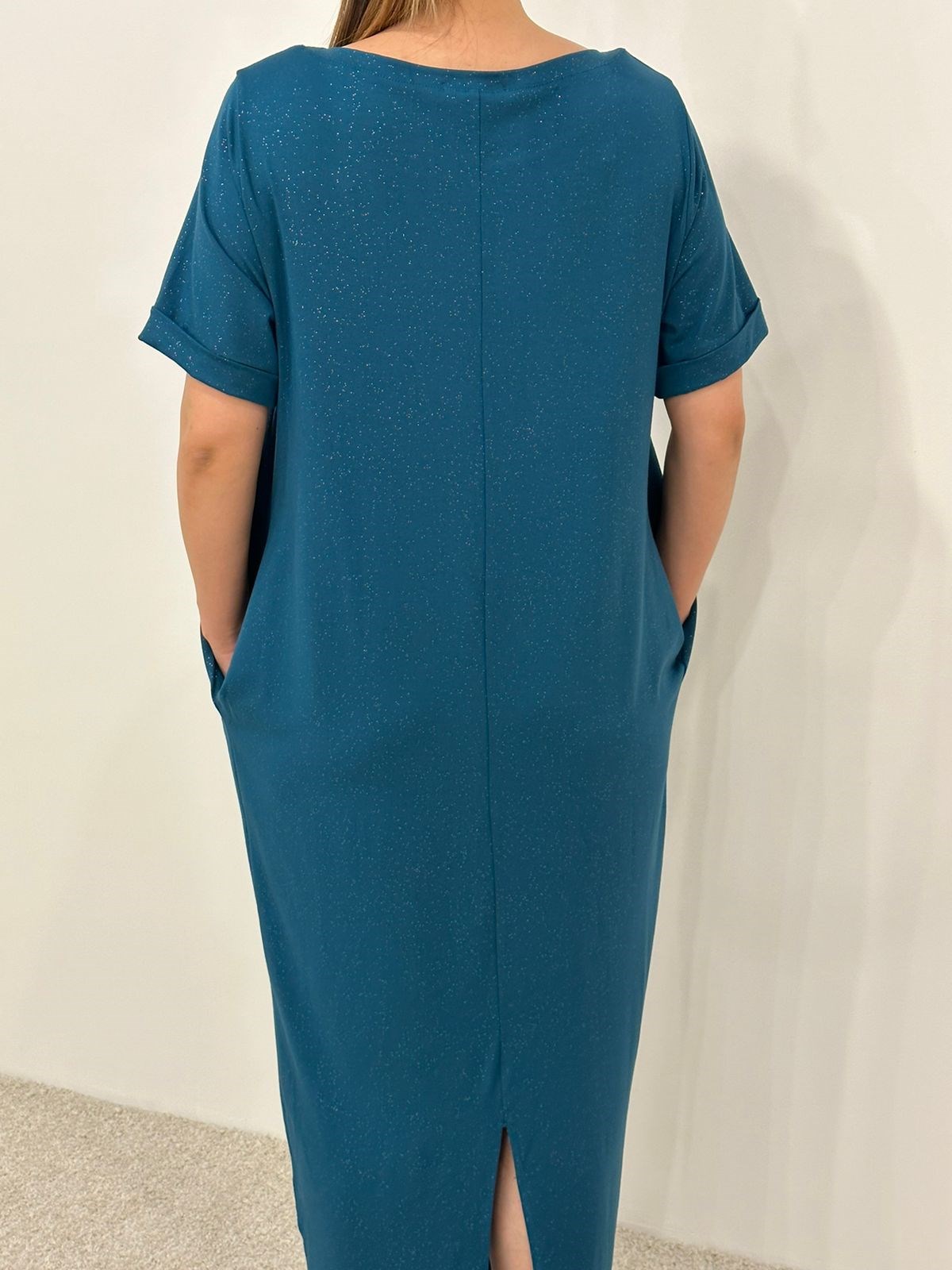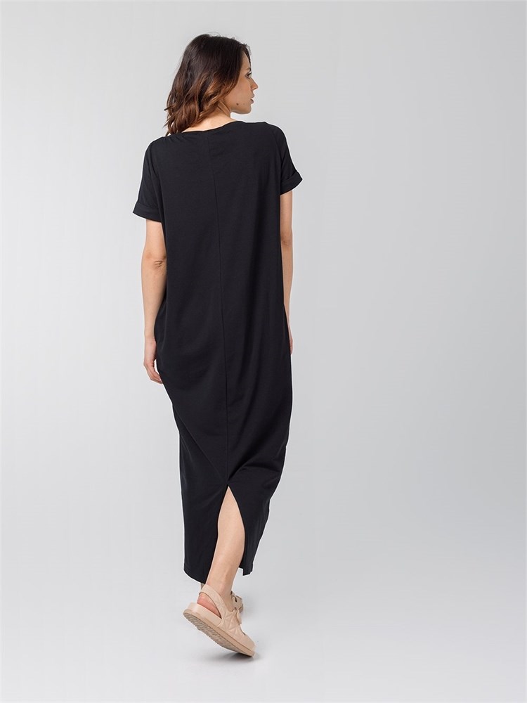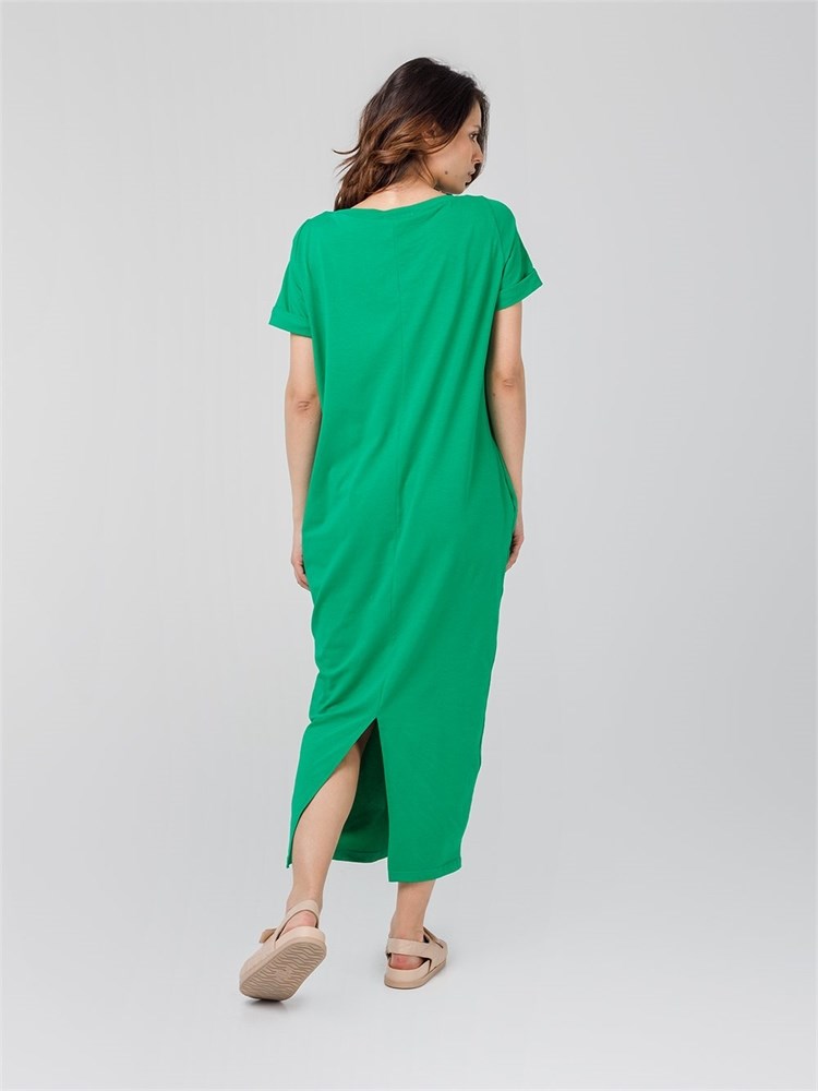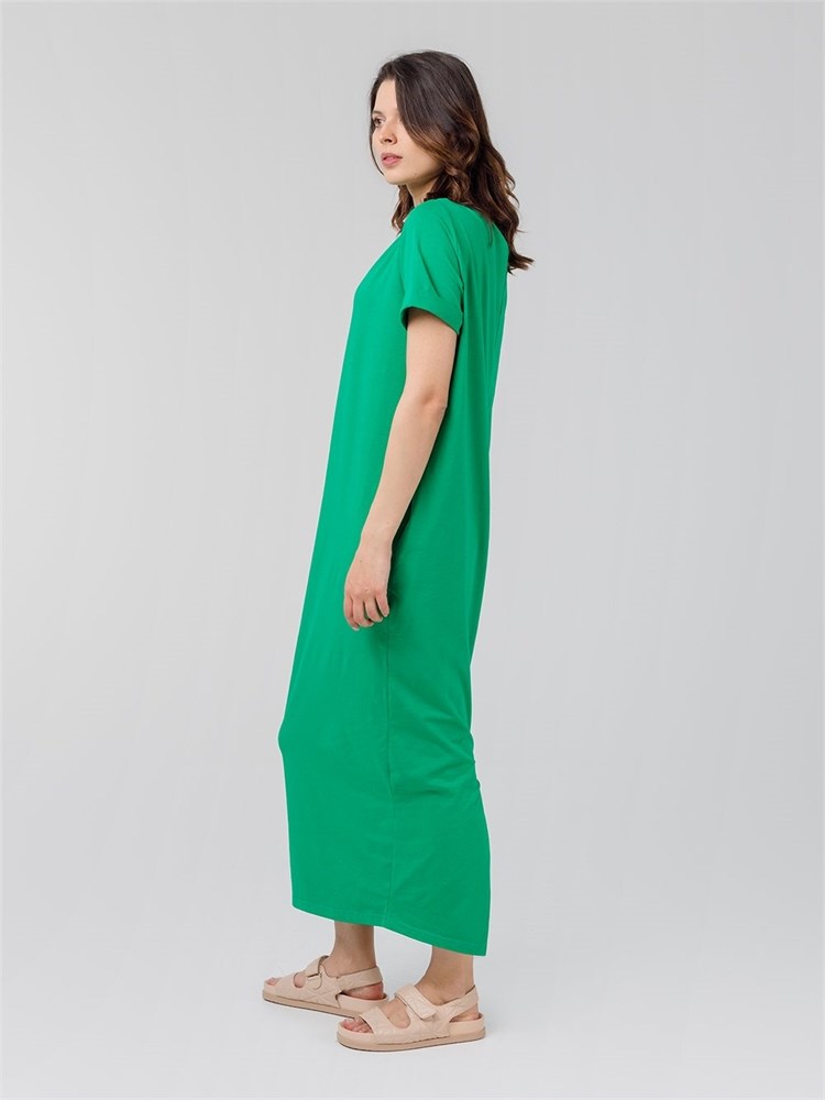 Платье длины миди со втачным рукавом. Вырез горловины "лодочка", карманы по боковым швам