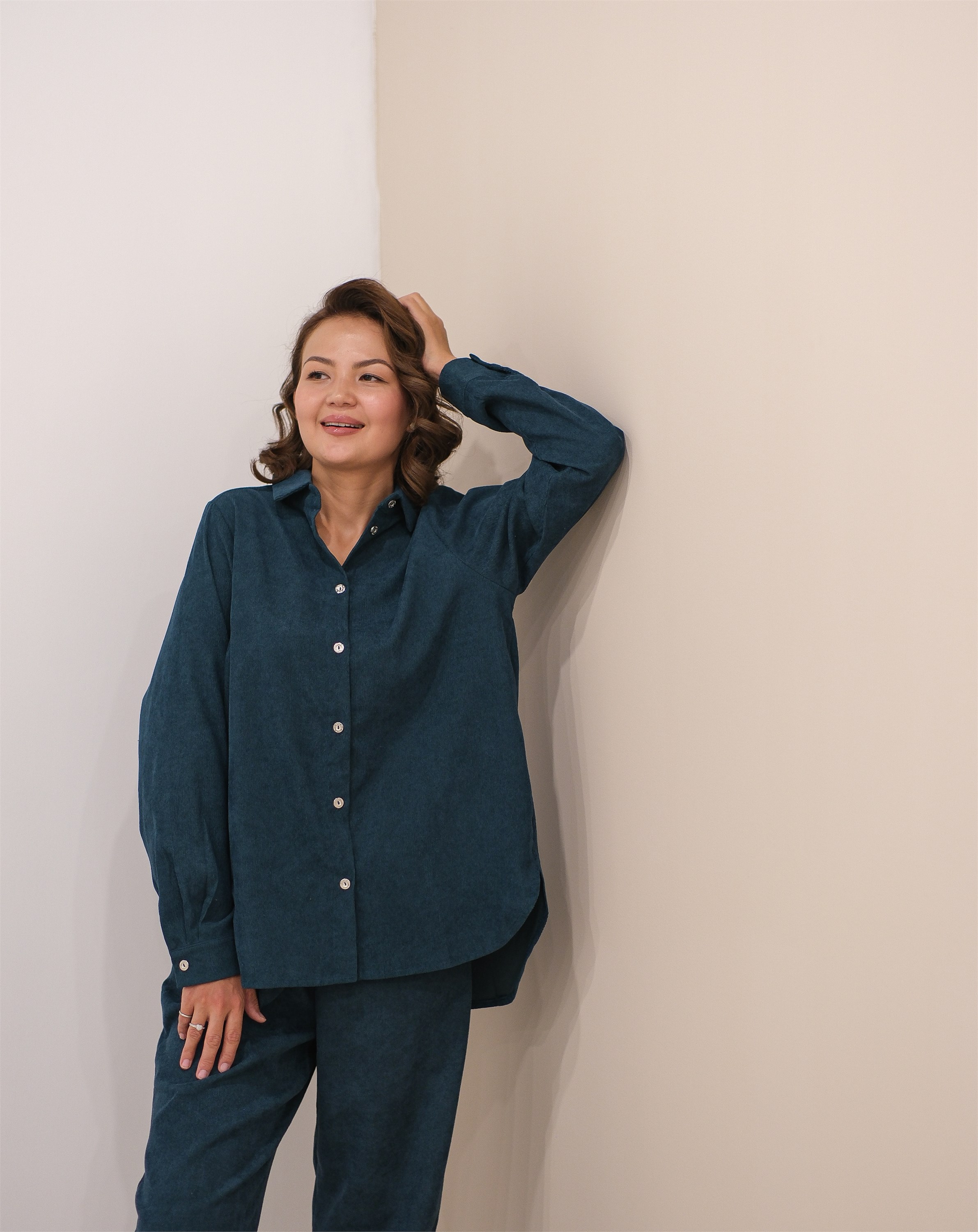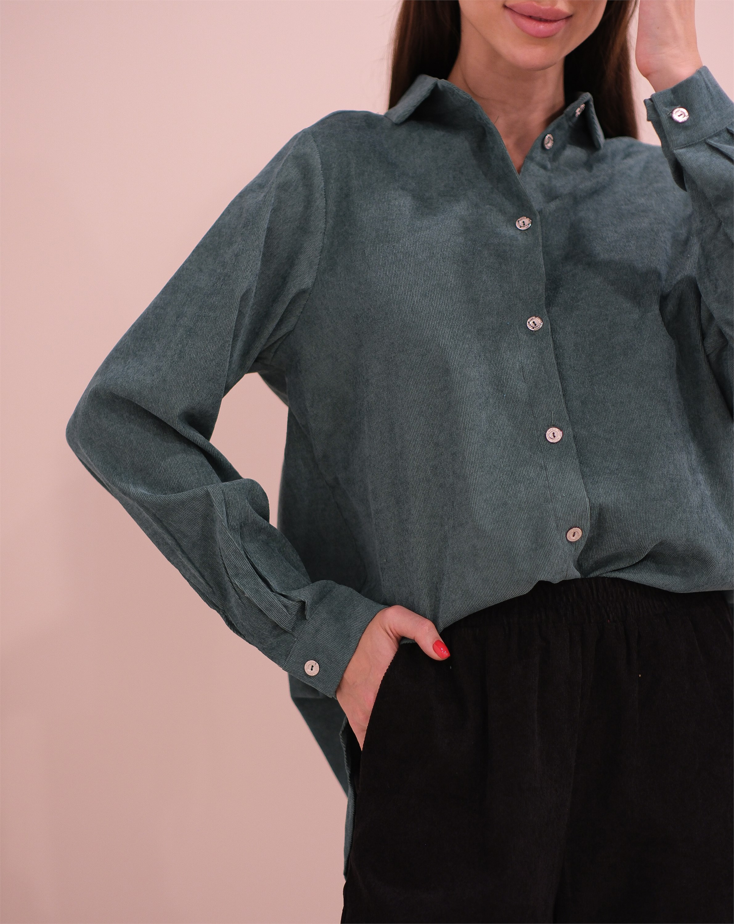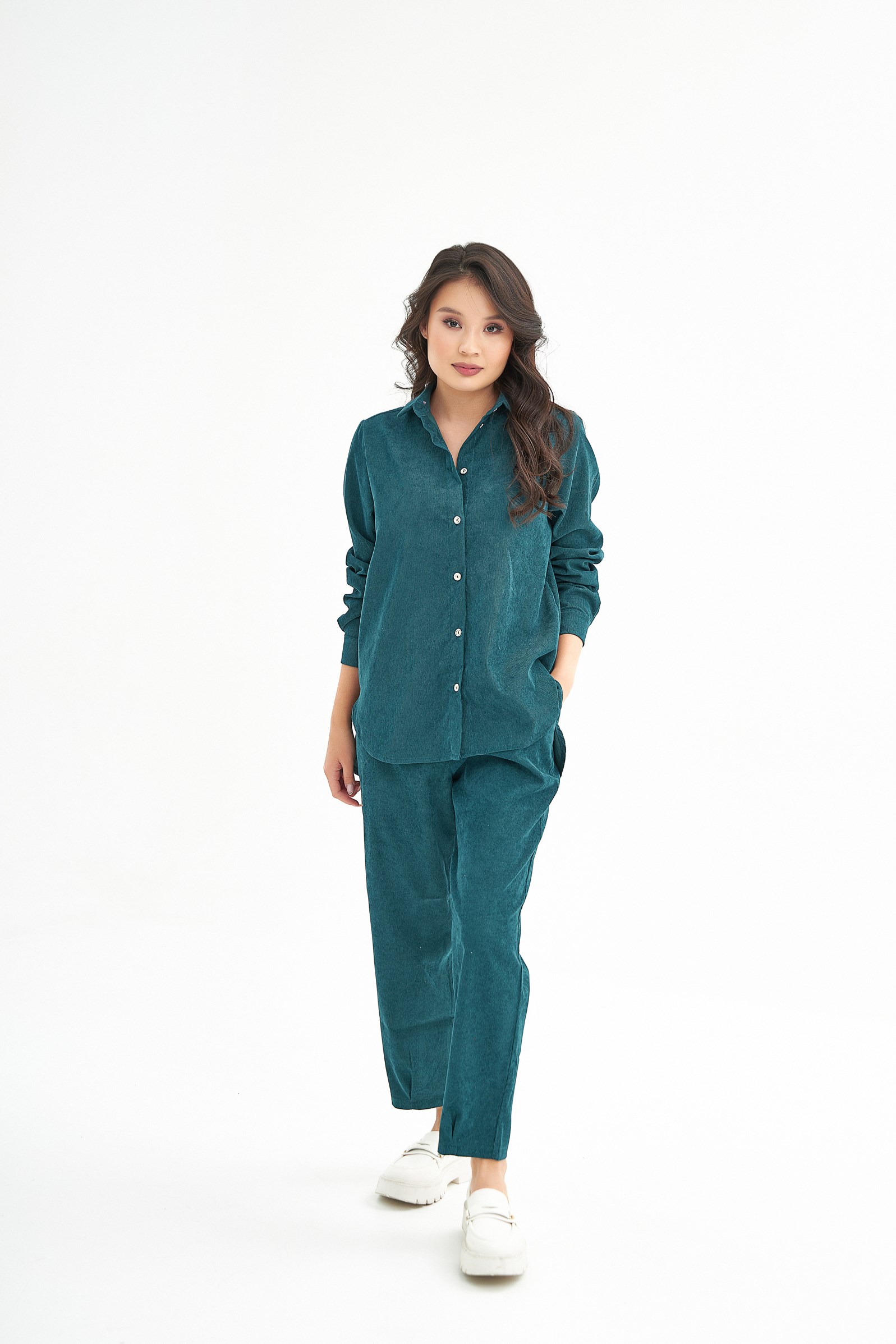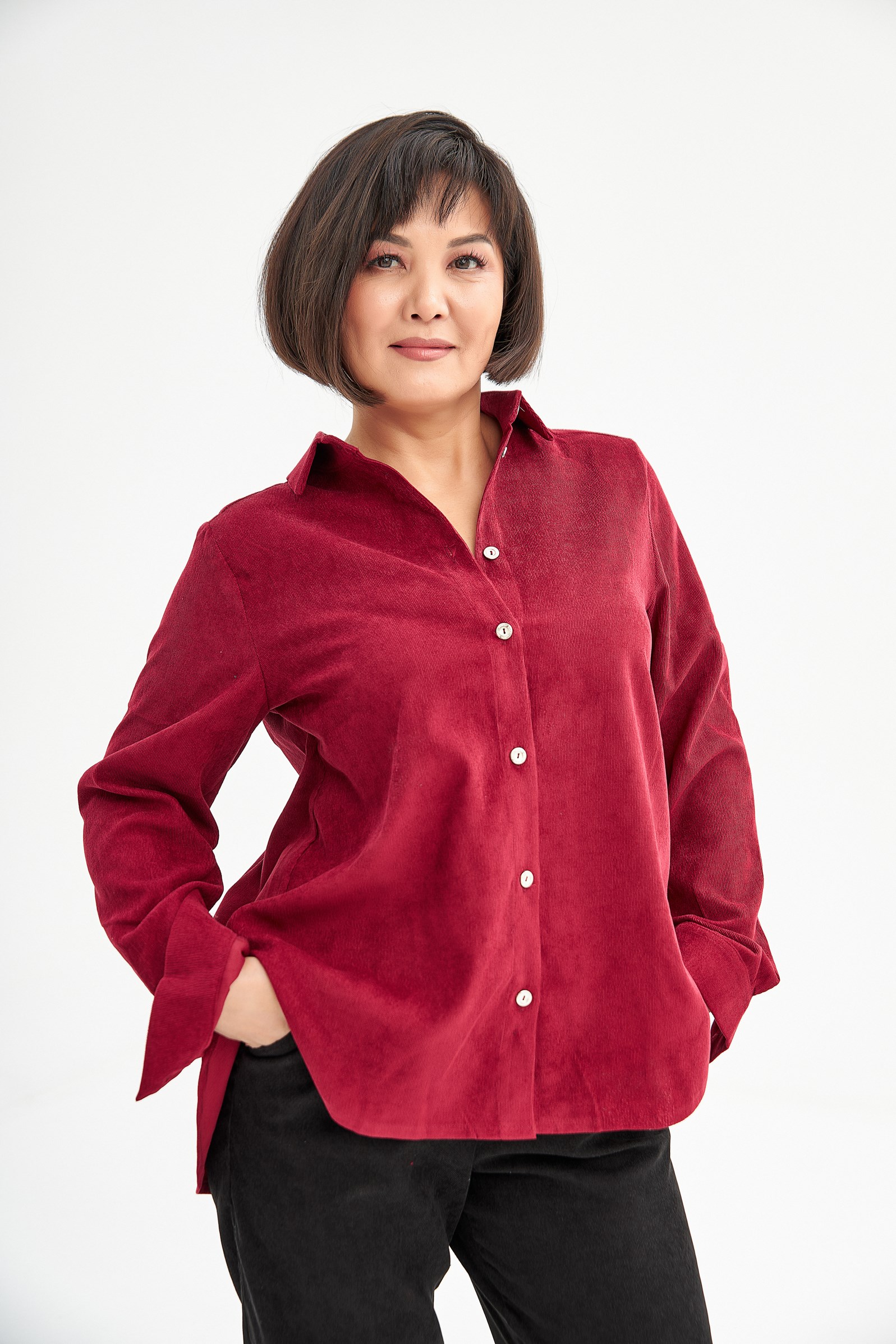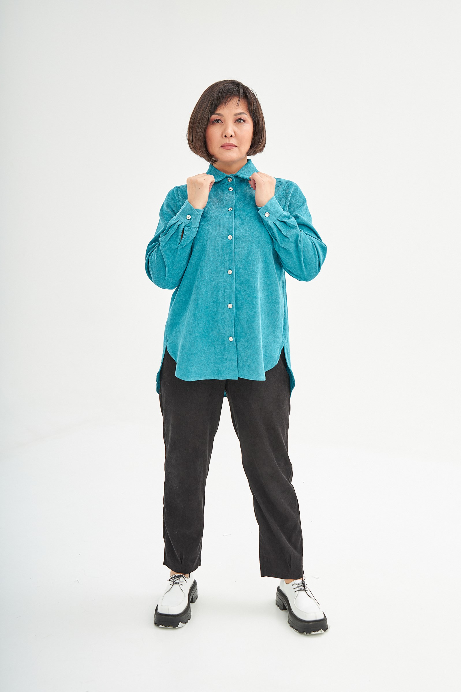 Рубашка со втачным рукавом и отложным воротником. Длина до бедер, рукава на манжетах, застежка на пуговицах.