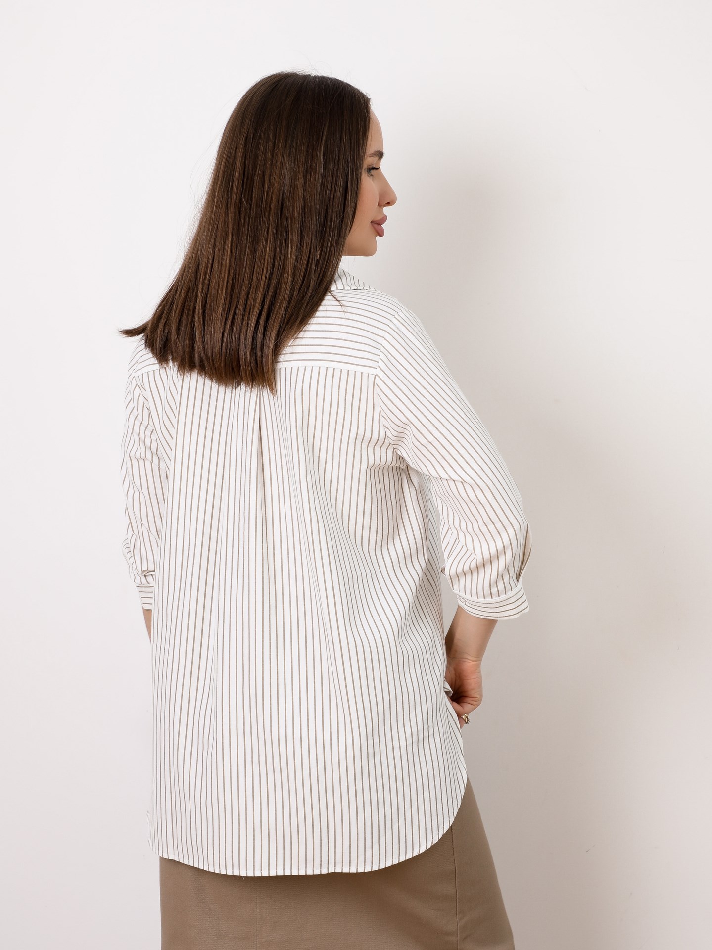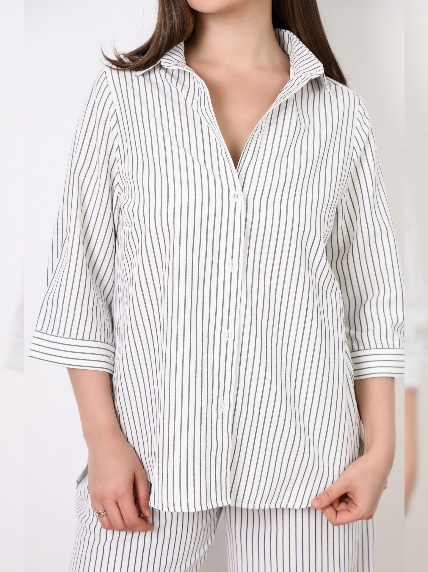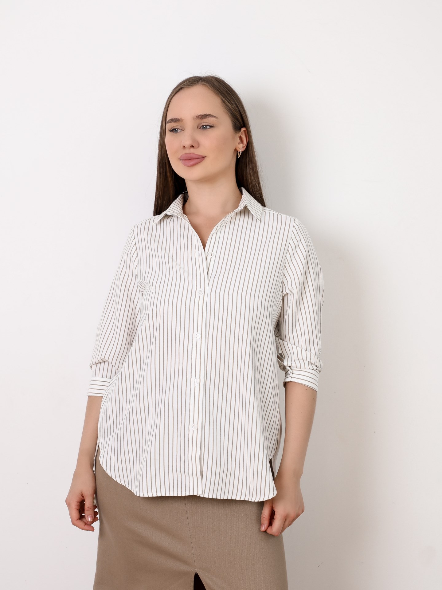 Рубашка со втачным рукавом и отложным воротником. Длина до бедер, рукава на манжетах, застежка на пуговицах.