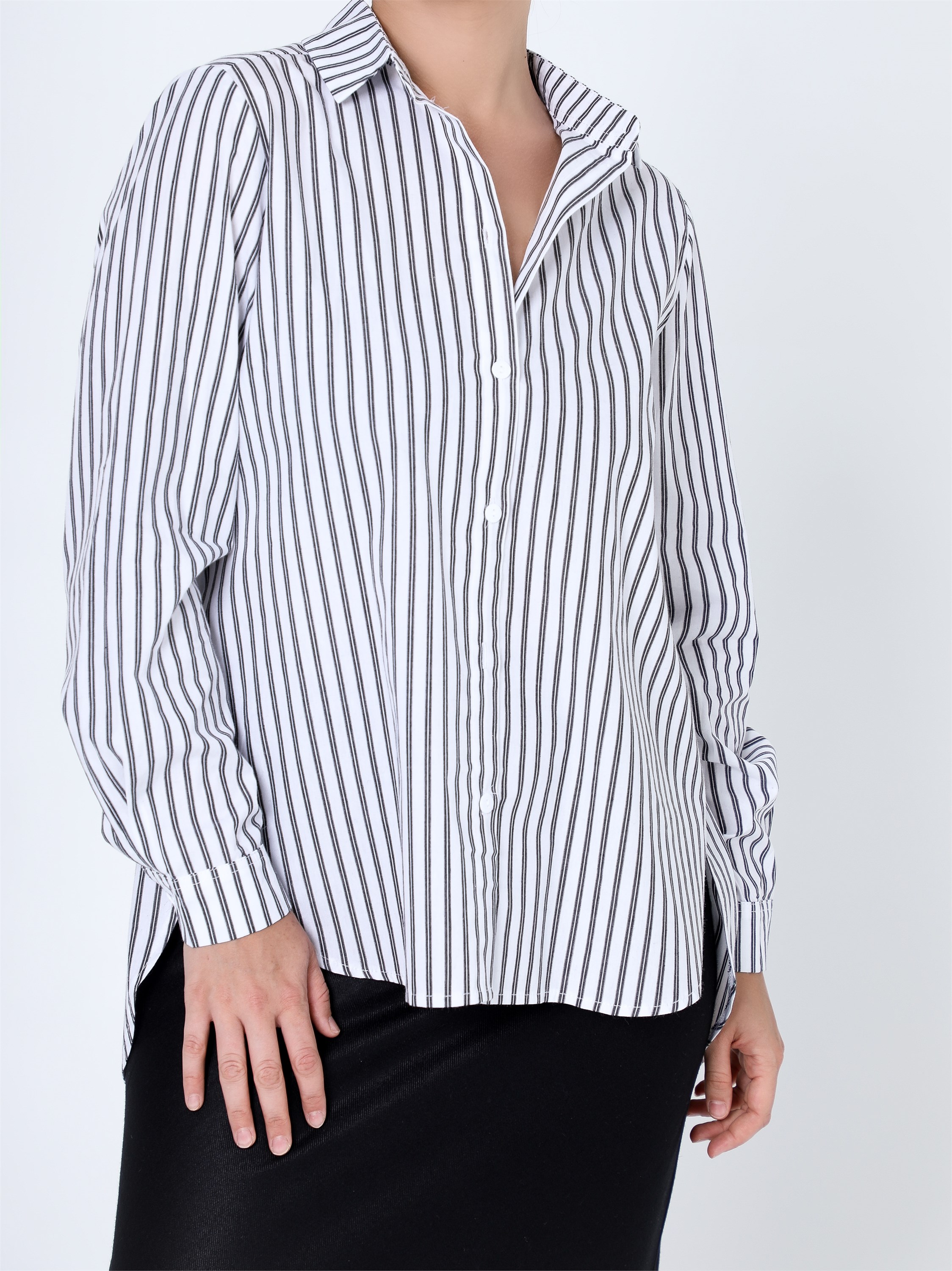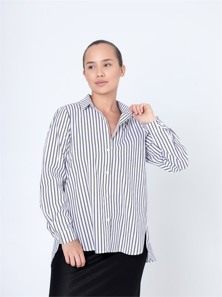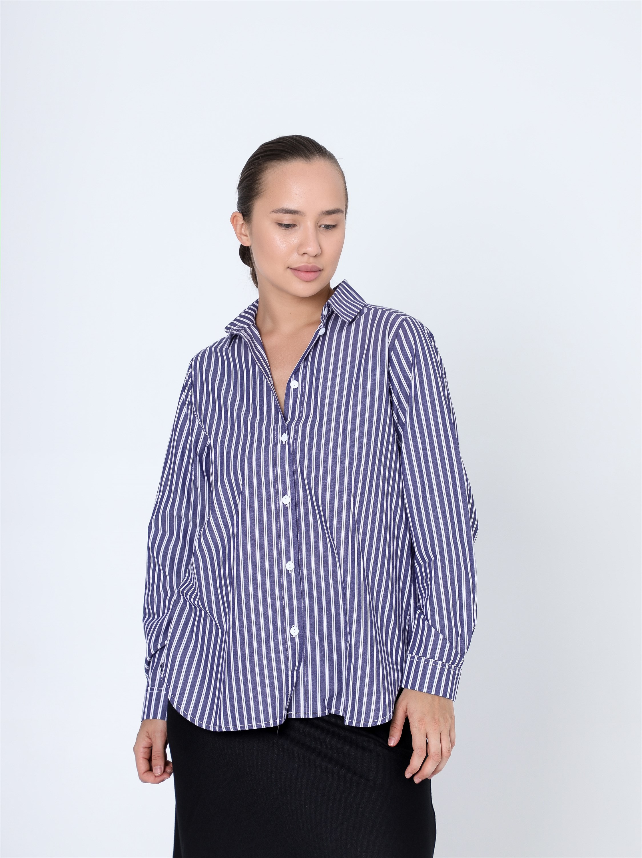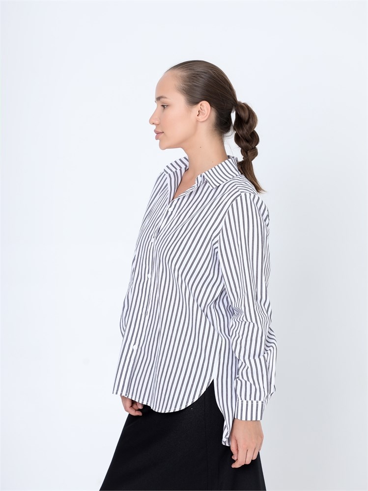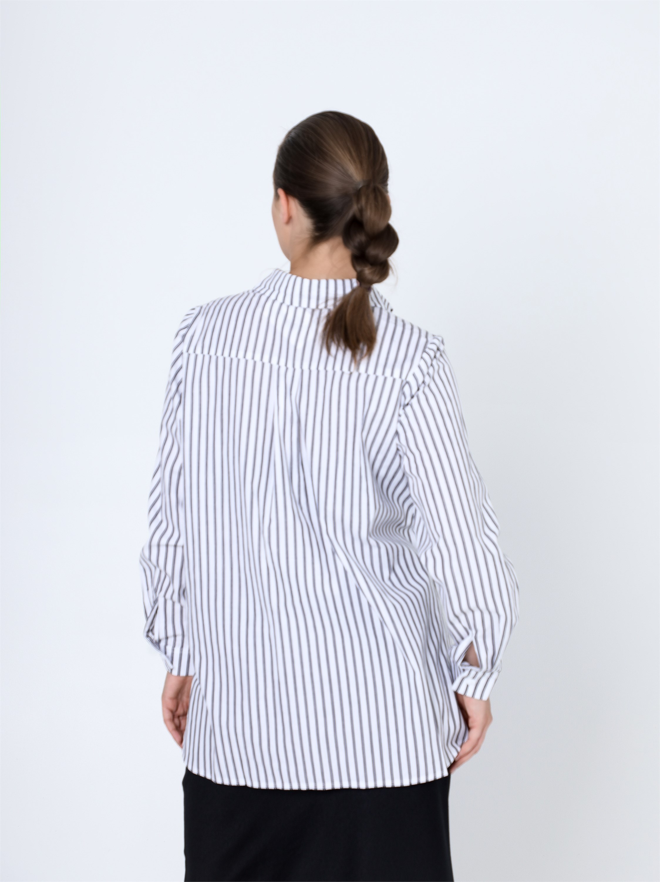 Рубашка свободного кроя с отложным воротником. Рукав втачной, низ ассиметричный, спинка длиннее полочки. Застежка на пуговицах.