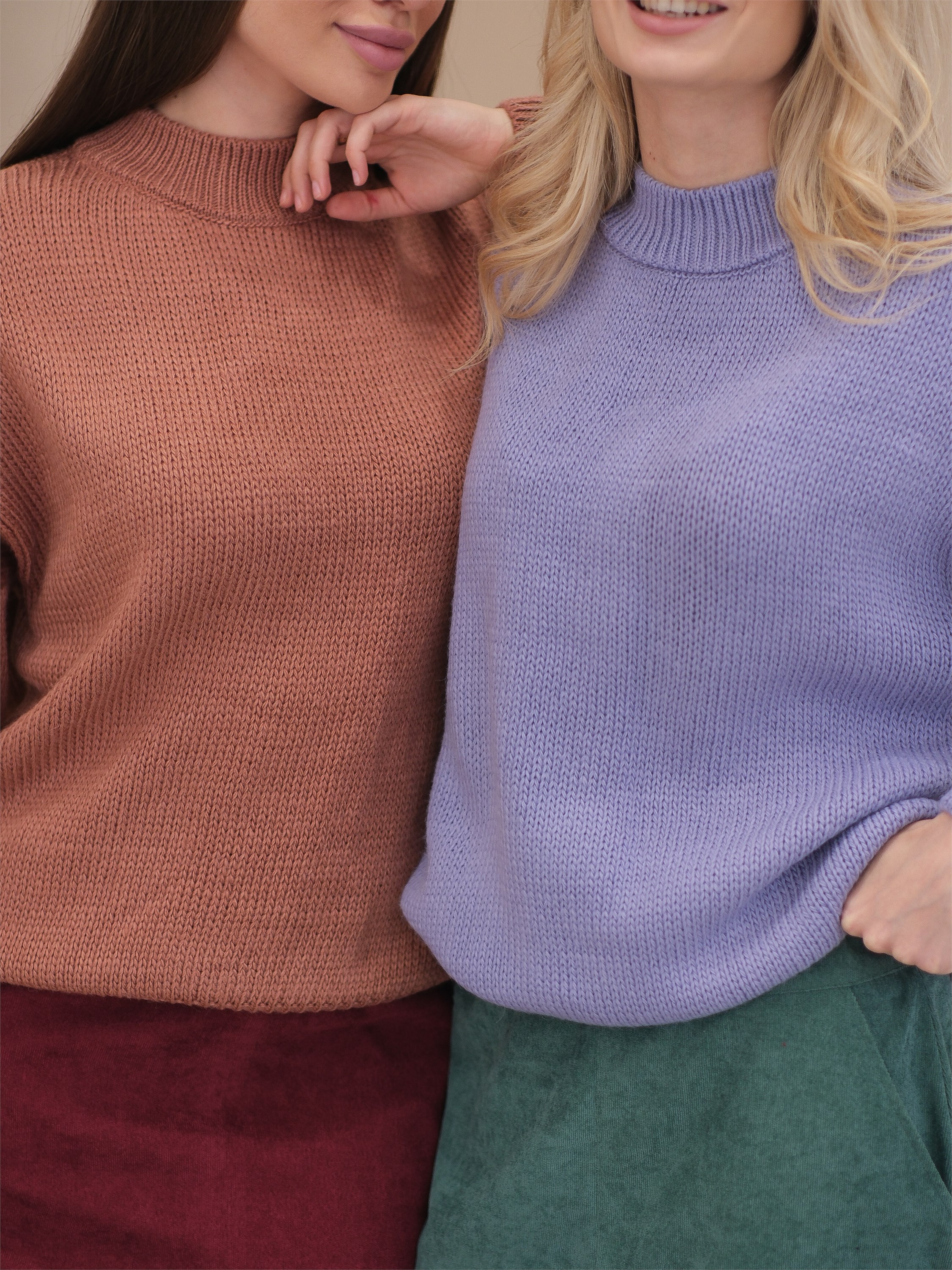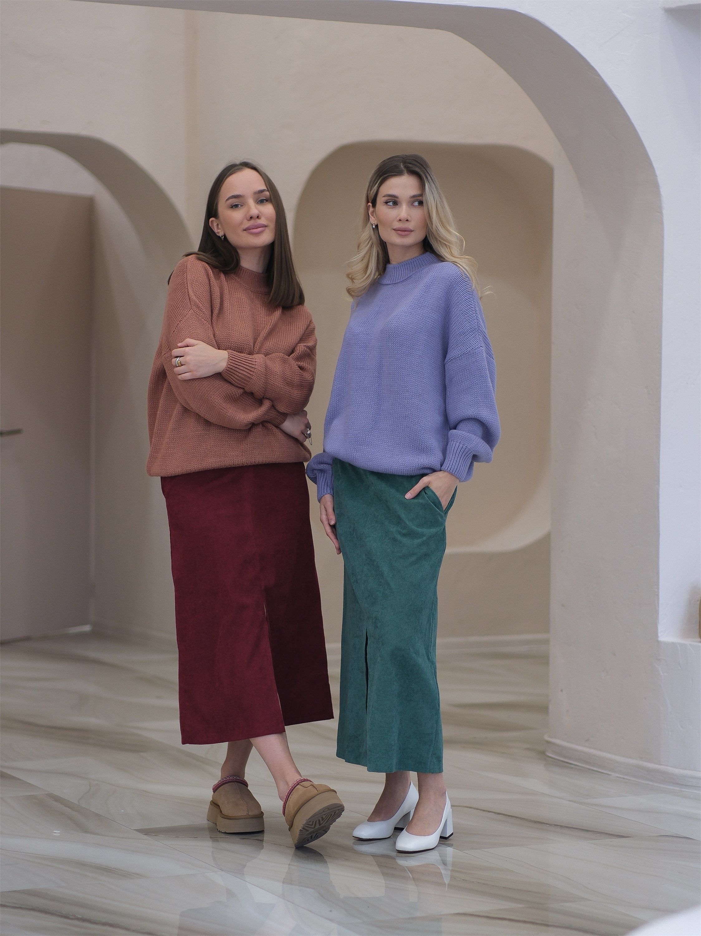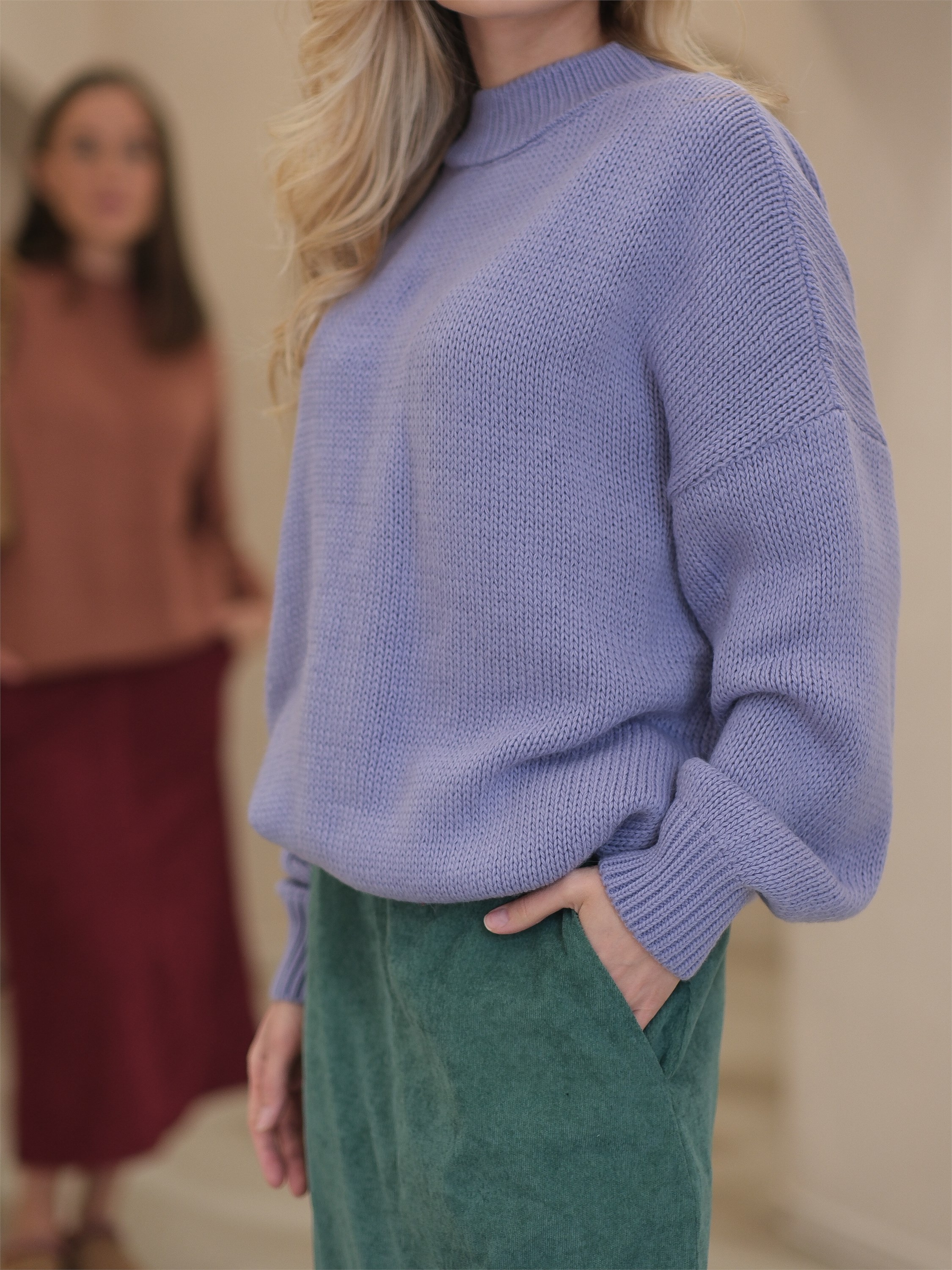 ***Кең силуэтте иығы төмен пішілген тоқыма жемпірі. Жағалы және ұзындығы бөксе тұсына дейін