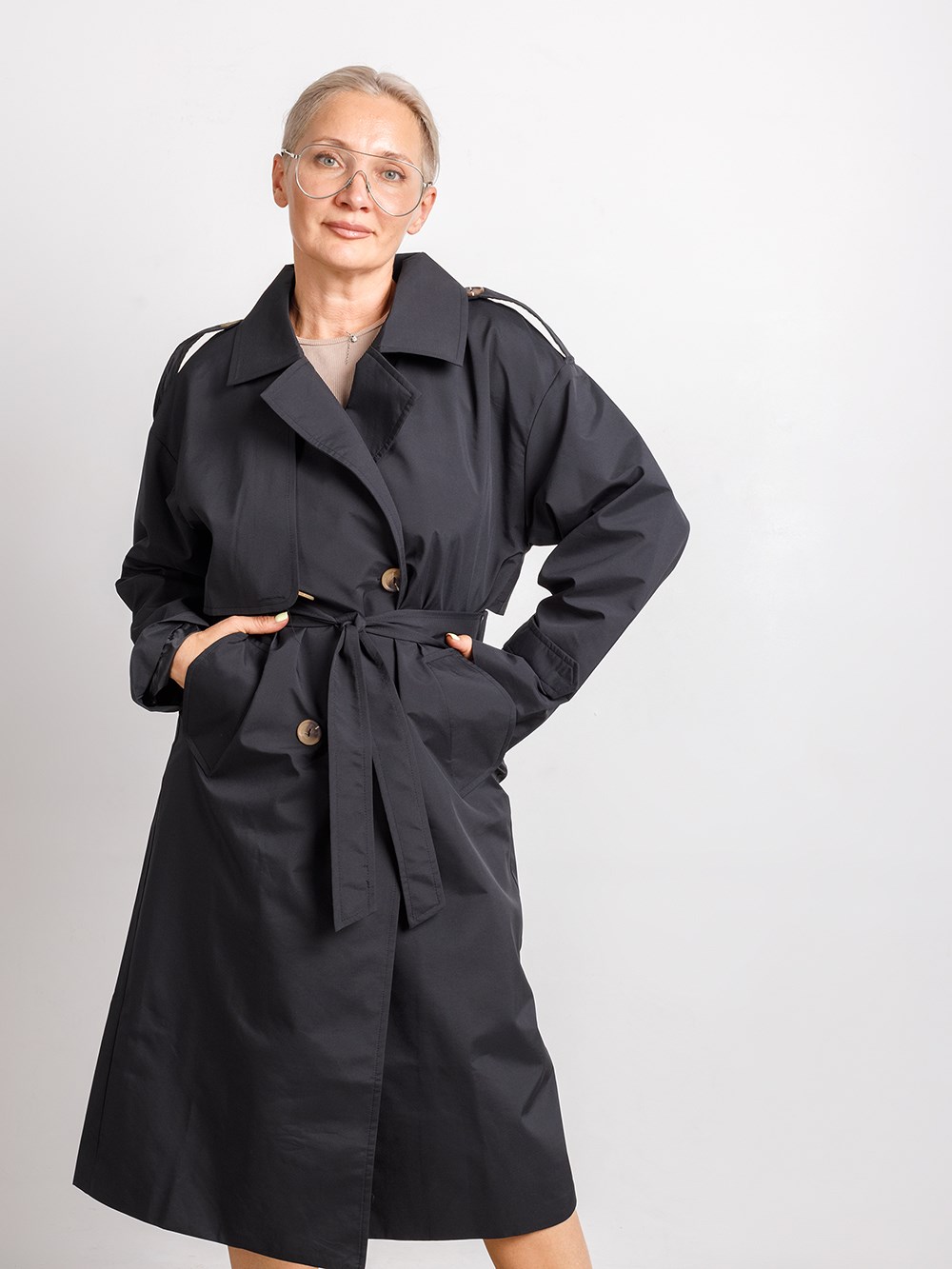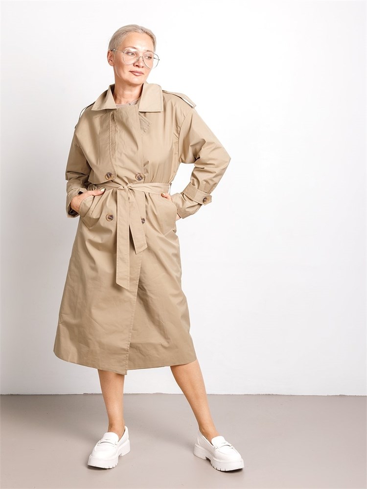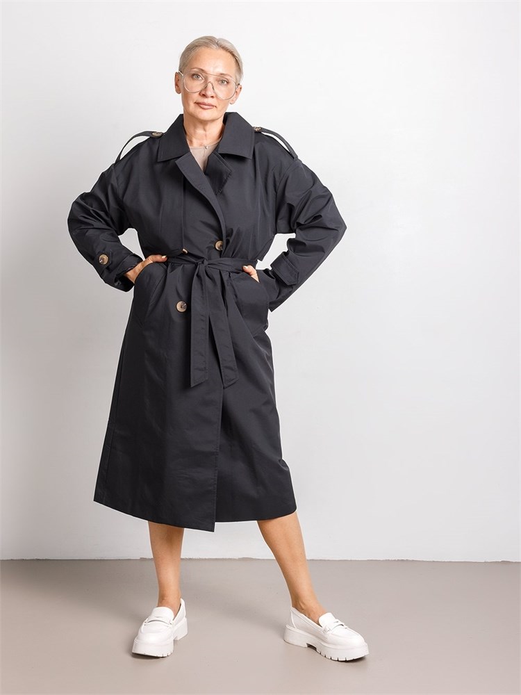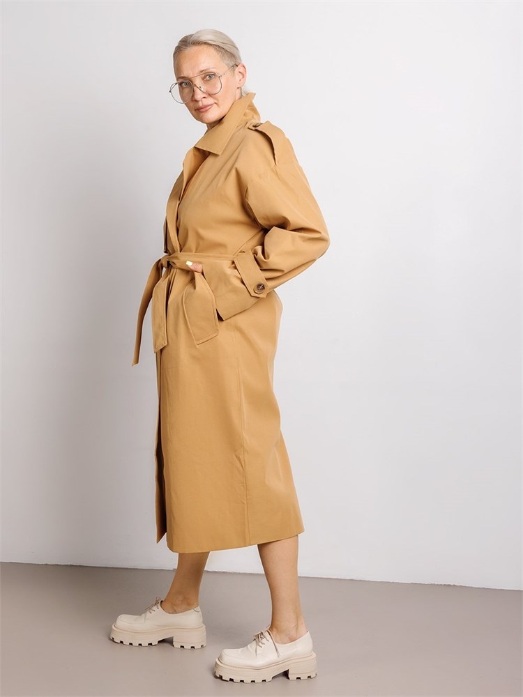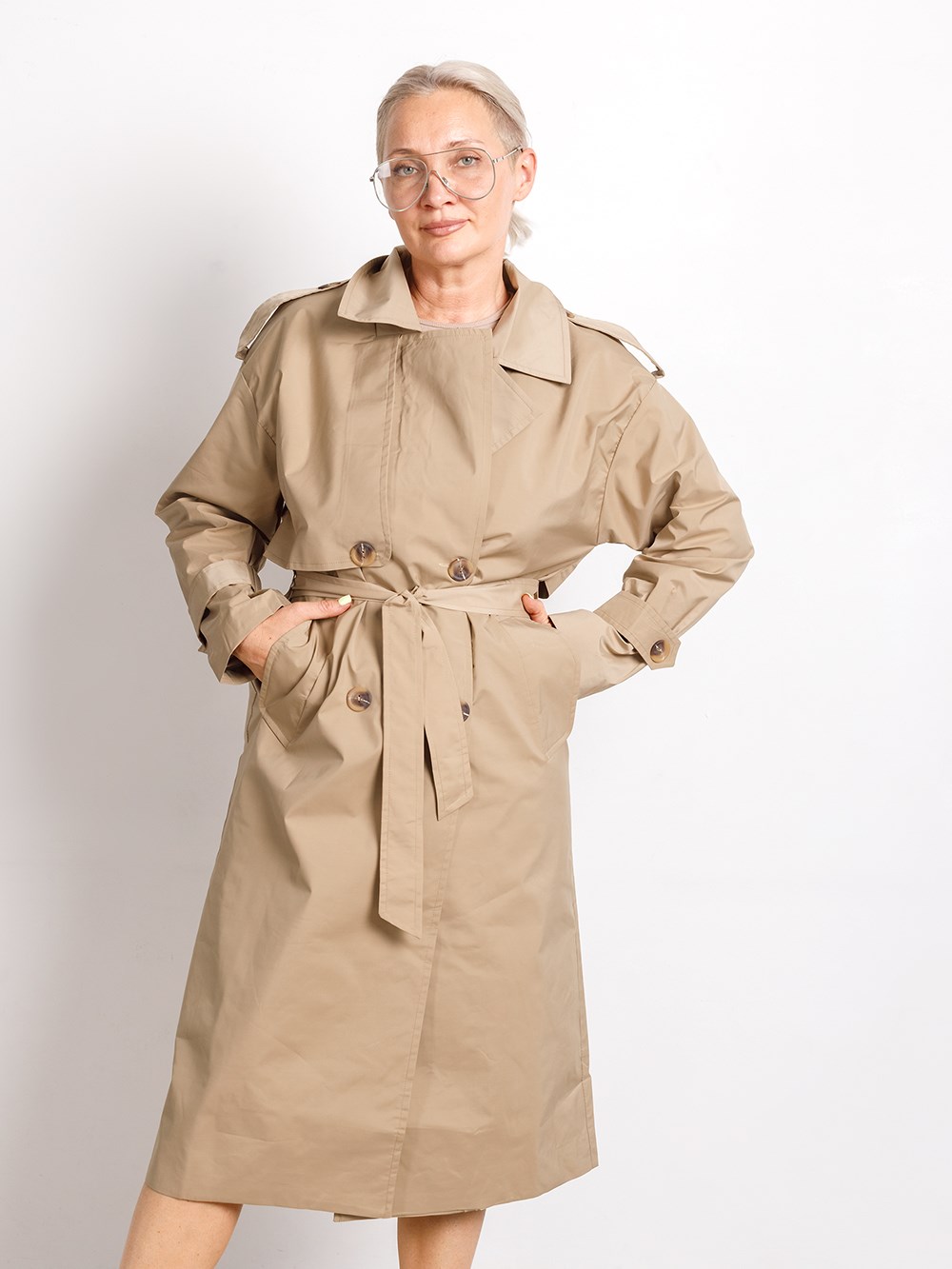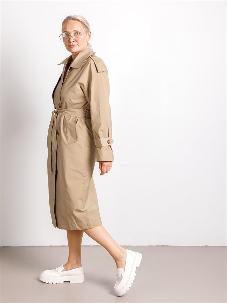 Тренч свободного кроя со втачным рукавом. Воротник отложной с лацканом и прорезным карманом, длина миди