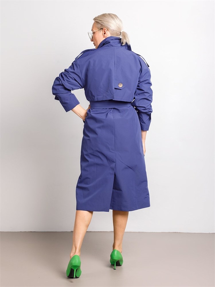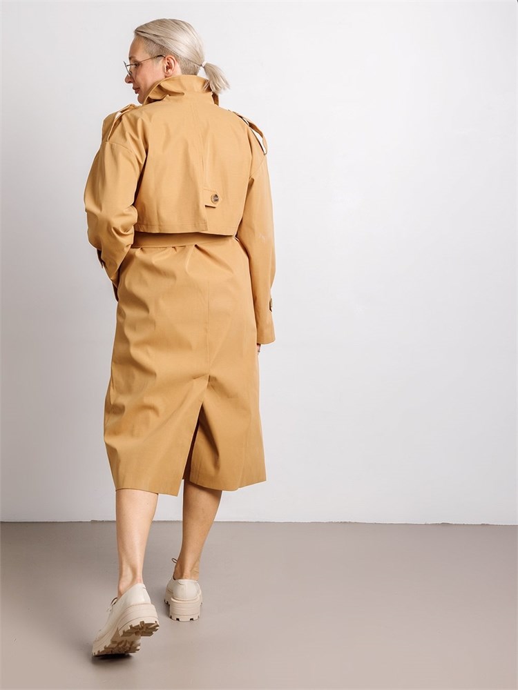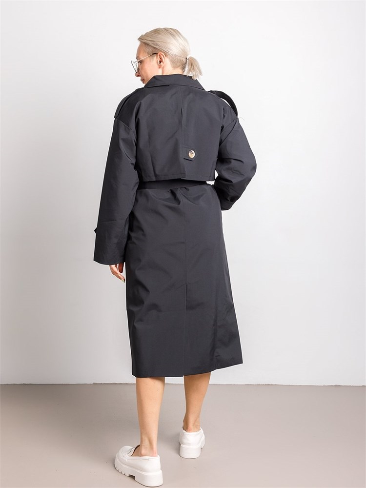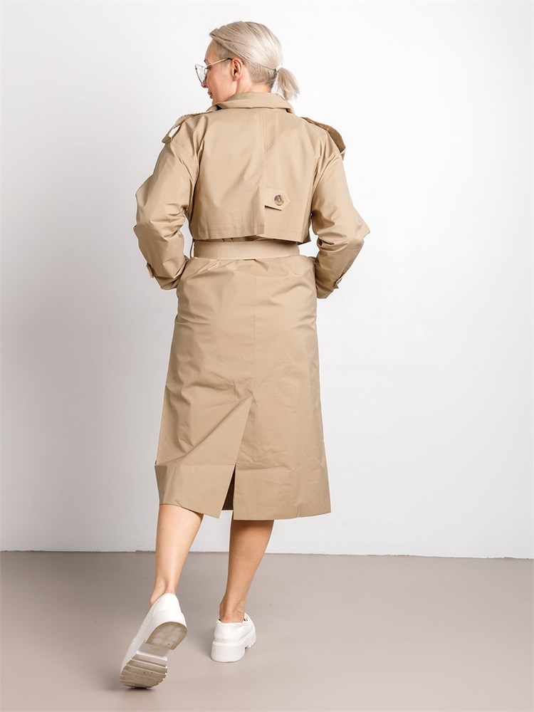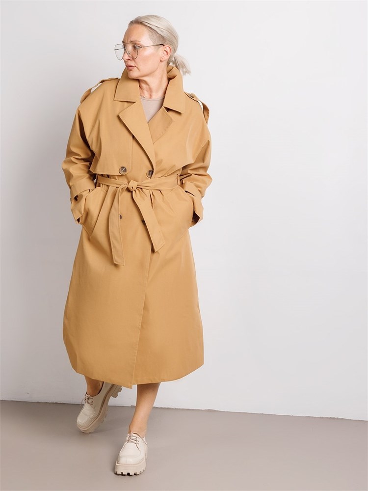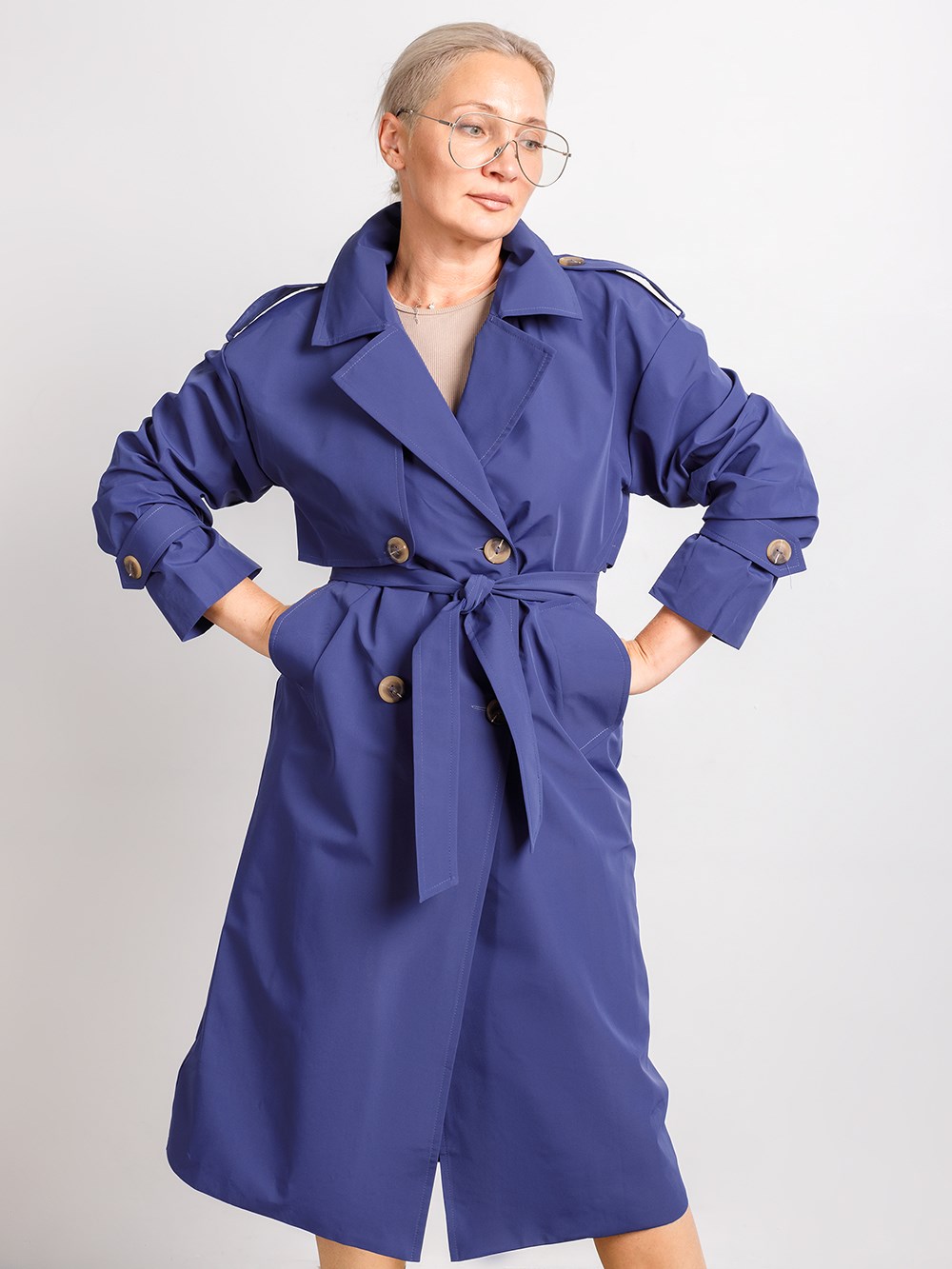 Тренч свободного кроя со втачным рукавом. Воротник отложной с лацканом и прорезным карманом, длина миди