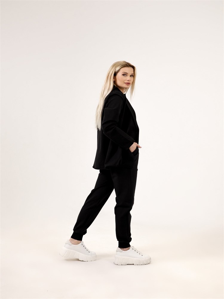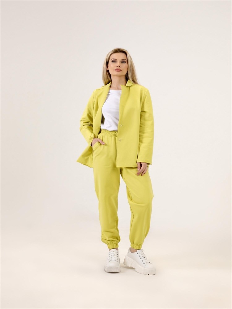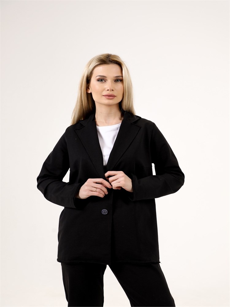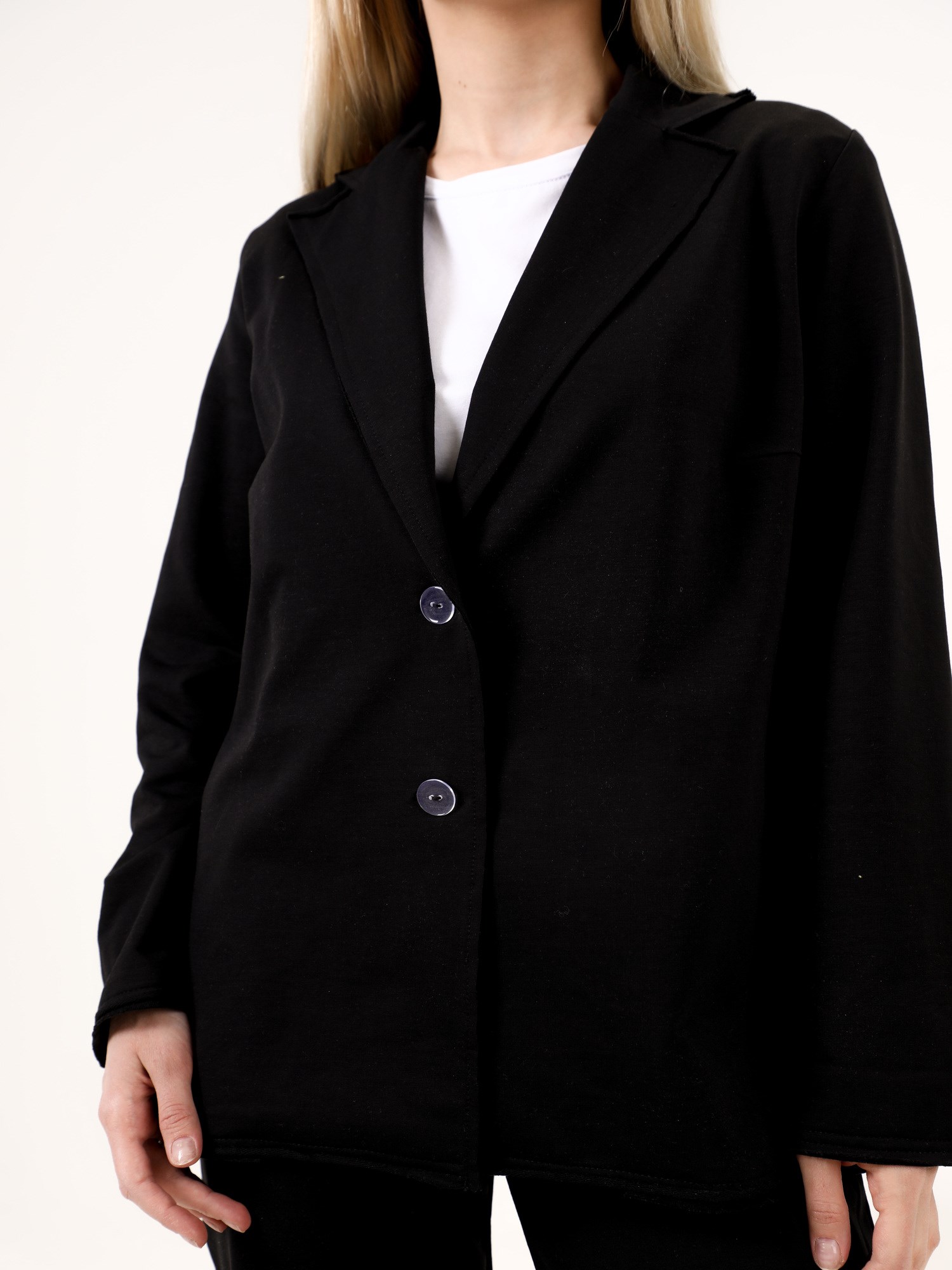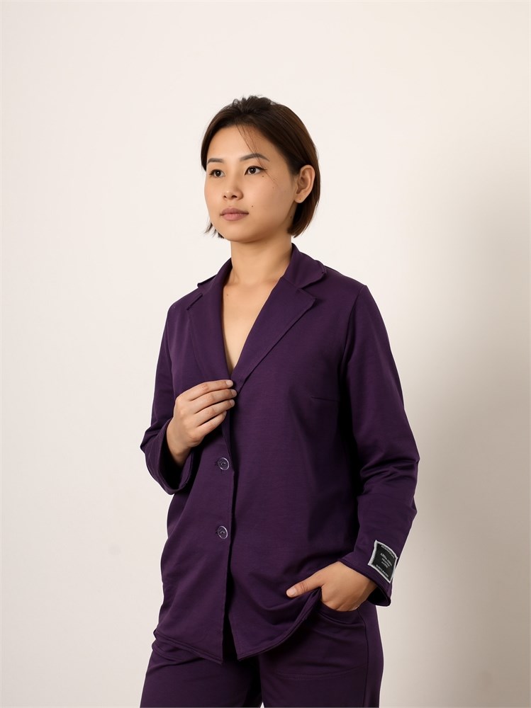 ***Қайырмалы жағалы трикотажды жакет. Қондырма жеңді, түйме тесігіне бекітілген. Ұзындығы бөксеге дейін