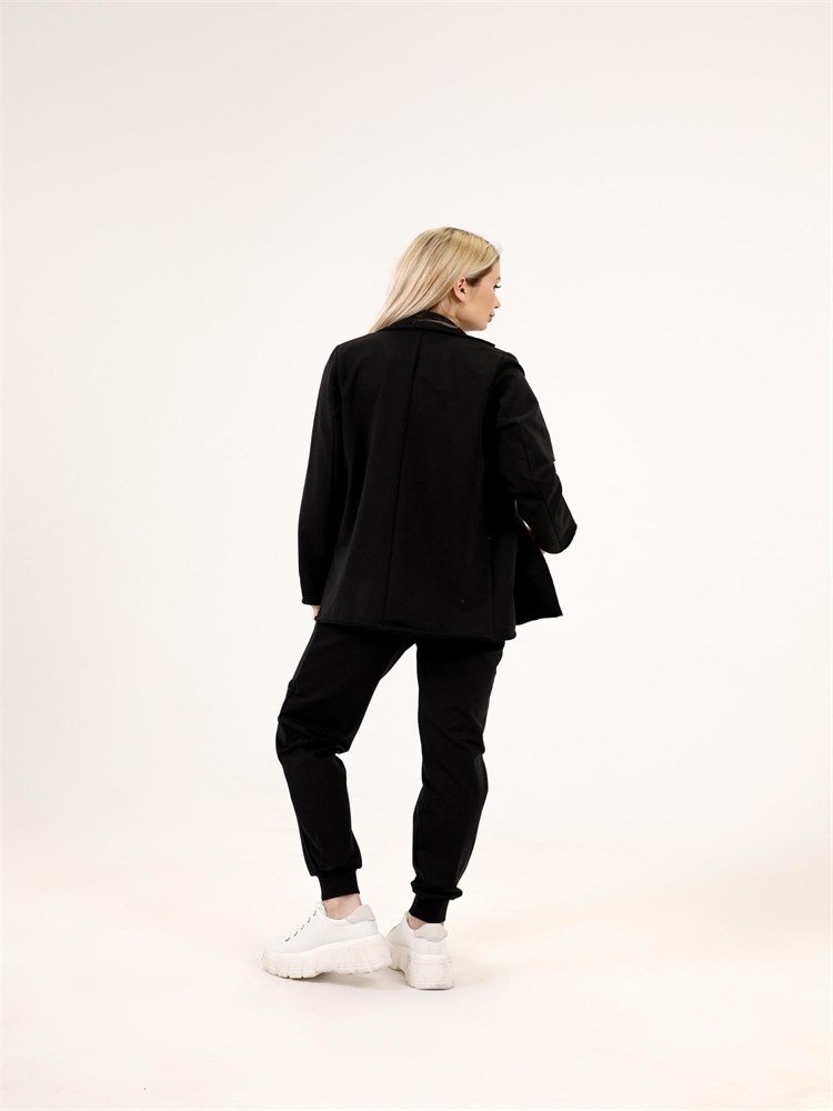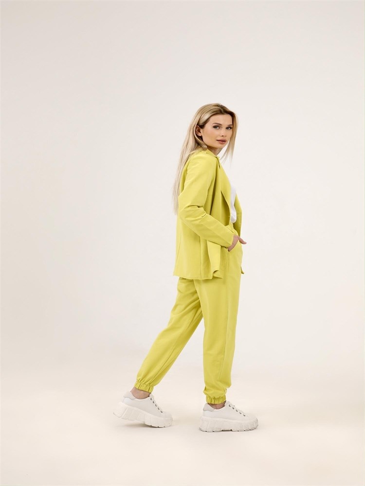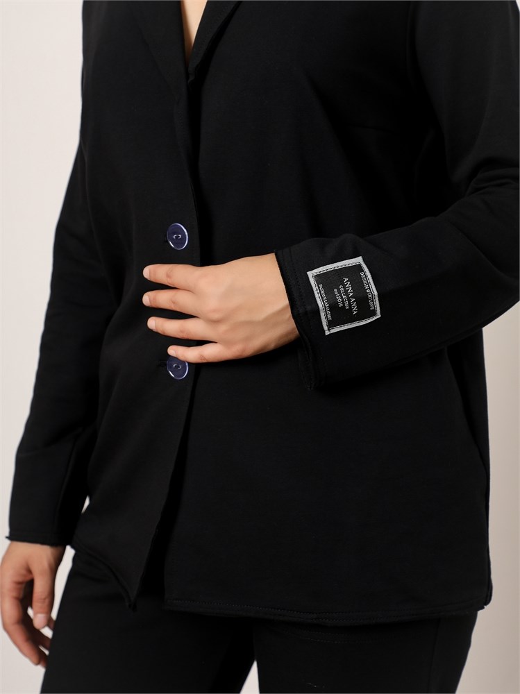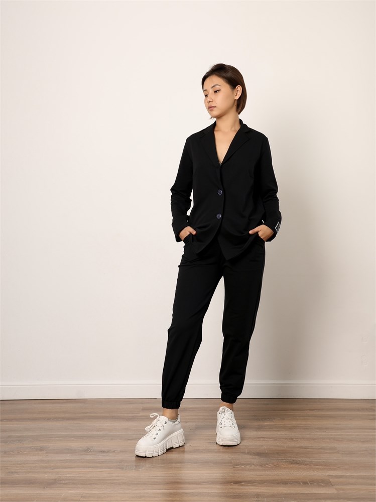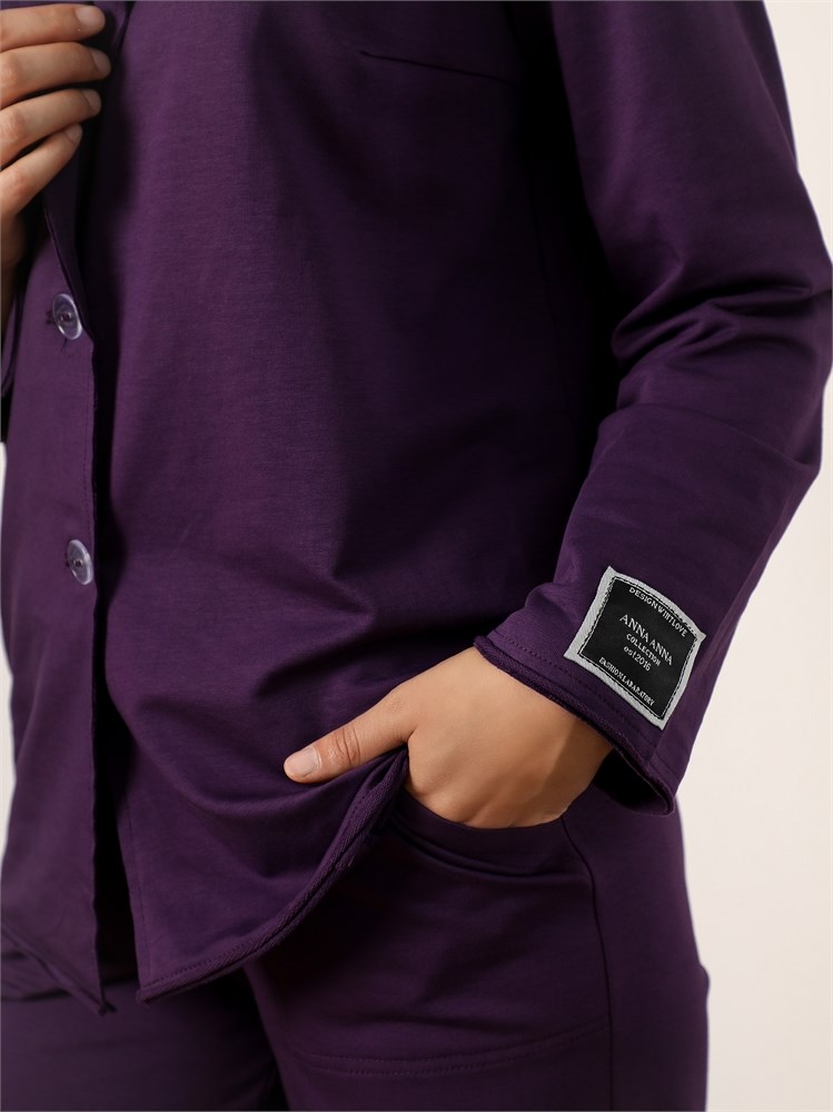 ***Қайырмалы жағалы трикотажды жакет. Қондырма жеңді, түйме тесігіне бекітілген. Ұзындығы бөксеге дейін