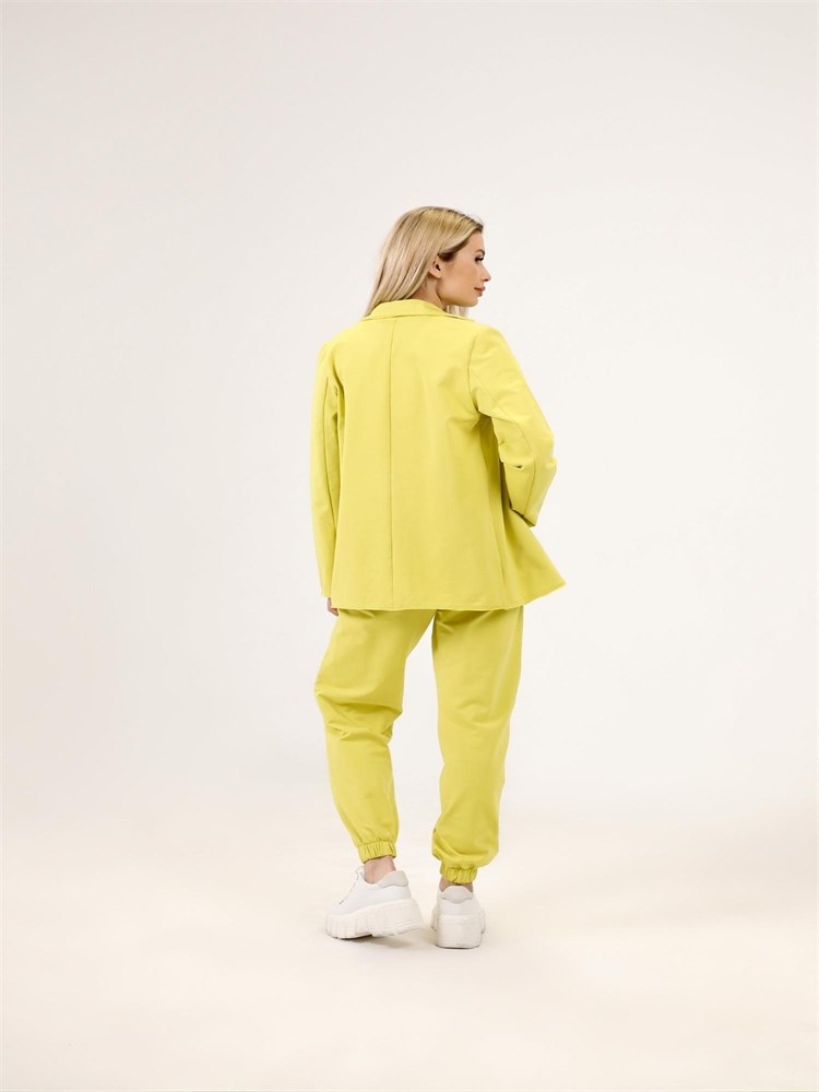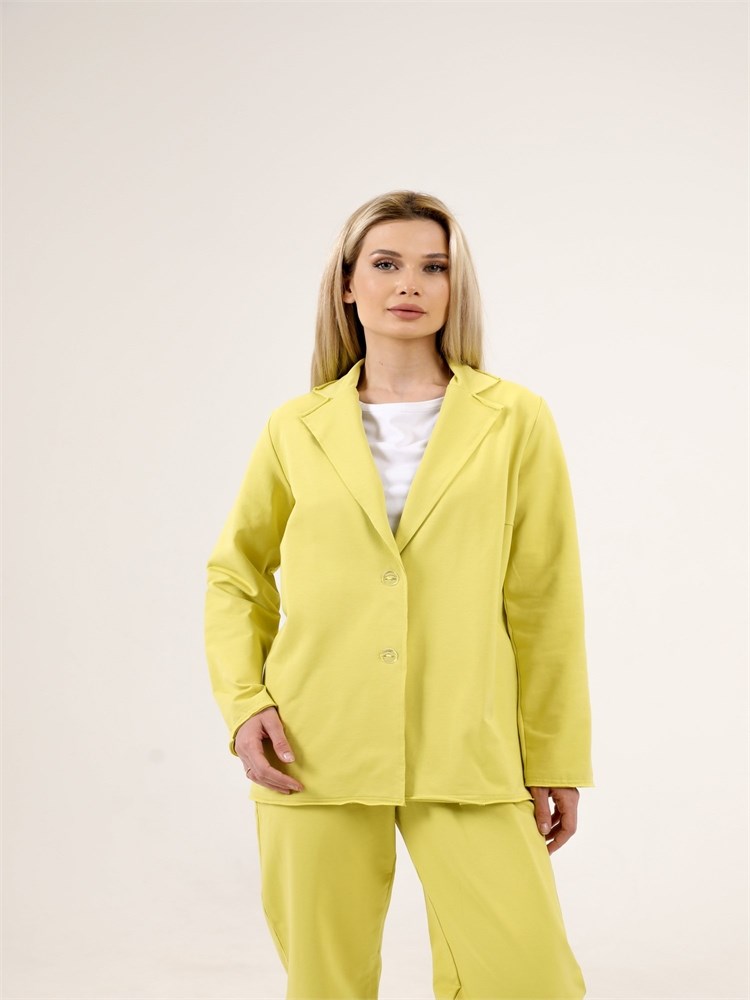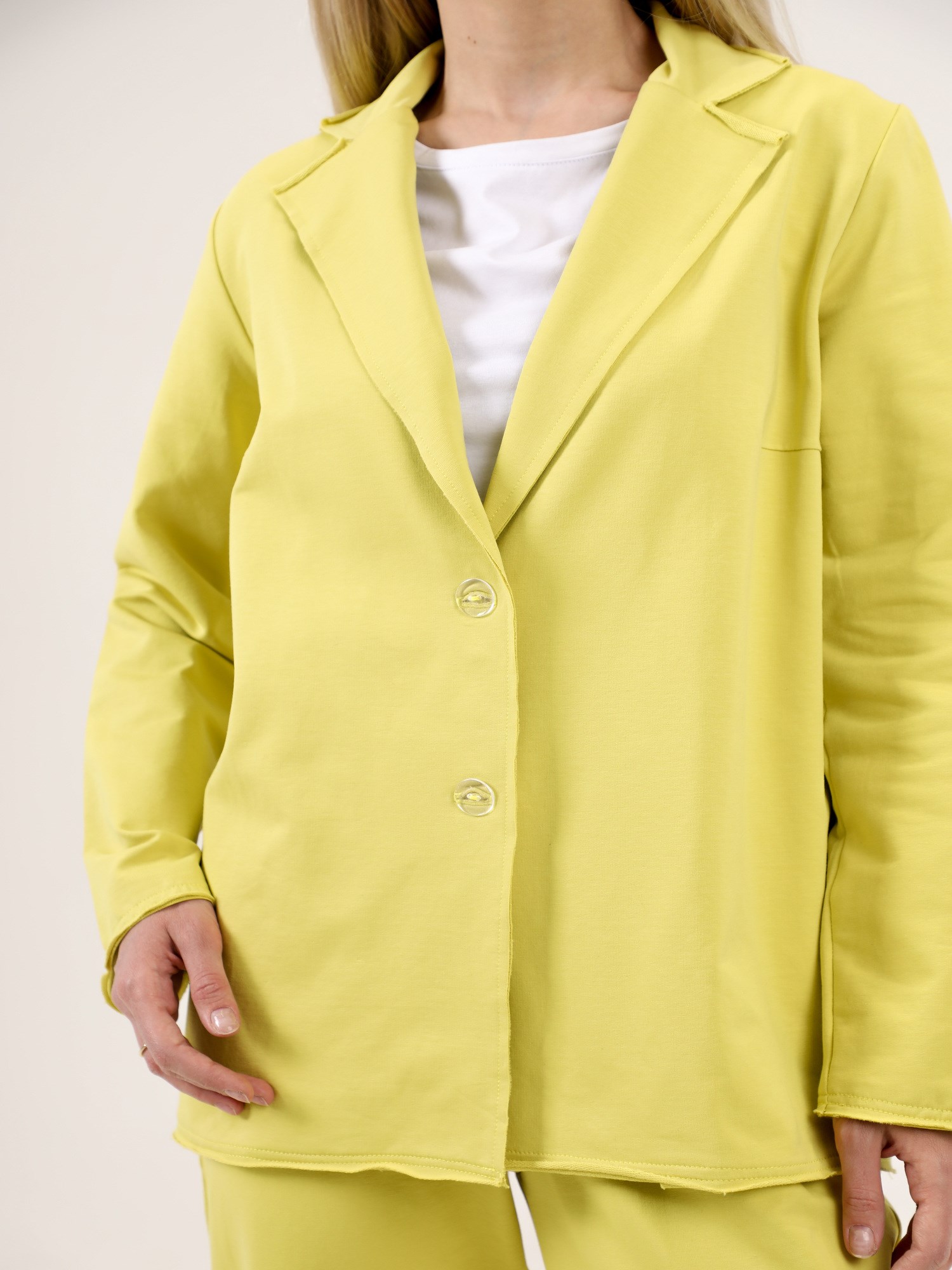 Жакет с отложным воротником и втачным рукавом. Застежка на пуговицах, длина до бедер.
